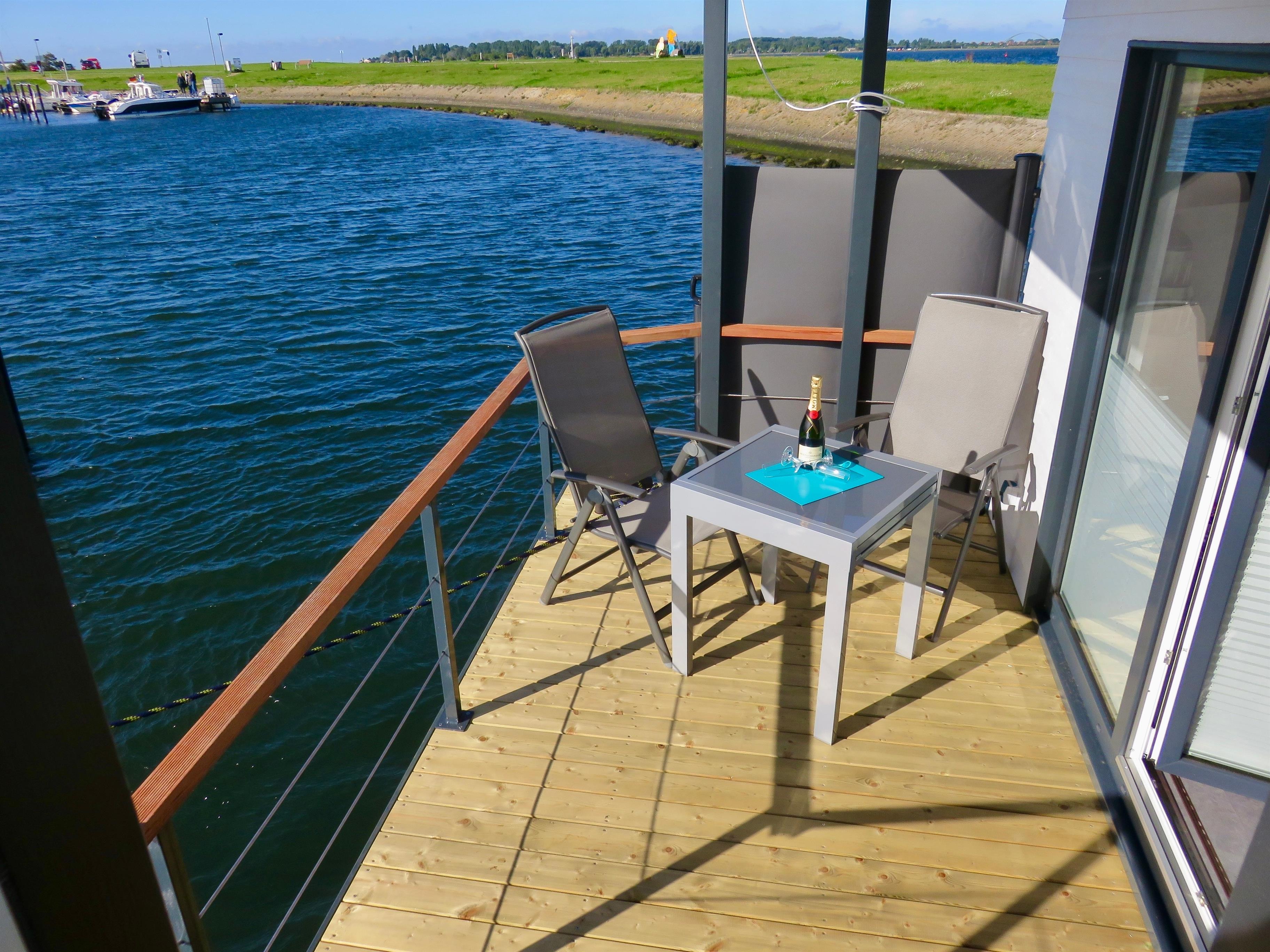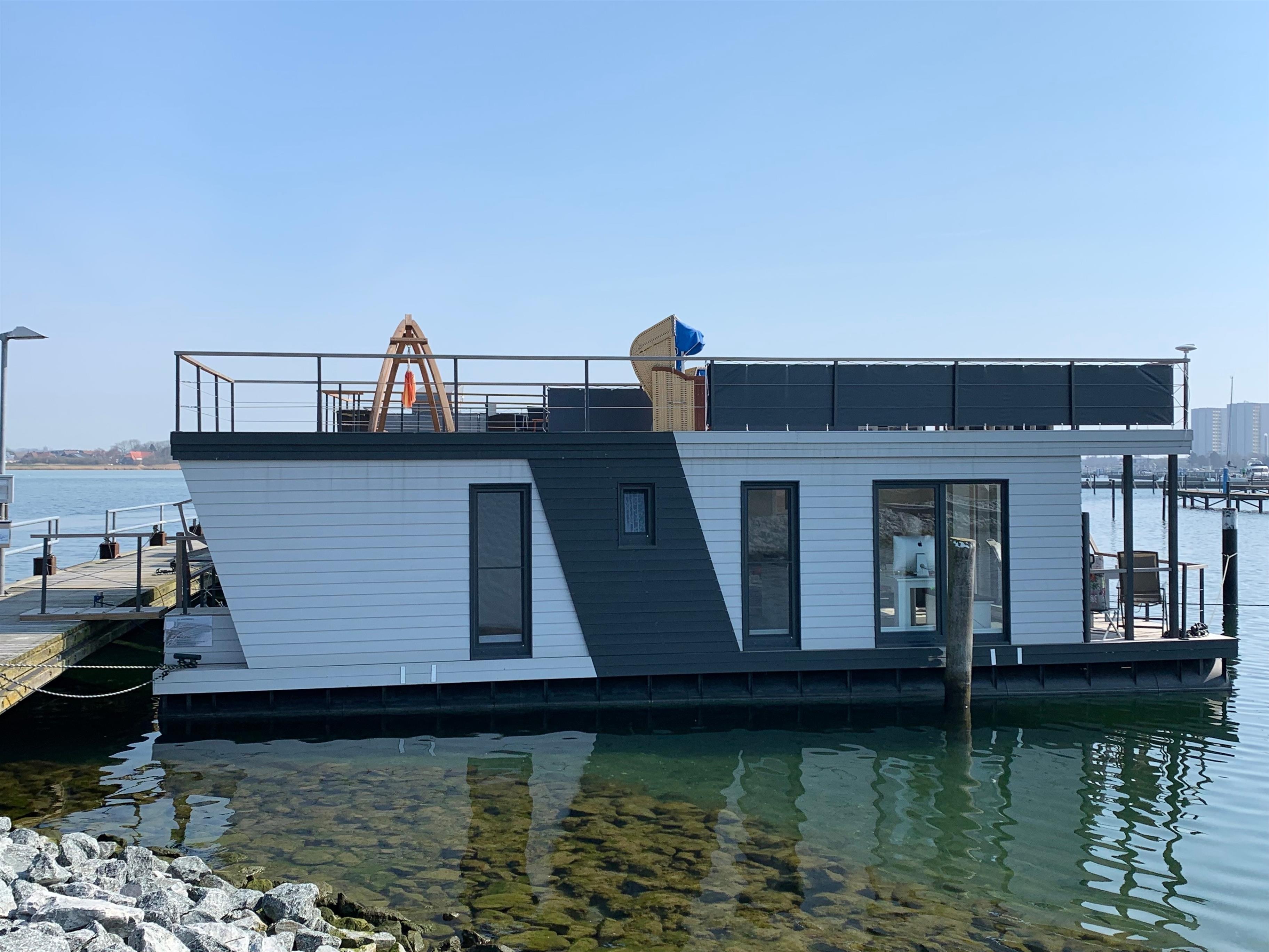 Erleben Sie ein charmantes Hausboot in Fehmarn mit großzügiger Dachterrasse und direktem Zugang zum Strand.