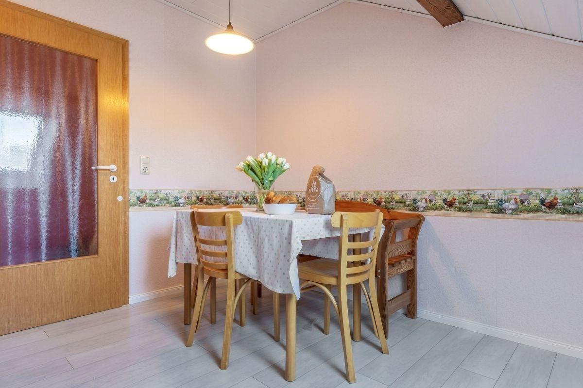 In der Küche befindet sich neben der Einbauküche inclusive Herd, Backofen, Kühlschrank mit Gefrierfach, Geschirrspülmaschine und diverser Kleinstgeräte auch eine Sitzecke für gemeinsame Mahlzeiten.