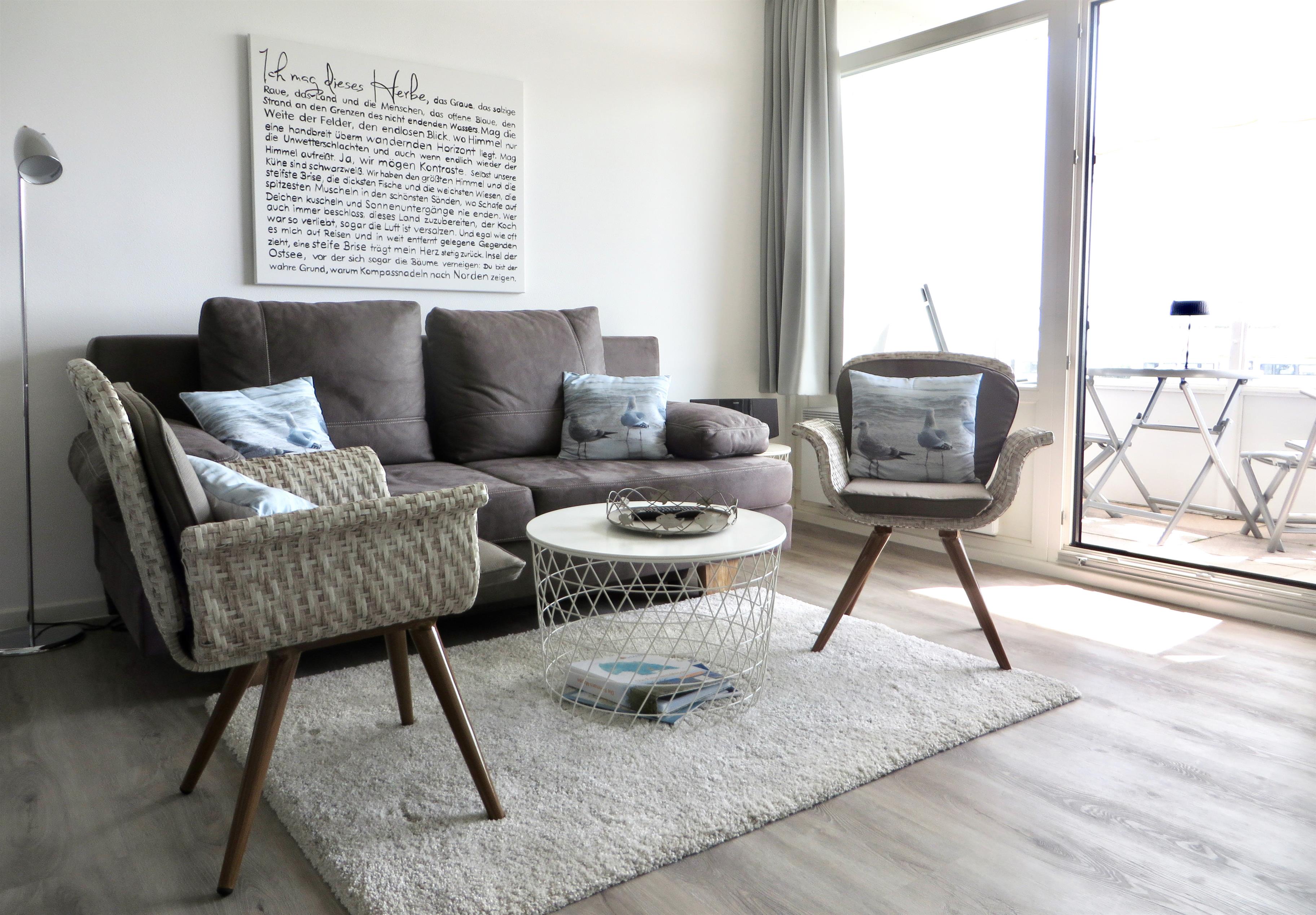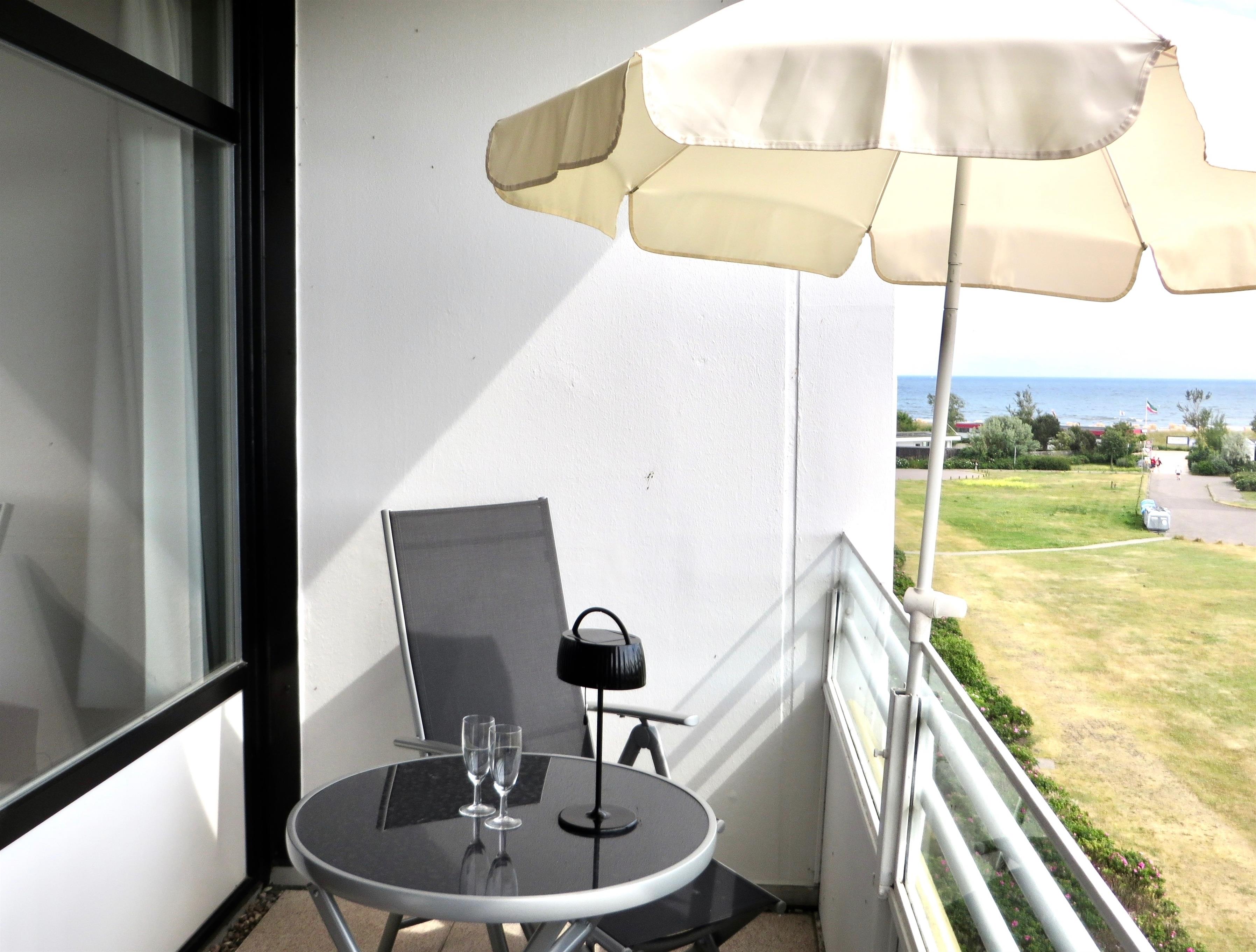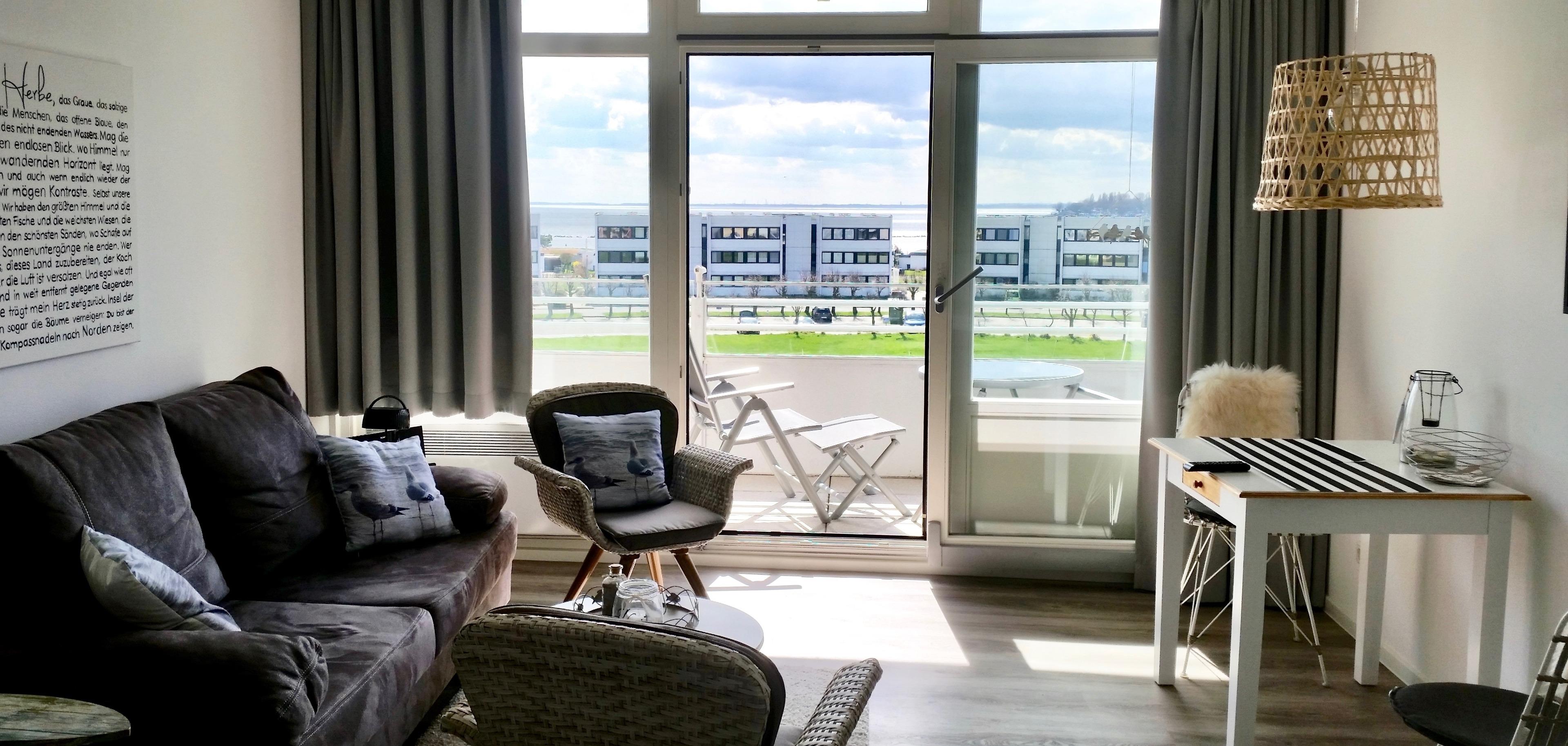 Stylische Ferienwohnung "Strandbude" am Südstrand Fehmarn mit Balkon und Meerblick, ideal für bis zu 3 Personen.