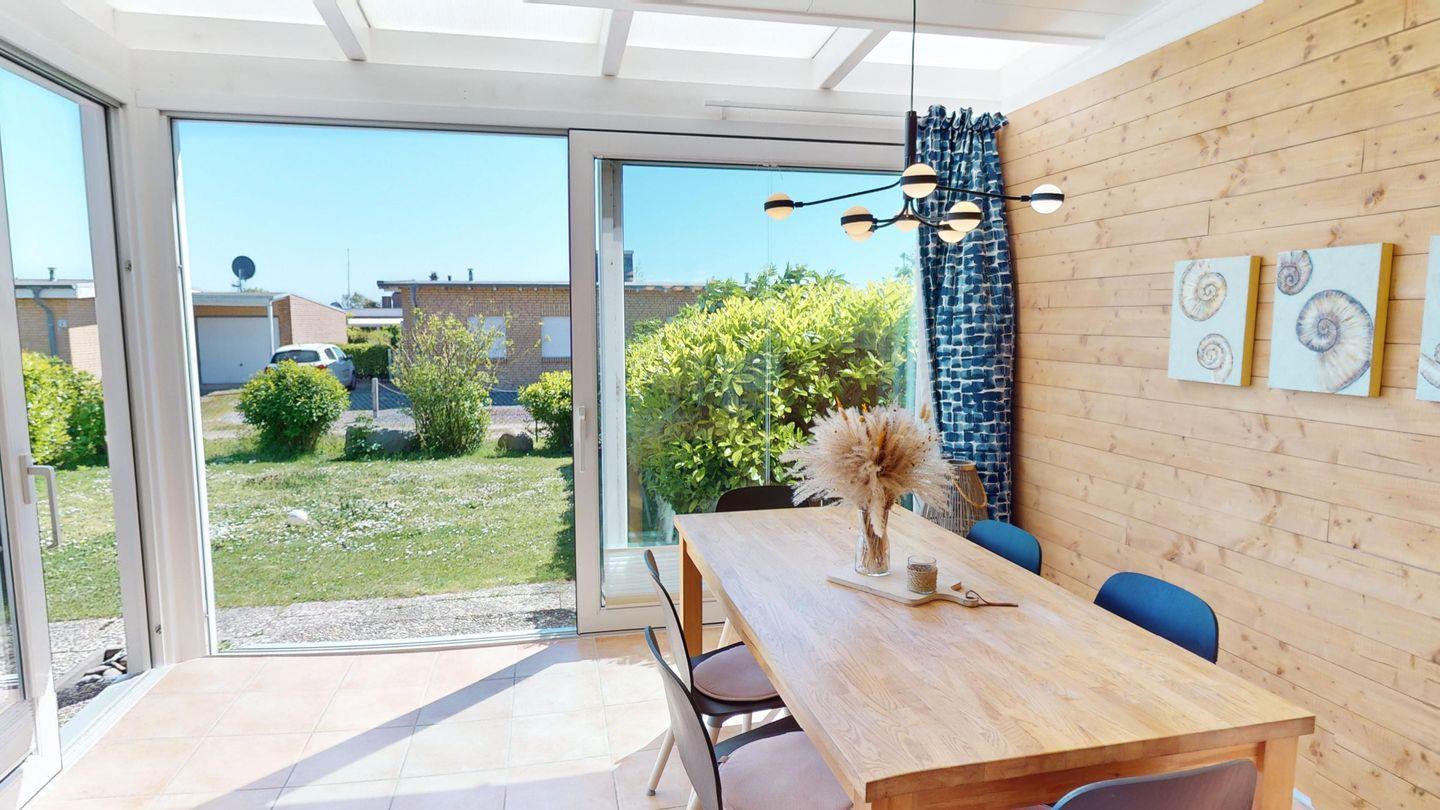Im gemütlichen Wohnzimmer mit Kamin und dem angrenzenden Wintergarten-Essbereich genießen Sie selbst kühlere Tage in wohliger Atmosphäre. Die voll ausgestattete Wohnküche bietet alles, was Sie für entspannte Urlaubstage brauchen. Zwei Schlafzimmer – eines mit Doppelbett, eines mit Etagenbett – sorgen für erholsamen Schlaf. Ein modernes Duschbad rundet das Raumangebot ab.