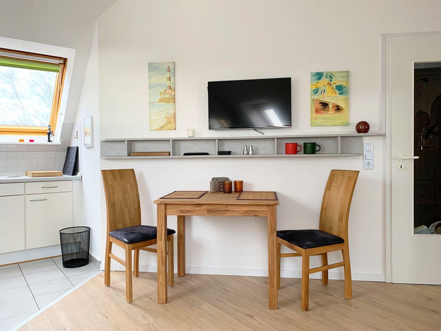 Genießen Sie den traumhaften Ausblick auf die Bucht vor Lemkenhafen – mit dem Flügger Leuchtturm am Horizont – und lassen Sie sich vom Spiel des Lichts über dem Wasser verzaubern. Die Wohnung überzeugt mit einem hellen Wohn- und Essbereich, einem gemütlichen Kamin für stimmungsvolle Abende und einer modernen, voll ausgestatteten Küche. Das komfortable Doppelbett ist clever um die Ecke platziert – so genießen Sie Privatsphäre trotz offenem Grundriss. Das moderne Duschbad rundet das Wohlfühlambiente ab.