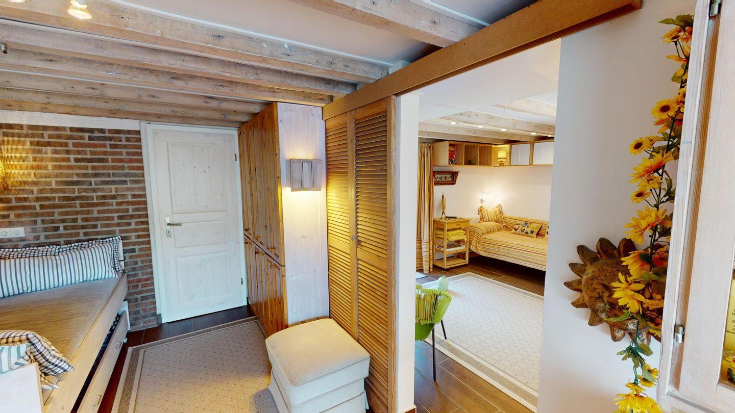Im Erdgeschoss befinden sich zwei ineinander übergehende Schlafräume mit Schiebetür und drei Einzelbetten, einem Fernseher sowie ein Gäste-WC. Hier befindet sich auch der Zugang zur Westterrasse und zum Garten. Über die Außentreppe gelangen Sie in das Obergeschoss, wo sich ein weiteres Schlafzimmer mit einem Doppelbett, die Küche, der Essbereich, das Wohnzimmer und das Duschbad befinden.