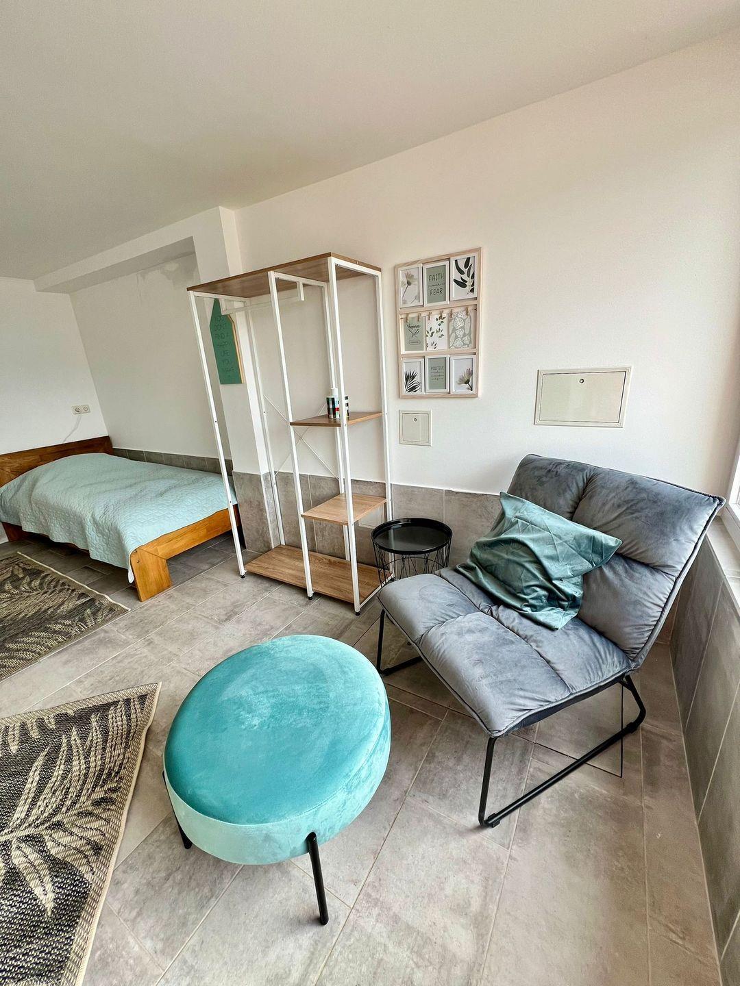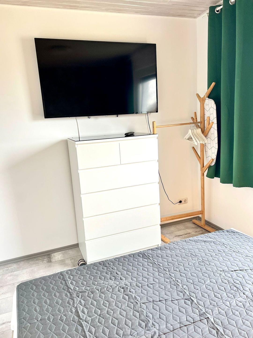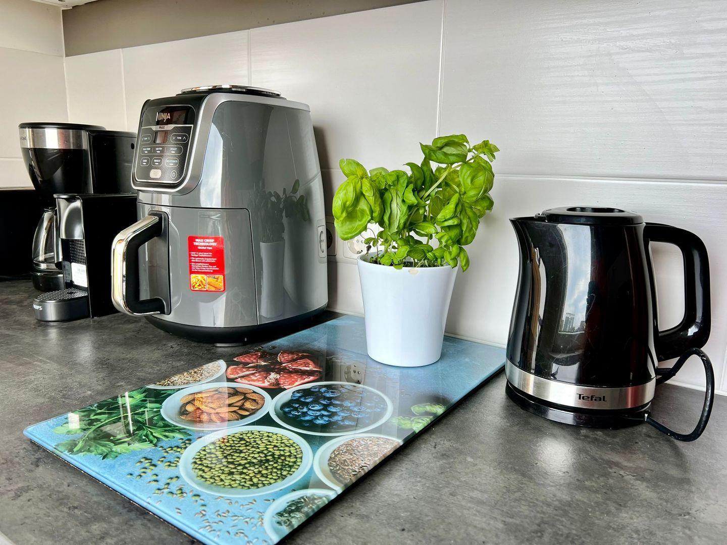 Über die Außentreppe gelangen Sie ins Obergeschoss, wo Sie ein weiteres Schlafzimmer mit Doppelbett, eine voll ausgestattete Küche, ein gemütlicher Essbereich, das Wohnzimmer sowie ein modernes Duschbad erwarten. Für die schnelle, fettarme Küche steht Ihnen zudem eine Heißluftfritteuse zur Verfügung.