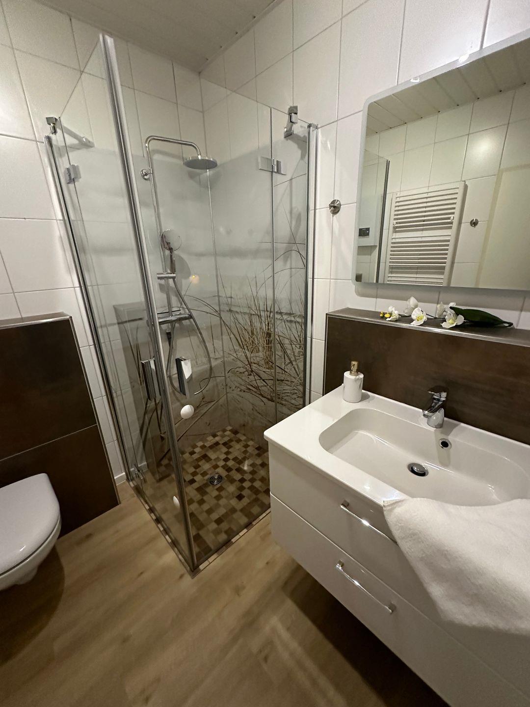 Weiterhin finden Sie ein Schlafzimmer mit einem Doppelbett sowie ein modernes und gemütliches Duschbad.