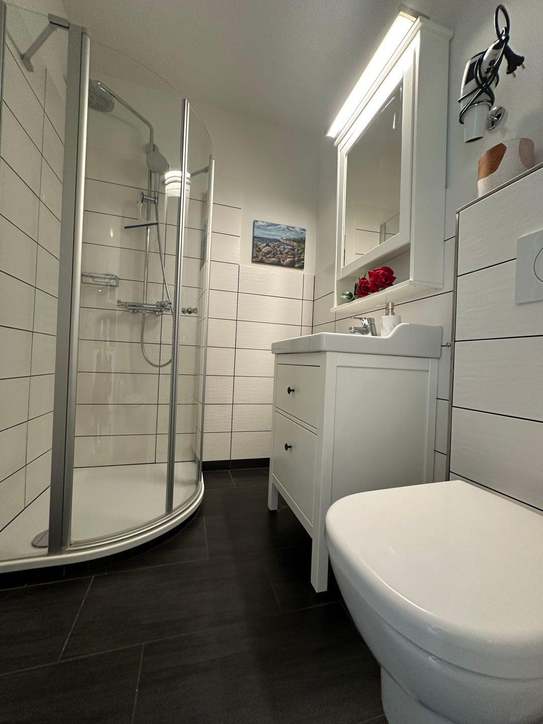 Dusche, Waschbecken, Spiegel, gute Beleuchtung, WC, Regal, Fön