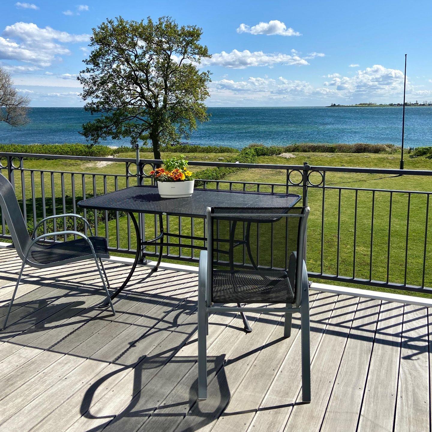 Spektakulärer Meerblick von der zum Naturstrand und dem Fehmarnsund ausgerichteten Wohnung mit großer Terrasse.