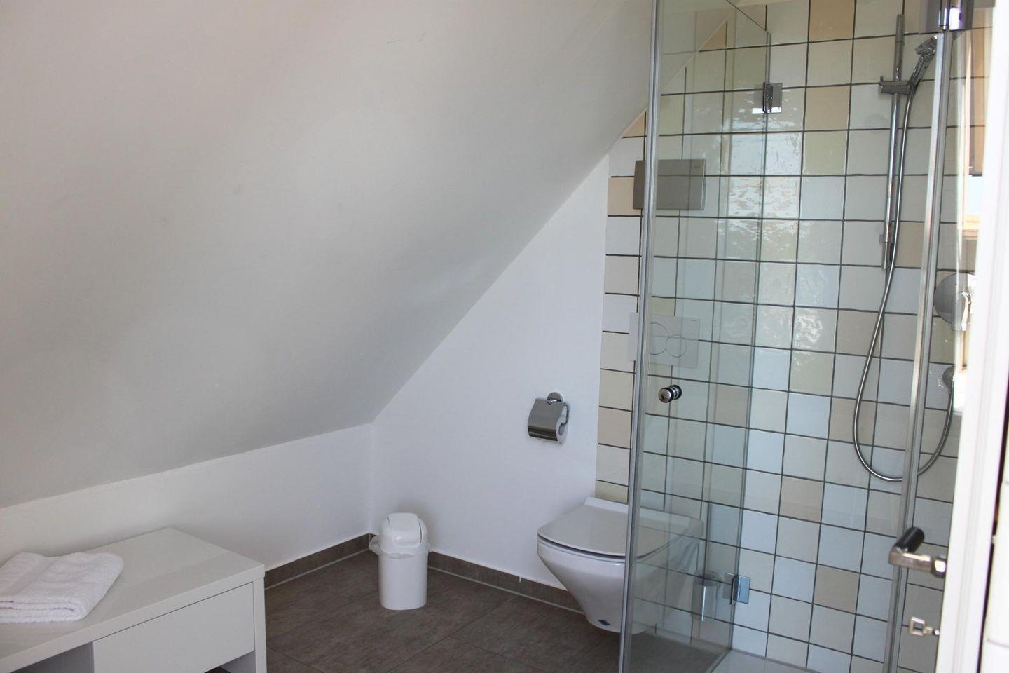 Das angrenzende kleine Badezimmer mit großem Fenster bietet eine geräumige, bodengleiche Dusche mit hochwertigen Glastüren.