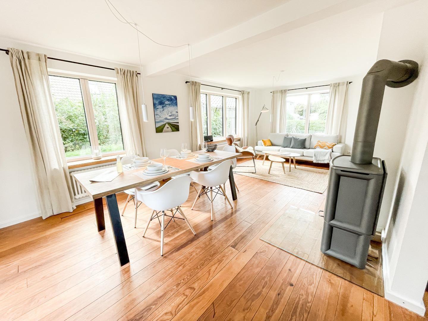 In der Küche findet Ihr alles, was Ihr zum Kochen und Backen benötigt. Der Esstisch ist groß genug für Familie und Freunde und im Wohnzimmer lassen sich vor dem Kamin gemütliche Stunden verbringen. Vom Esszimmer aus gelangen Sie direkt auf die große Terrasse mit Gasgrill und weiter in den Garten. Mit der stimmungsvollen Ambientebeleuchtung klingt der Abend nach einem schönen Tag am Meer wunderbar aus.