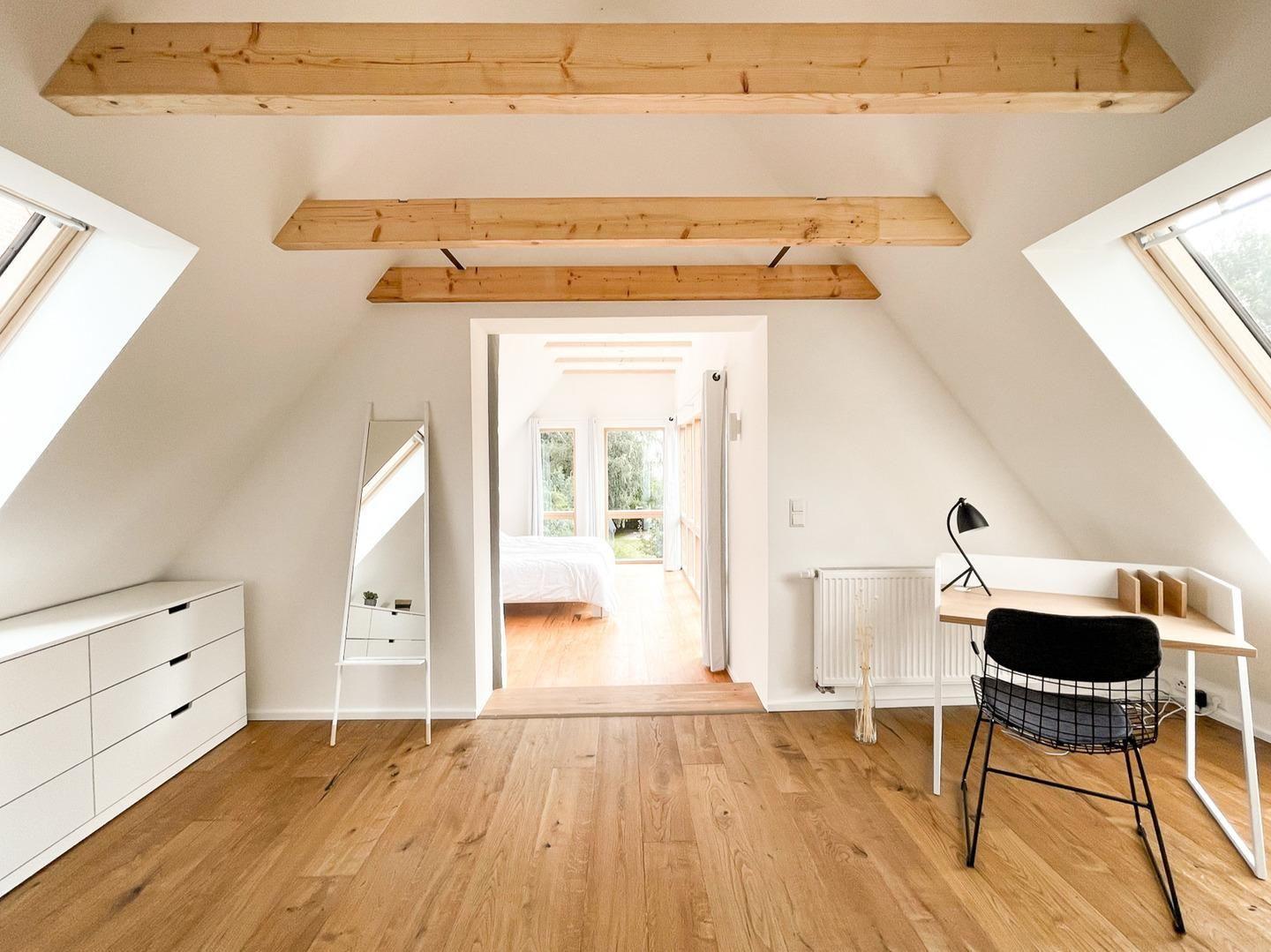 Die beiden Schlafzimmer mit Doppelbetten befinden sich im Obergeschoss, eines davon bietet einen einmaligen Panoramablick auf die Ostsee mit seinen wunderschönen Sonnenaufgängen. Die offene Raumgestaltung des Erdgeschosses setzt sich im Obergeschoss fort. Der Blick geht durch die Räume hinaus auf Meer und Garten.