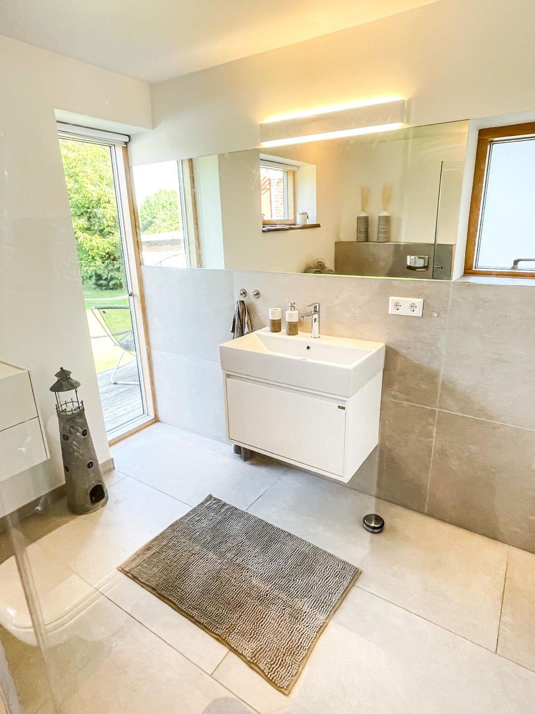 Das moderne, großzügige Bad ist ebenfalls im Erdgeschoss untergebracht und ist für diejenigen geschaffen, die sich gerne Zeit für sich nehmen. Vom Bad gibt es ebenfalls einen direkten Zugang auf die Terrasse.