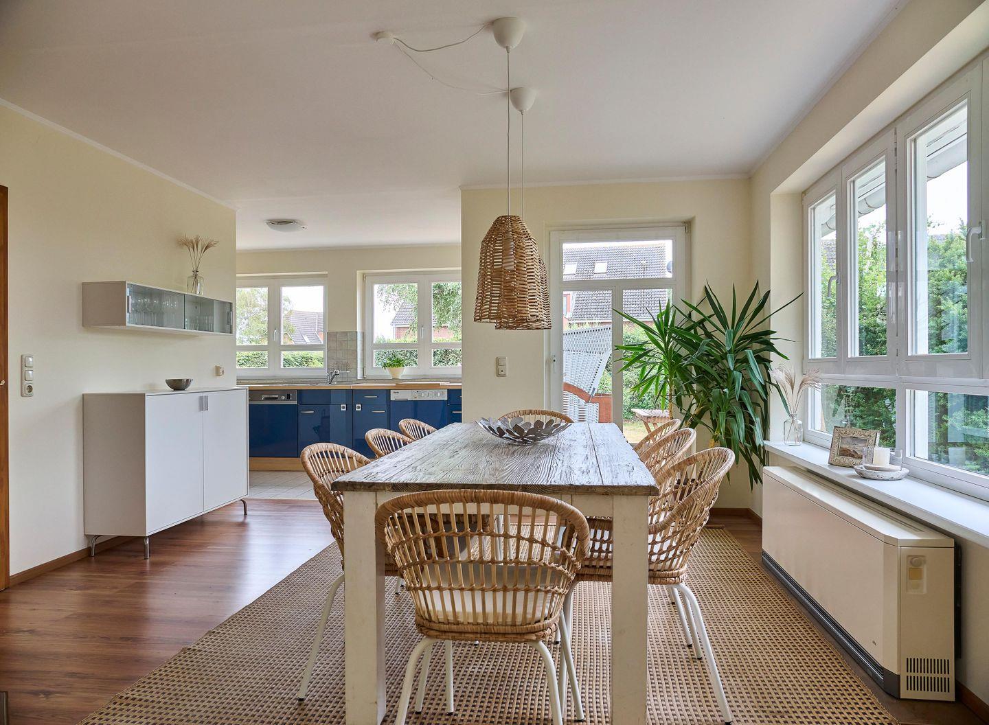 Unser modern maritimes Ferienhaus verfügt über kostenfreies Highspeed-Internet und Smart-TV. Drei behagliche Schlafzimmer mit komfortablen 1,8m Doppelbetten und eine Schlafcouch im Wohnzimmer bieten Platz für max. 8 Personen. In unserem eingezäunten 630 qm großen Garten können Kinder und Eure Vierbeiner unbesorgt toben und spielen. Die Küche ist ausgestattet mit Kühlschrank plus Gefrierfach, Cerankochfeld, Mikrowelle, Geschirrspüler, Waschmaschine mit Trockner, Wasserkocher, Nespresso- und Kaffeemaschine. Der großzügige, luftige Wohn-Essbereich mit Kamin lädt zu gemütlichen Kochabenden und ausgedehnten Spieleabenden ein. Zwei Badezimmer mit Walk-In-Duschen sowie zwei sonnige Terrassen mit Strandkorb und Grill runden das Angebot ab.