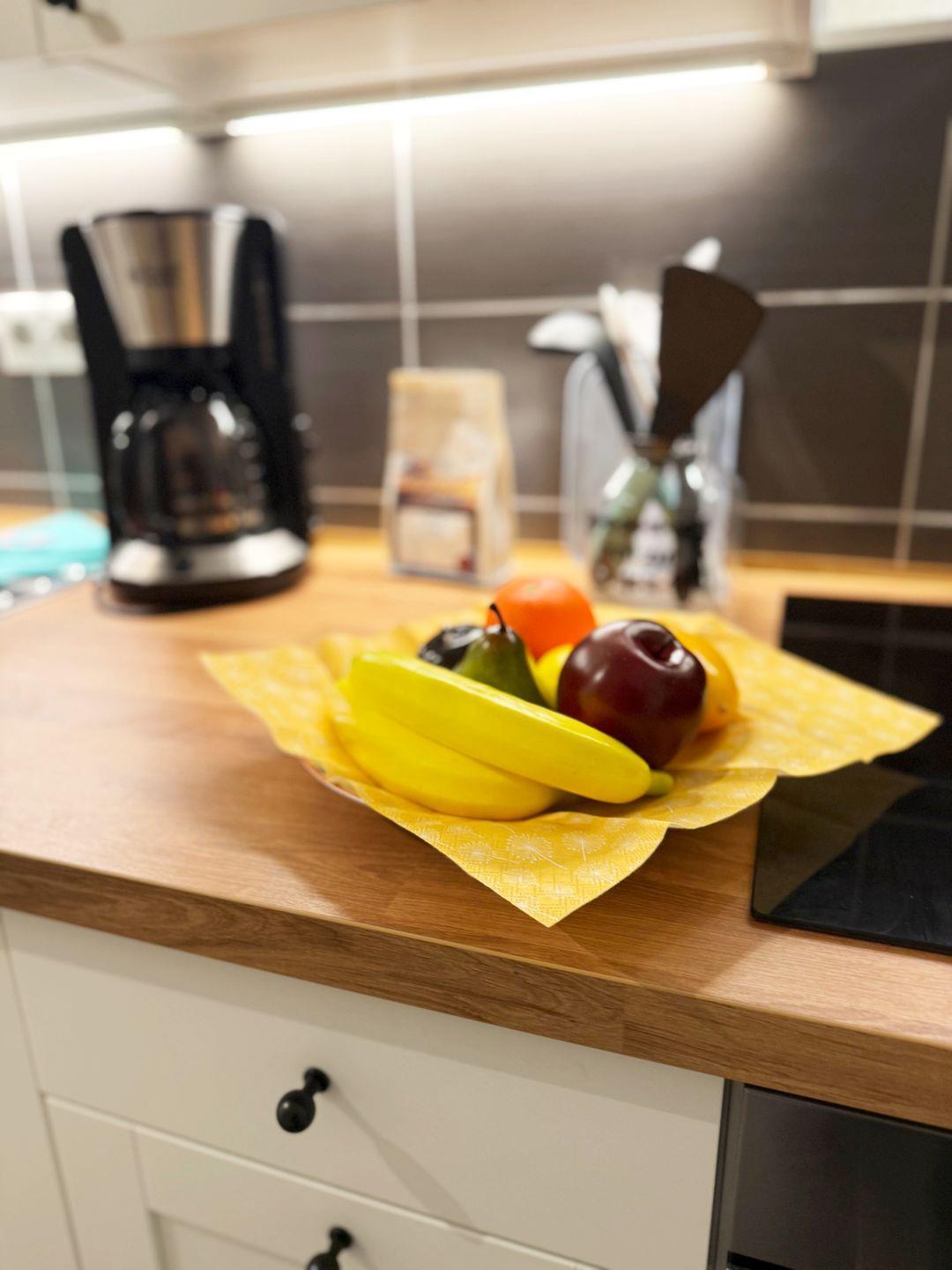 - 4 Induktionskochfelder, Backofen, Spülmaschine, Kühlschrank mit Gefrierkombination, Wasserkocher, Toaster, Filterkaffeemaschine, Geschirr & Kochutensilien