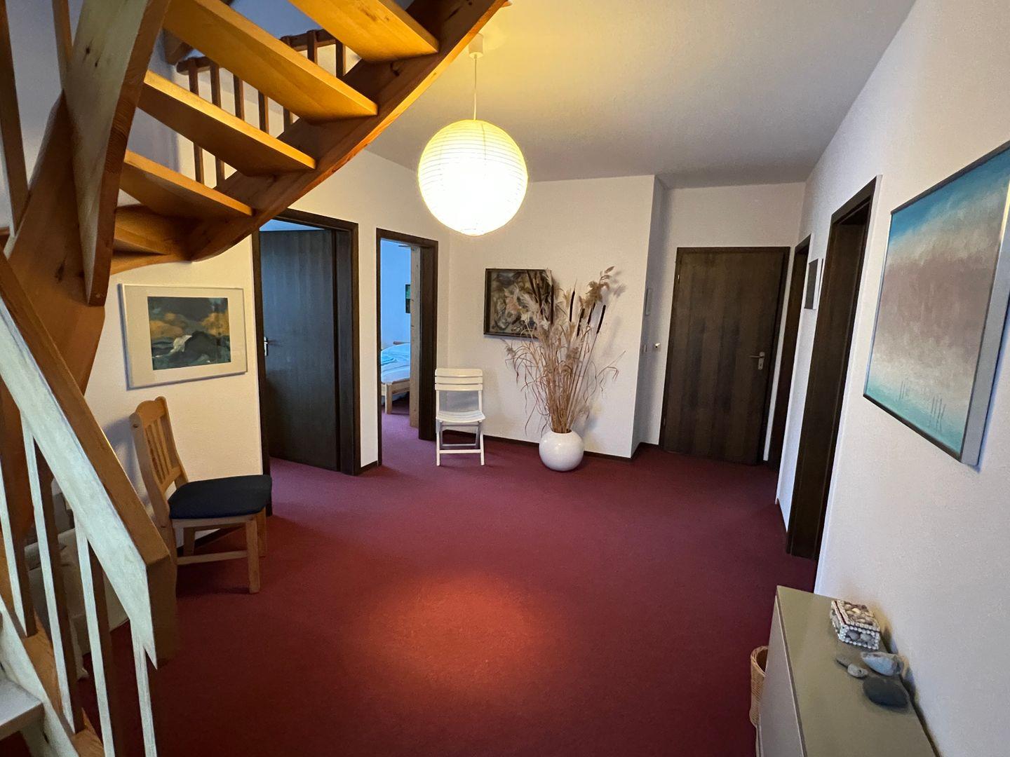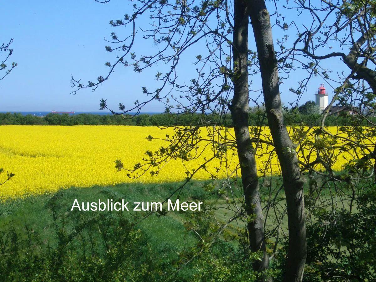 Im Obergeschoss liegt der lichtdurchflutete, offen gestaltete Wohnbereich. Die Küche und der Essbereich bieten einen wunderschönen Blick auf das Meer und den Leuchtturm. Beim Frühstück am großen Esstisch können sie den regen Schiffsverkehr durch den Fehmarn-Belt beobachten. Im Wohnbereich befinden sich ein großes Sofa und ein TV (32 Zoll) mit Satellitenanschluss. Von dem überdachten Südbalkon hat man einen schönen Blick in den Garten.