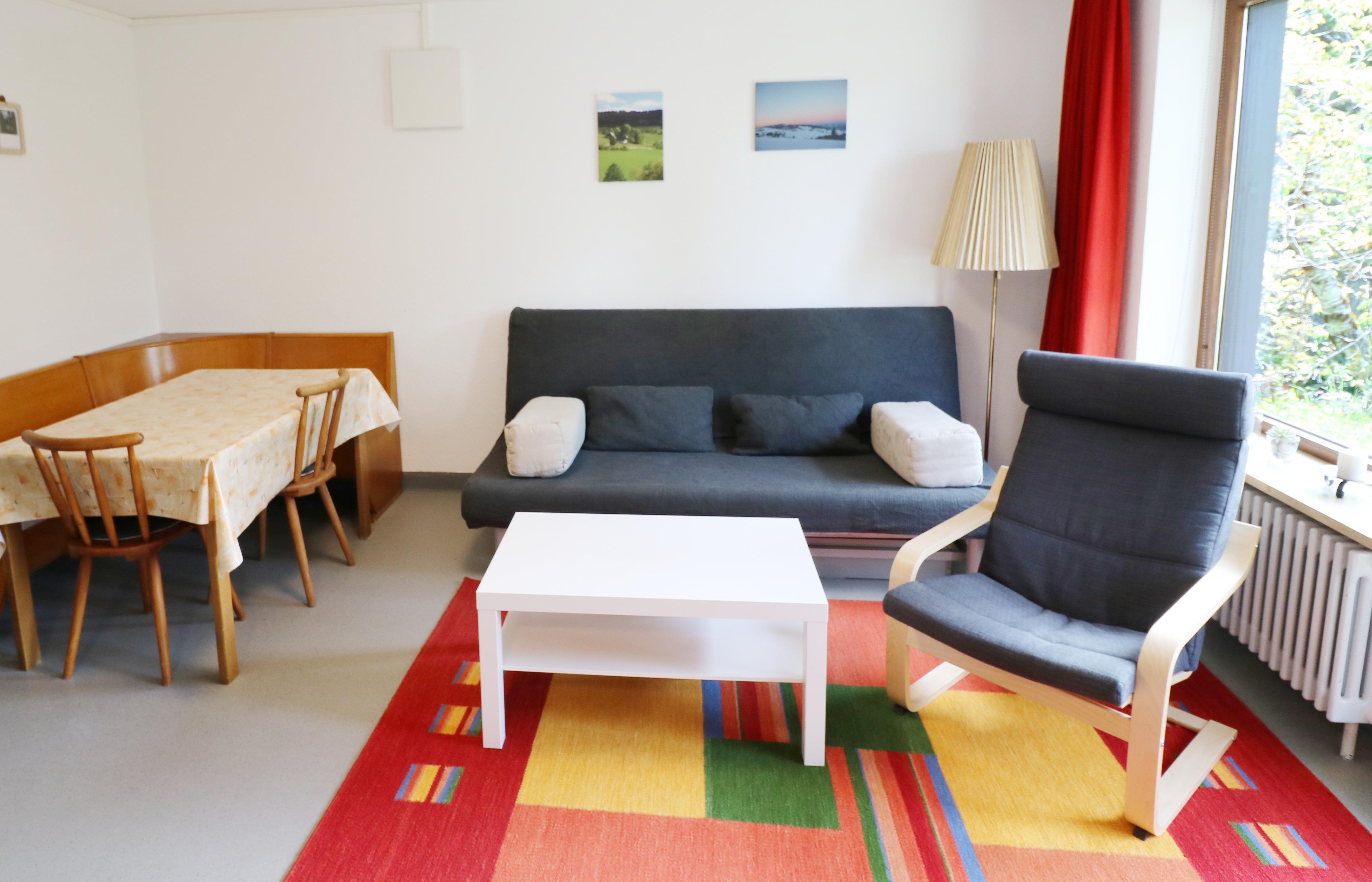 - Wohnzimmer mit Sitzecke, Schlafsofa (140x200) und TV