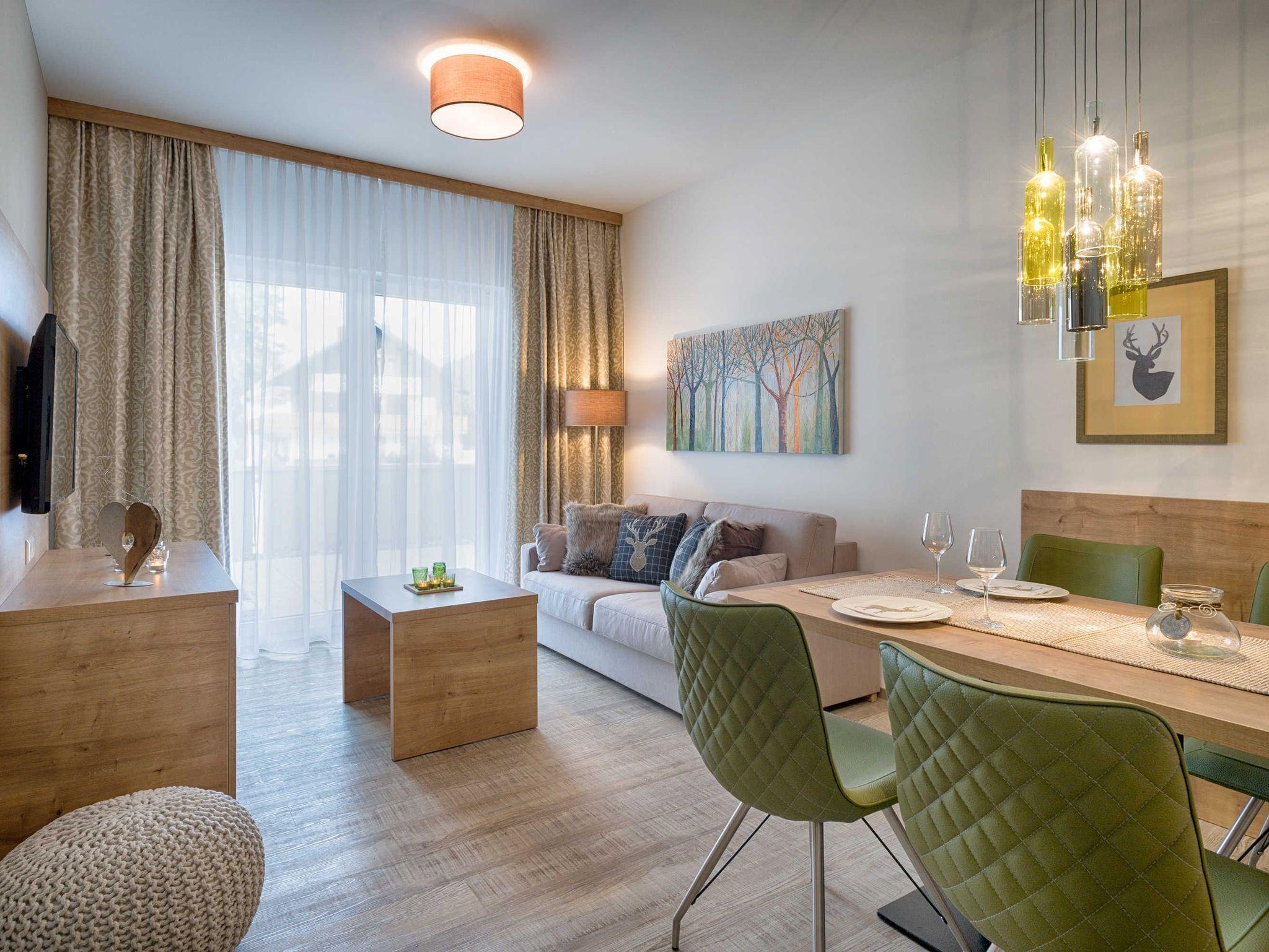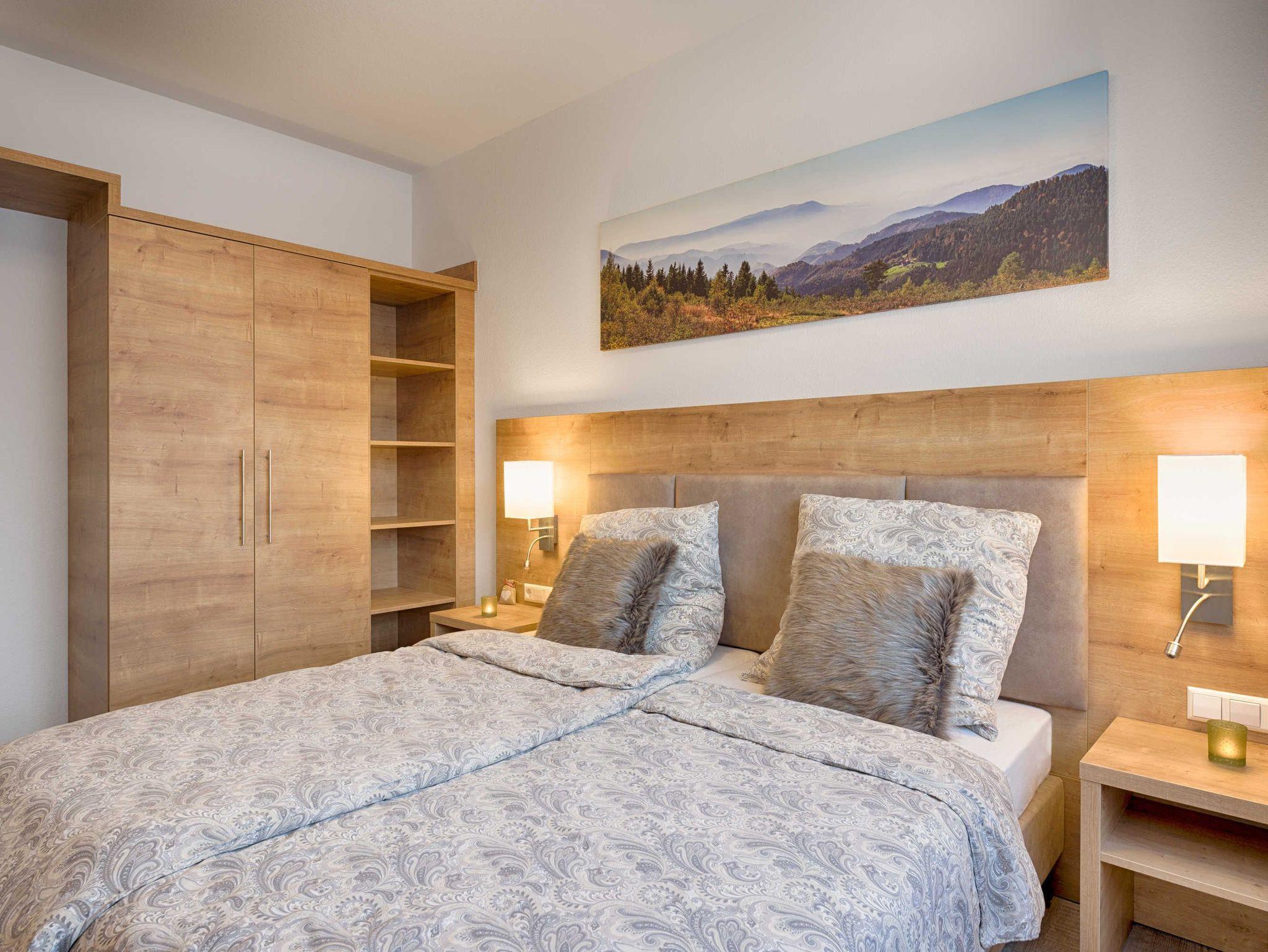Im Wohnraum befindet sich ein 43 Zoll LG Full-HD Smart-TV und ein hochwertiges Schlafsofa mit integrierter Matratze für zwei Personen, im Schlafzimmer ein Voglauer-Boxspringbett für weitere zwei Personen.