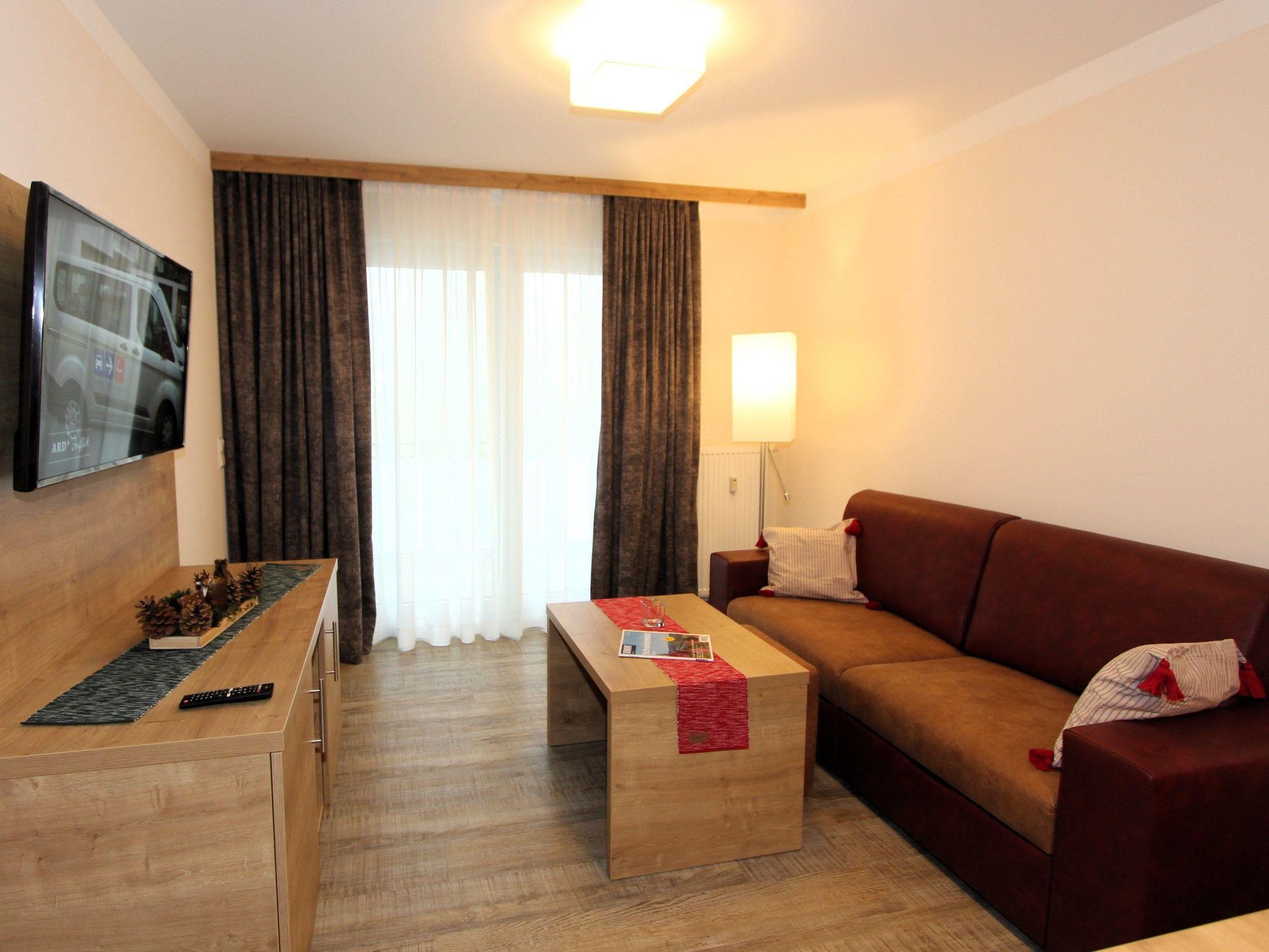 Das Appartement verfügt auf 47 m² über einen Wohnraum mit moderner, voll ausgestatteter Küchenzeile, Essplatz und Sitzecke, deren Couch sich unkompliziert in eine Schlafgelegenheit für zwei Personen umbauen lässt. Sowohl im Wohnraum als auch im Schlafzimmer mit Doppelbett gibt es ein SAT-TV-Gerät. Im Tageslichtbad mit der bodengleichen Dusche und der Whirlpoolwanne können Sie nach einem langen Tag auf Skiern oder einer ausgiebigen Wanderung wunderbar entspannen.