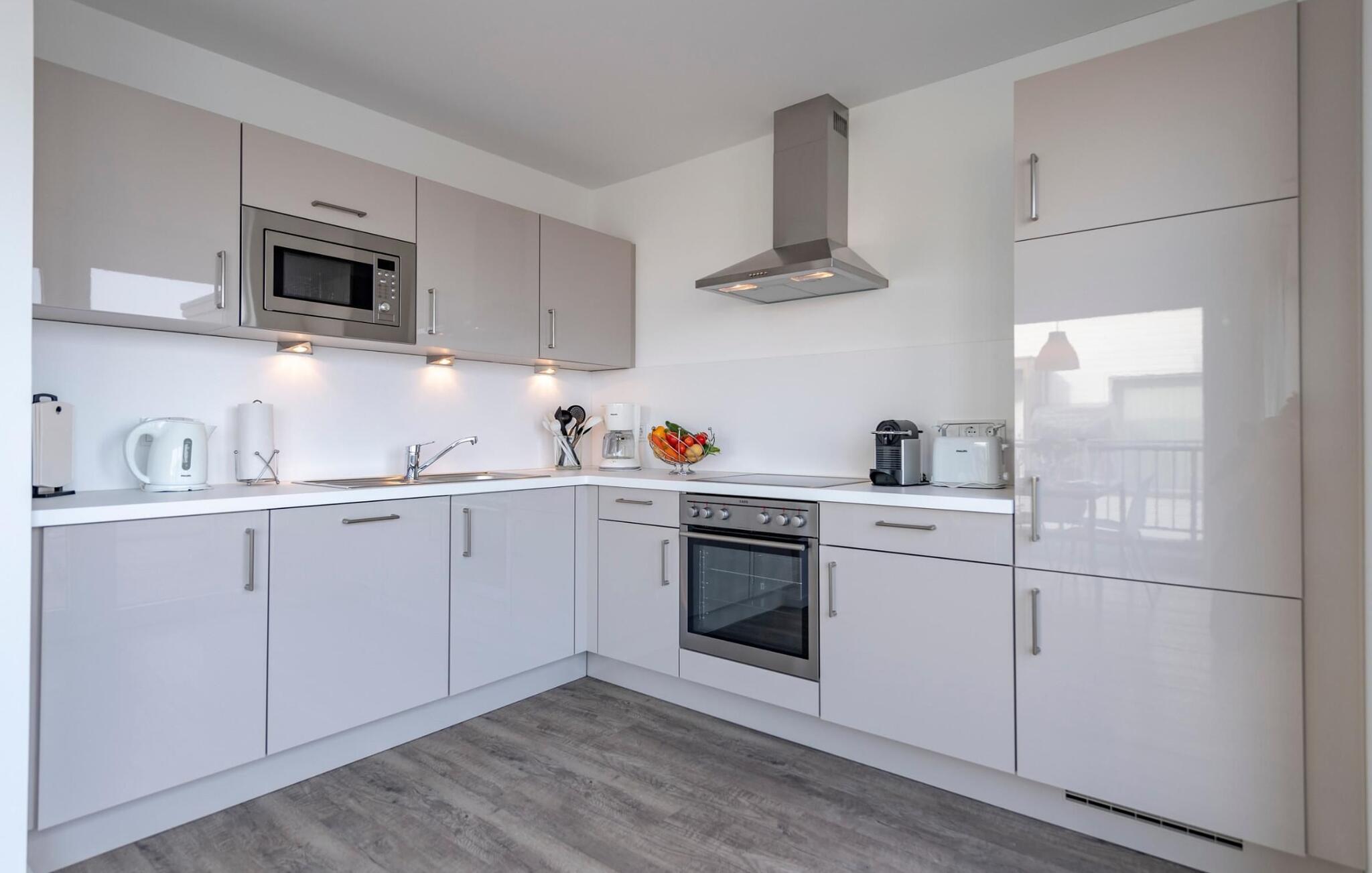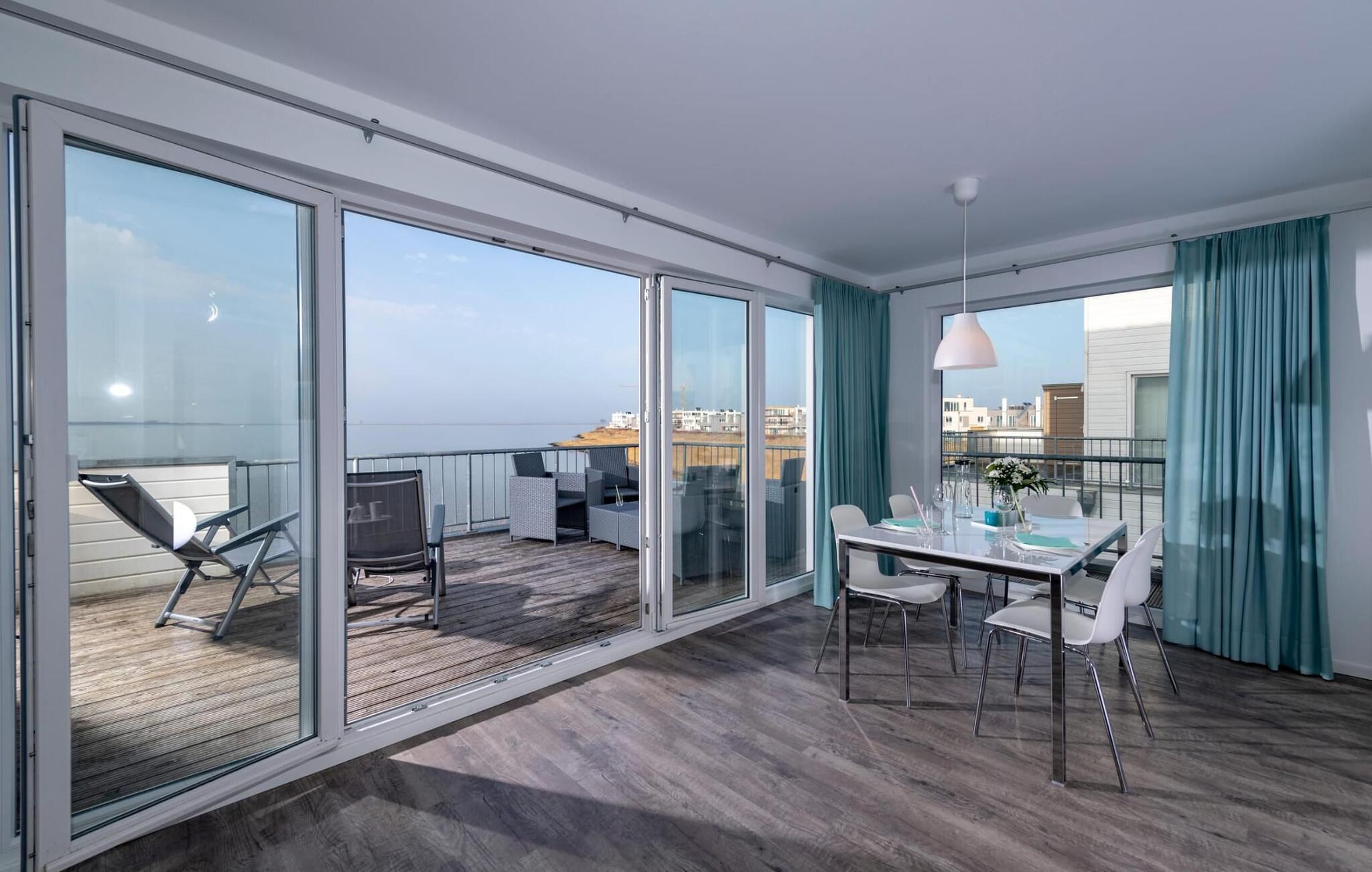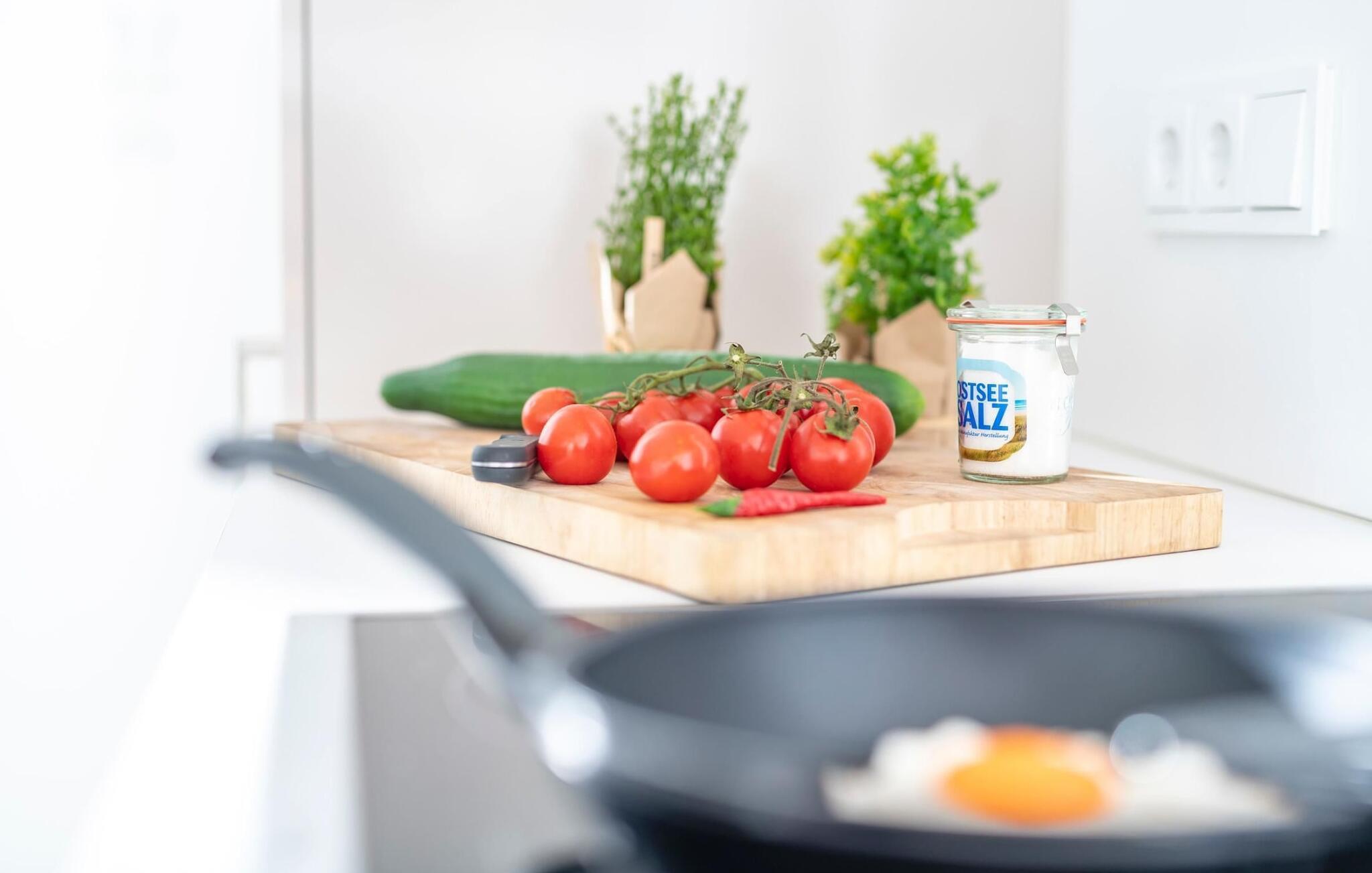 Lichtdurchflutet gestaltet sich der Wohn- /Essbereich des Ferienobjekts mit bodentiefen Fensterfronten zu den anliegenden Terrassen auf beiden Seiten. Traumhafte Aussichten eröffnen sich auf der an den Essbereich angrenzenden Terrasse mit Blick über die weite Schlei. Vorbeifahrende Segelschiffe sorgen während einer geselligen Grillrunde oder eines romantischen Candle-Light-Dinners für Unterhaltung. Im Urlaub ist Zeit für kreatives Kochen, die rundum ausgestattete Wohnküche lässt hierbei keine Wünsche offen. Frühstücken direkt am Meer, Urlaubsfeeling pur.