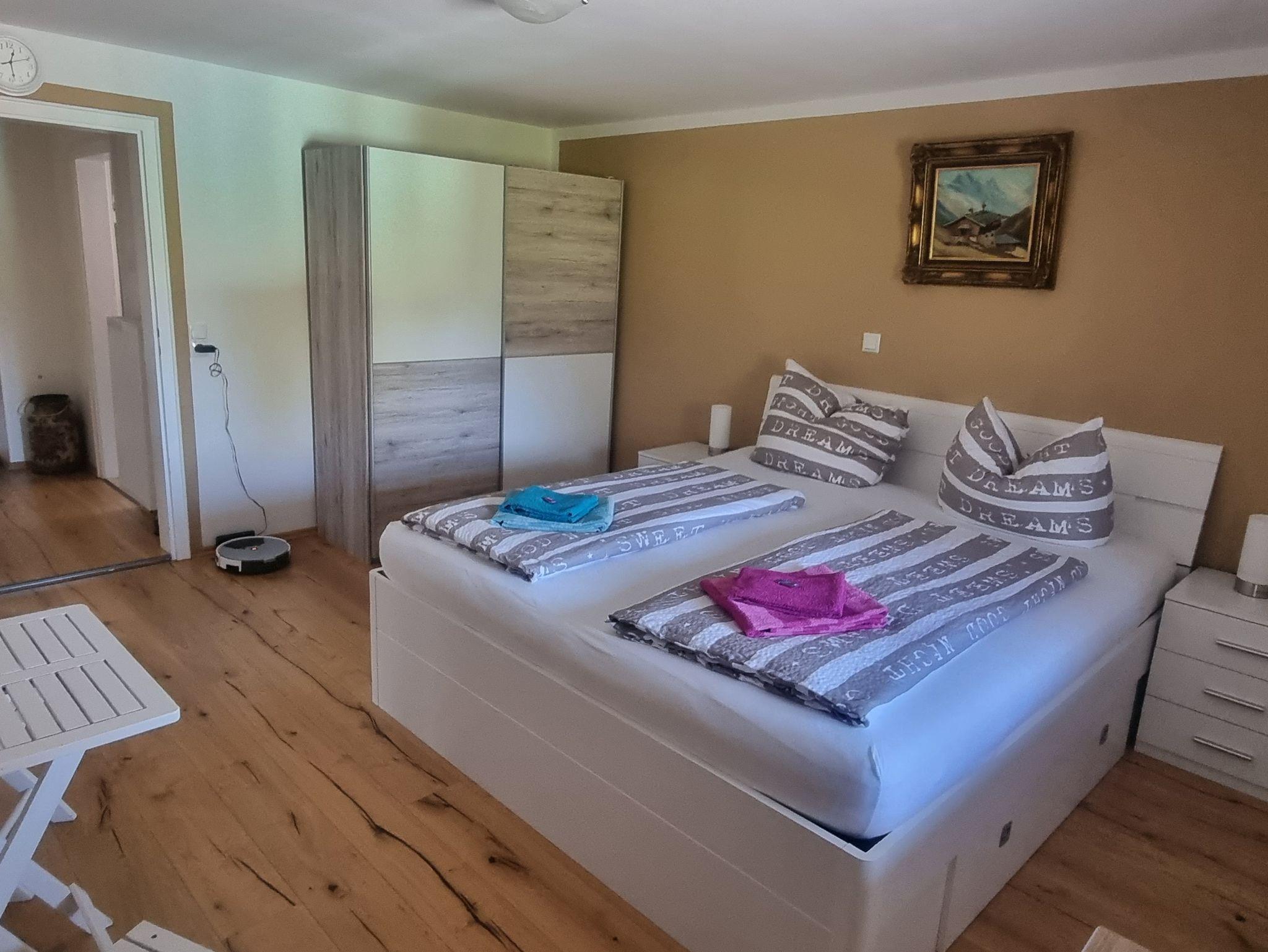 Die FeWo verfügt über 3 separate Schlafzimmer (24 qm/23 qm/16 qm) mit je einem Doppelbett. Das größte Zimmer verfügt über ein Bad en Suite mit Whirlpool und eigenem Zugang zur Sauna (gegen Gebühr, Handtücher für die Sauna müssen selbst mitgebracht werden). Den anderen Zimmern steht ein Duschbad zur Verfügung. Im mittelgroßen Zimmer lädt ein Südbalkon mit traumhaften Bergblick zum Erholen und Entspannen ein.