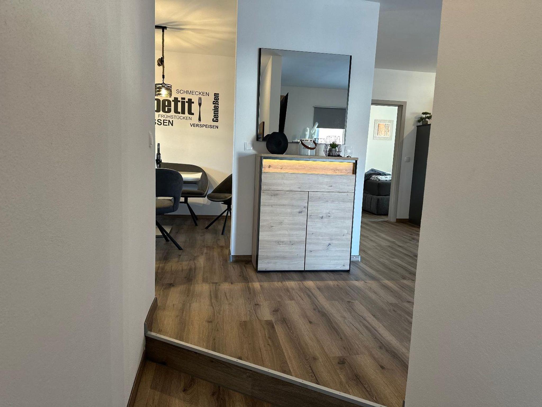 Unser Ferienhaus befindet sich in einer Doppelhaushälfte im 1. Stock (im unteren Stockwerk befinden sich Garagen) mit schönen Terrassen, kleinem Garten und Carport. Es ist zur alleinigen Nutzung und verfügt über: