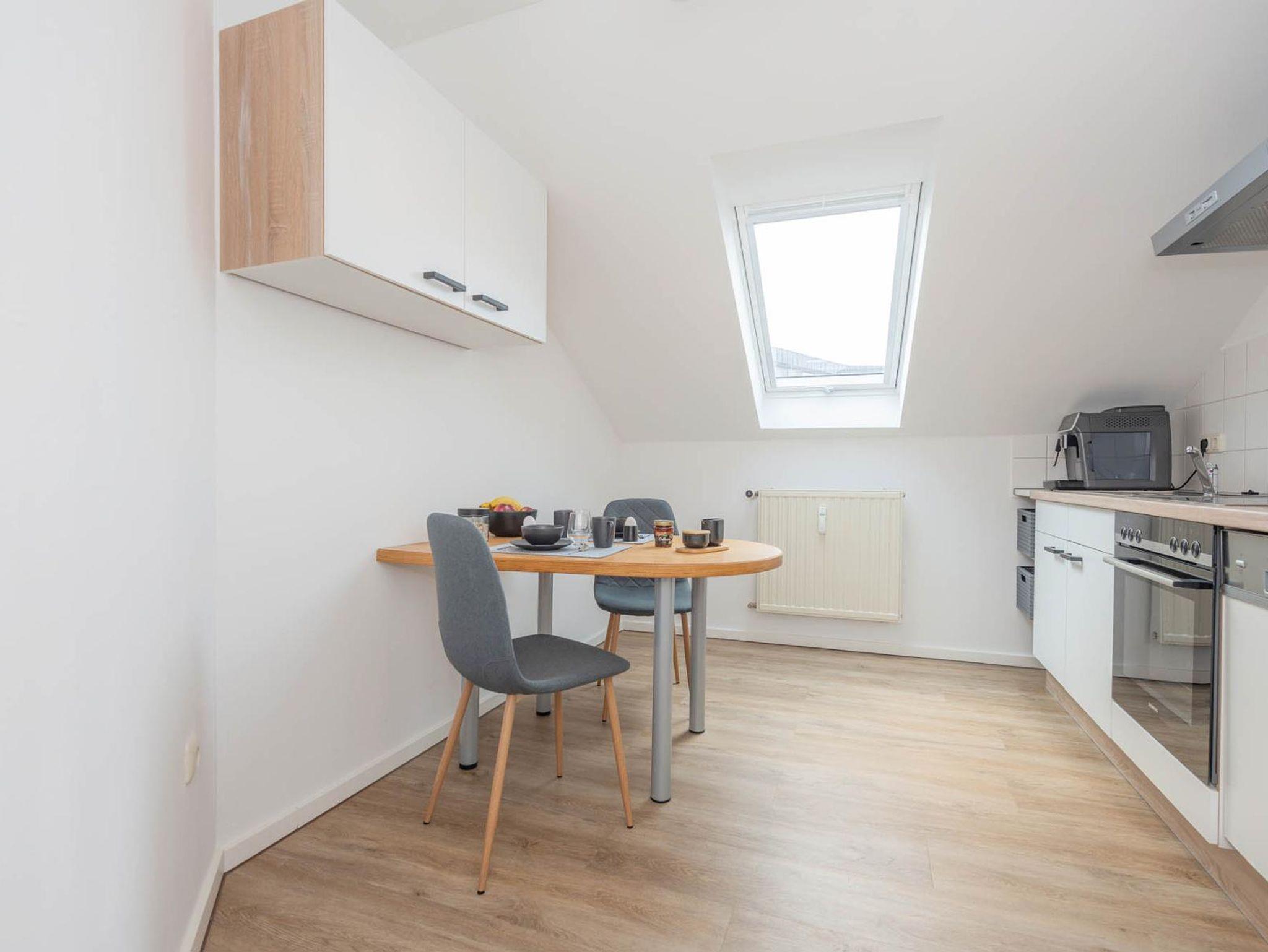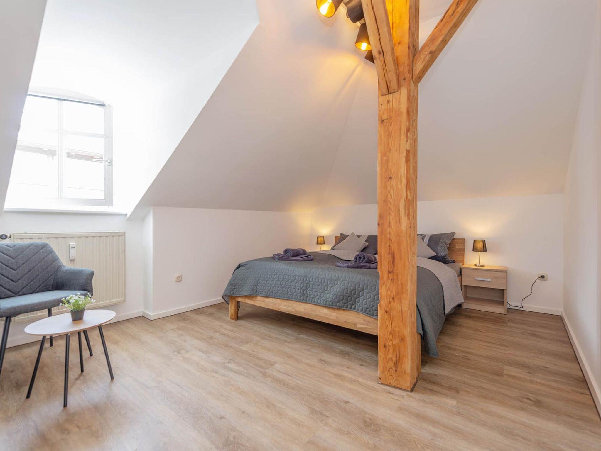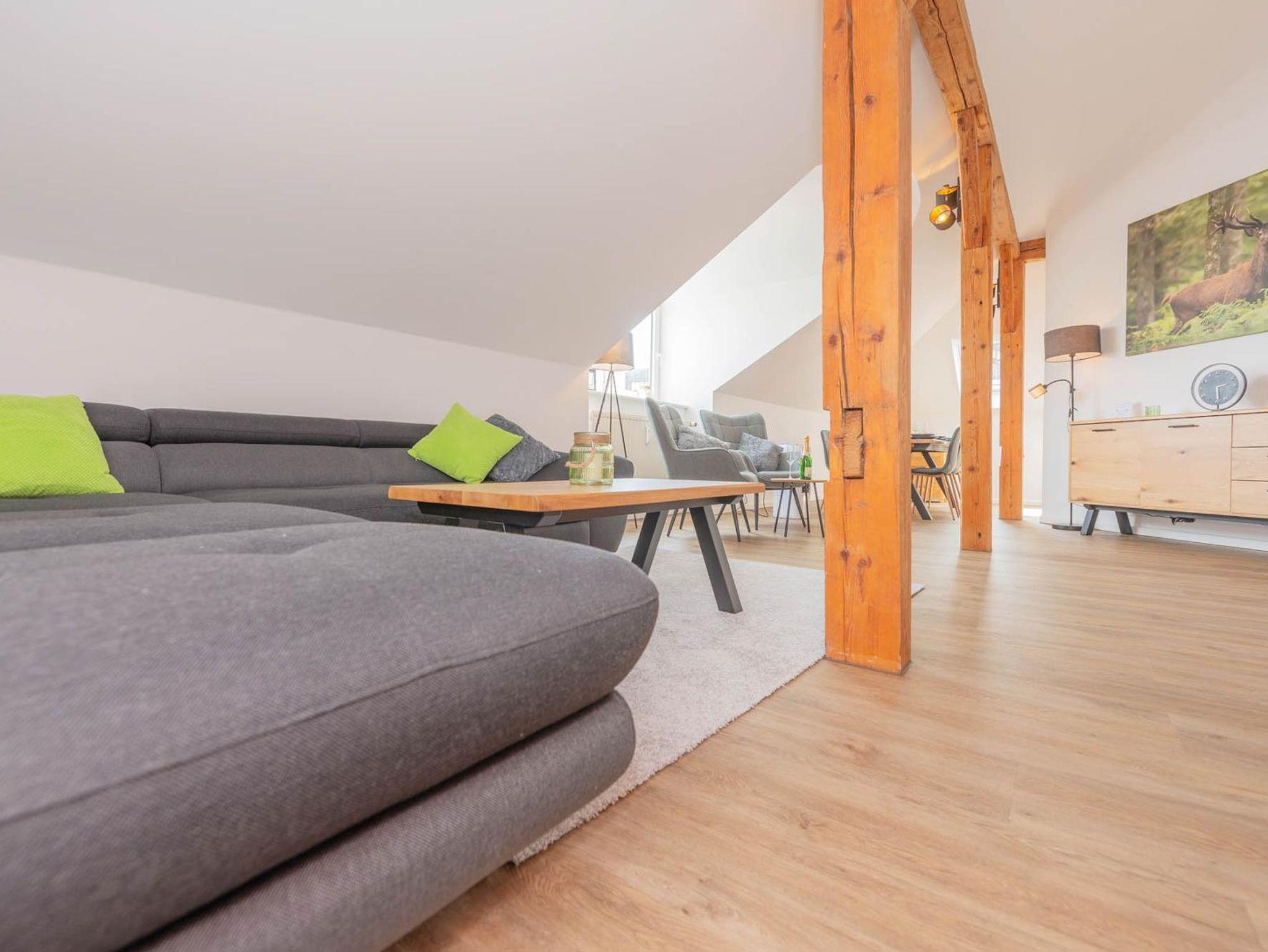 Unsere neue, modern eingerichtete, Dachgeschoss-Ferienwohnung mit ca. 100 m² im 2. Stock bietet Platz für bis zu 6 Personen. Das gemütliche Wohnzimmer mit Schlafsofa (ausziehbar auf 130x197) und Flachbild-TV sowie Internetradio lädt zum Verweilen ein.