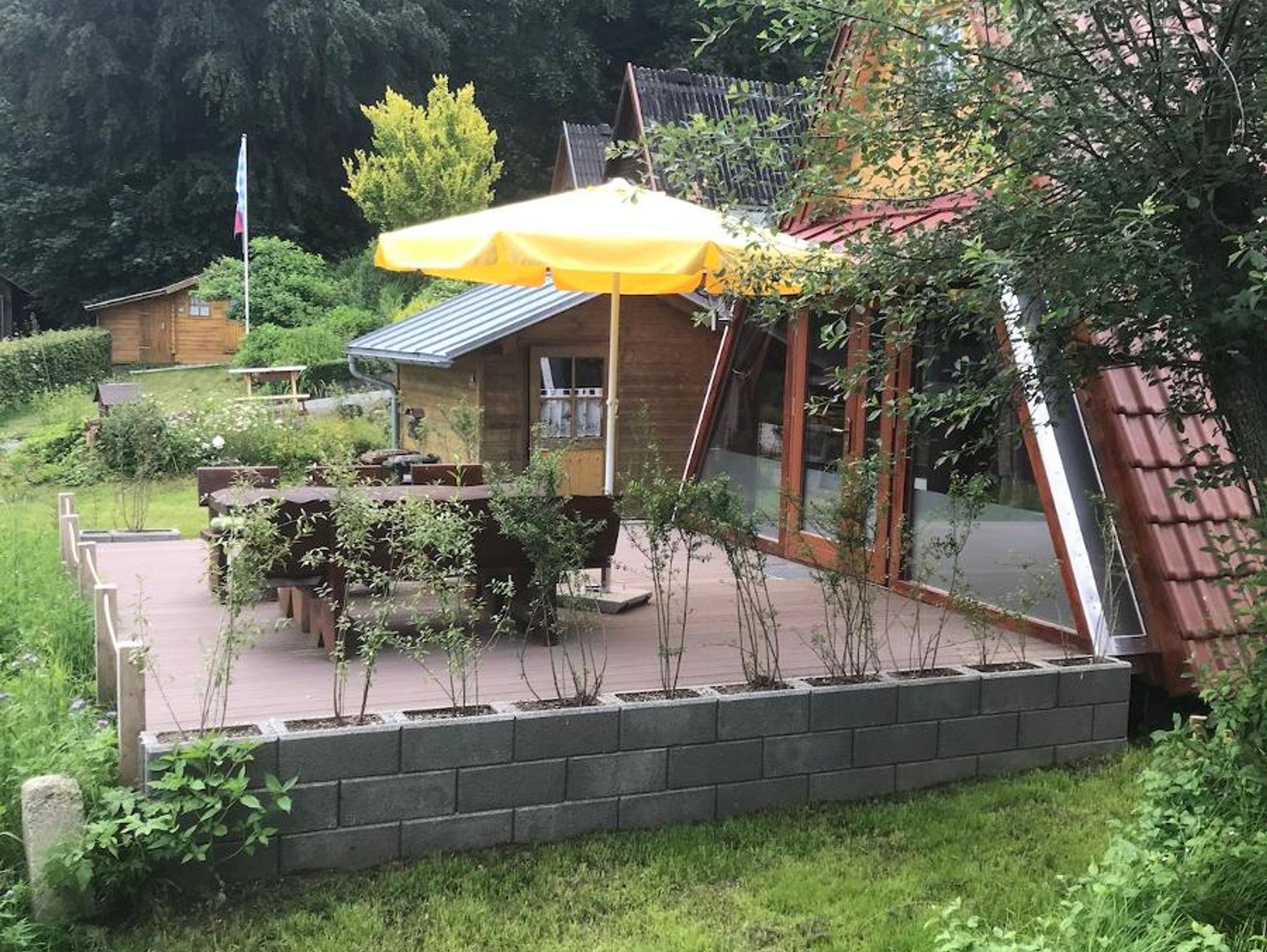 Terrasse: Umzäunte Hochterrasse, Tisch mit 1 Bank, 3 Stühlen und Auflagen, abschließbares Gartenhäuschen mit Grill, Sonnenschirm und Liege