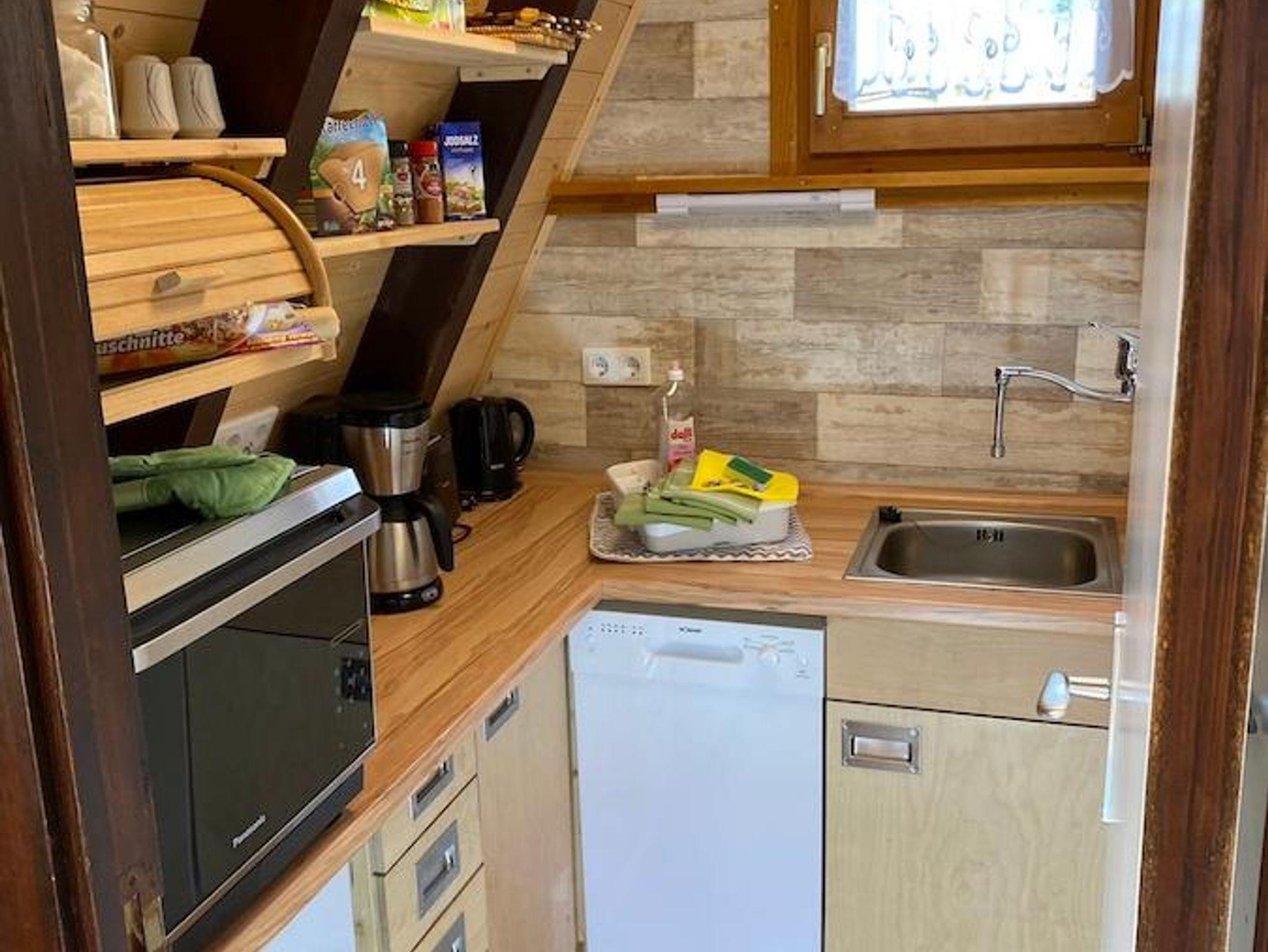 Küche: Backofen, Mikrowelle, 2 Kochplatten, Spüle, Spülmaschine, Kühlschrank mit 3*** Gefrierfach, Kaffeemaschine, Wasserkocher, Toaster, Töpfe, Pfannen, Geschirr, Besteck und Gläser,