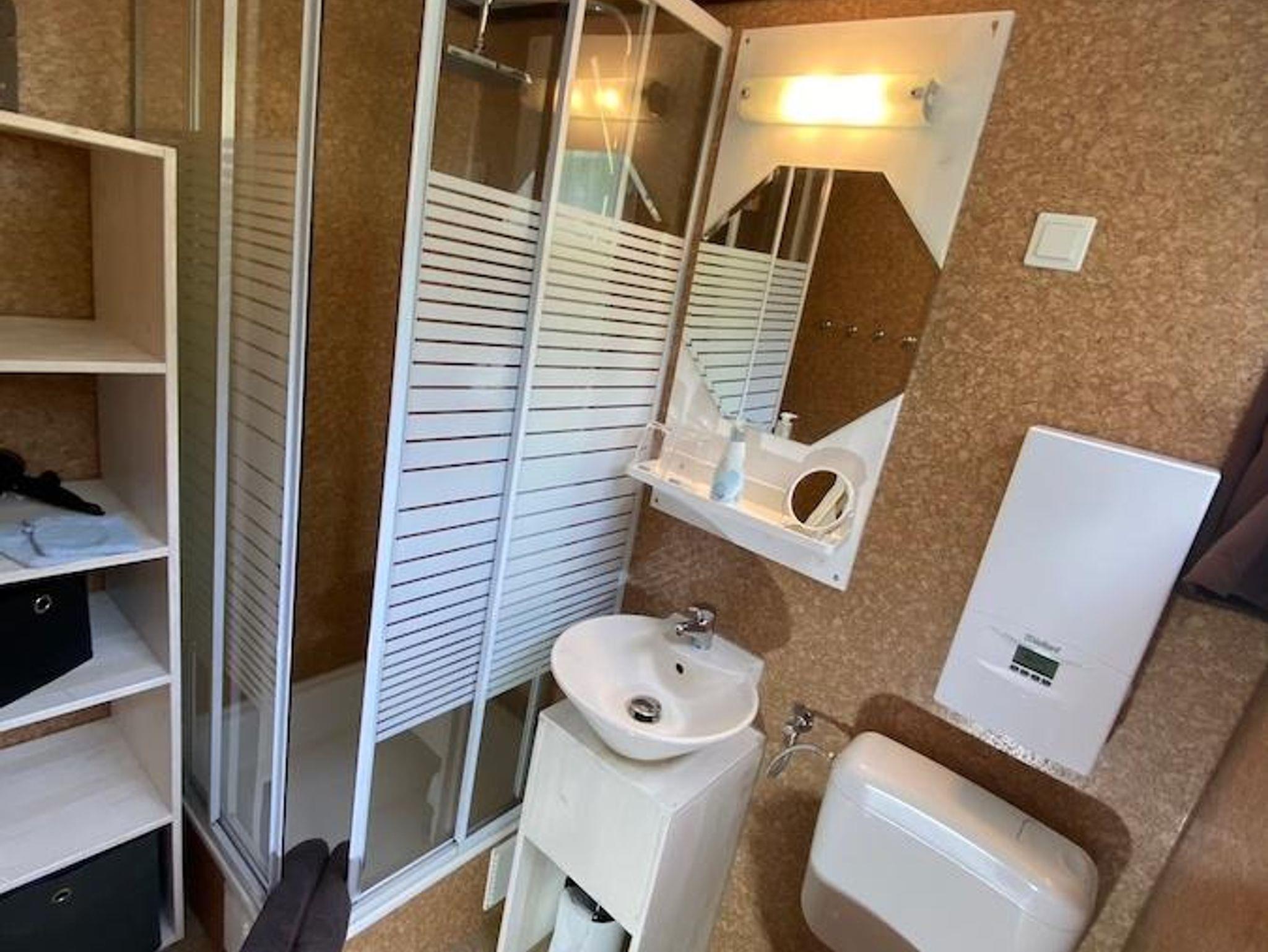 Badezimmer: Dusche, WC, Waschbecken, Spiegel, Durchlauferhitzer und Haartrockner