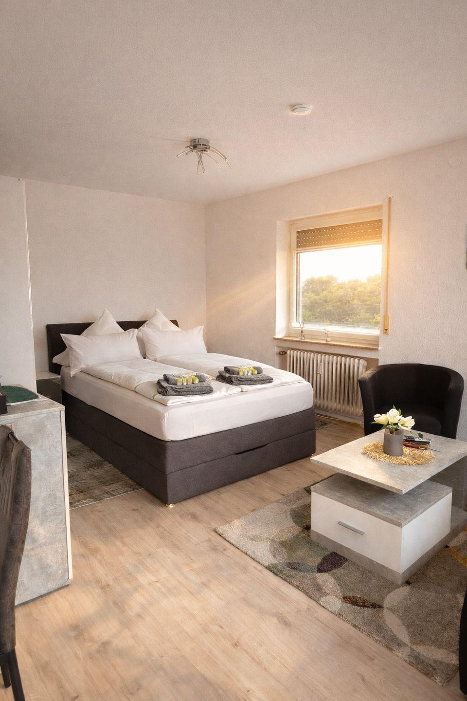 Die moderne Ferienwohnung besticht durch ihren offenen und hellen Wohn-Schlafbereich, der mit einem komfortablen Boxspringbett, einem Sofa, TV und einer stilvollen Einrichtung ausgestattet ist. Große Fenster lassen viel Tageslicht herein und sorgen für eine freundliche Atmosphäre.