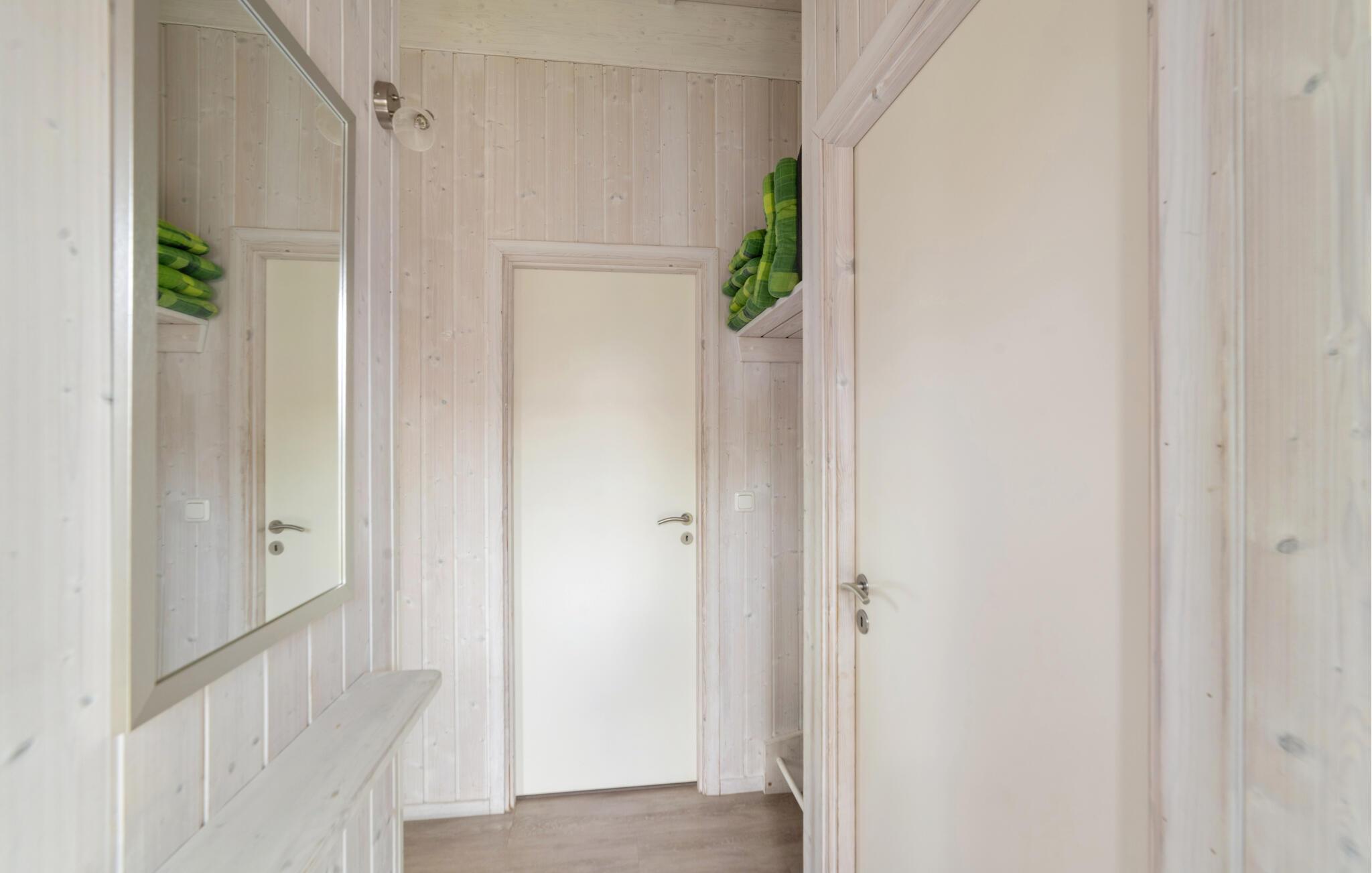 Gerade für die kältere Jahreszeit ist das Haus ideal, denn im Badezimmer erwartet Sie ihre ganz private Sauna, um sich nach einem Tag an der frischen Luft wieder richtig aufzuwärmen. Anschließend können Sie es sich auf dem Sofa gemütlich machen und den Feuerschein des Kamins (Bioethanol) im Wohnzimmer genießen.