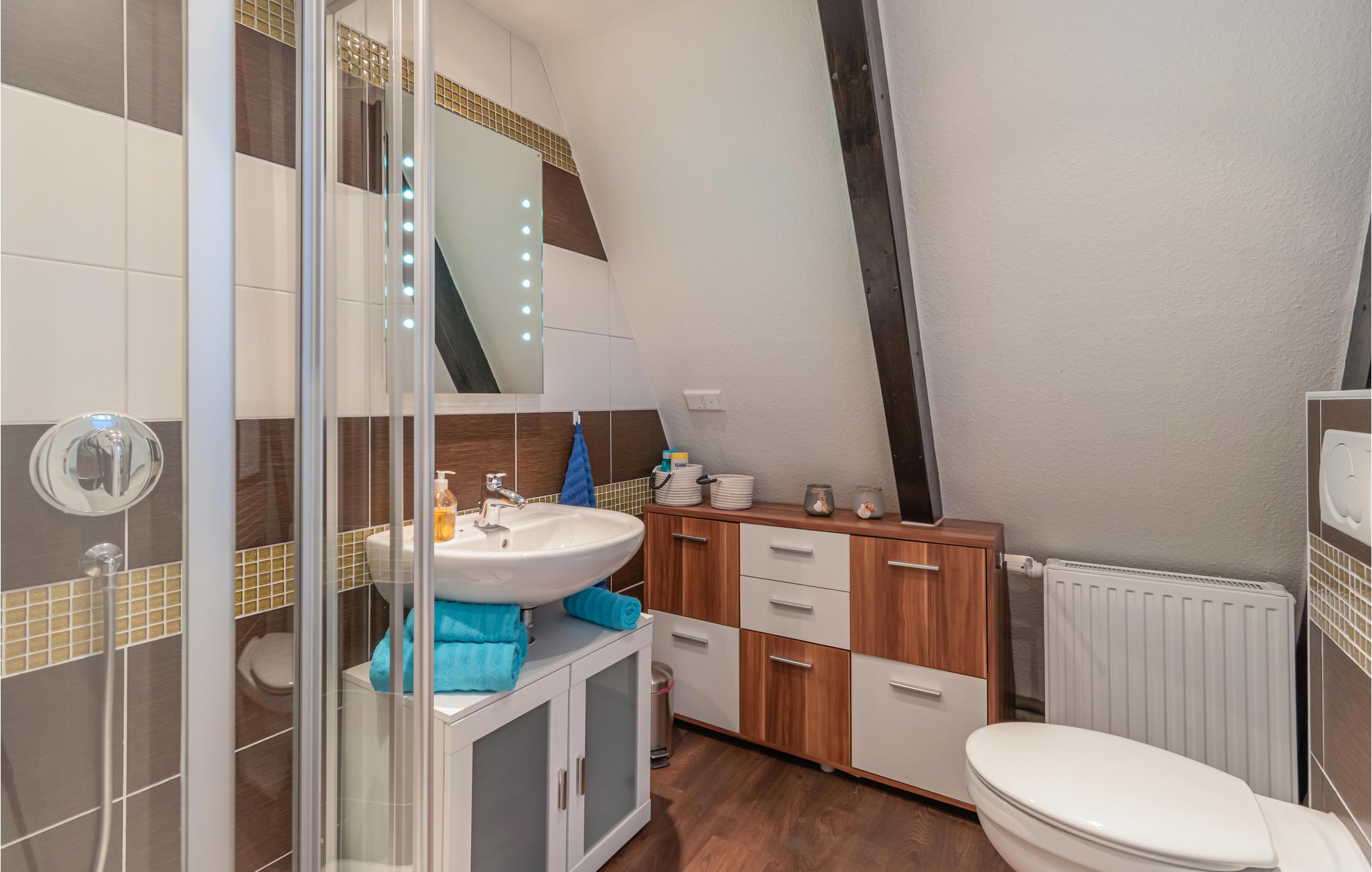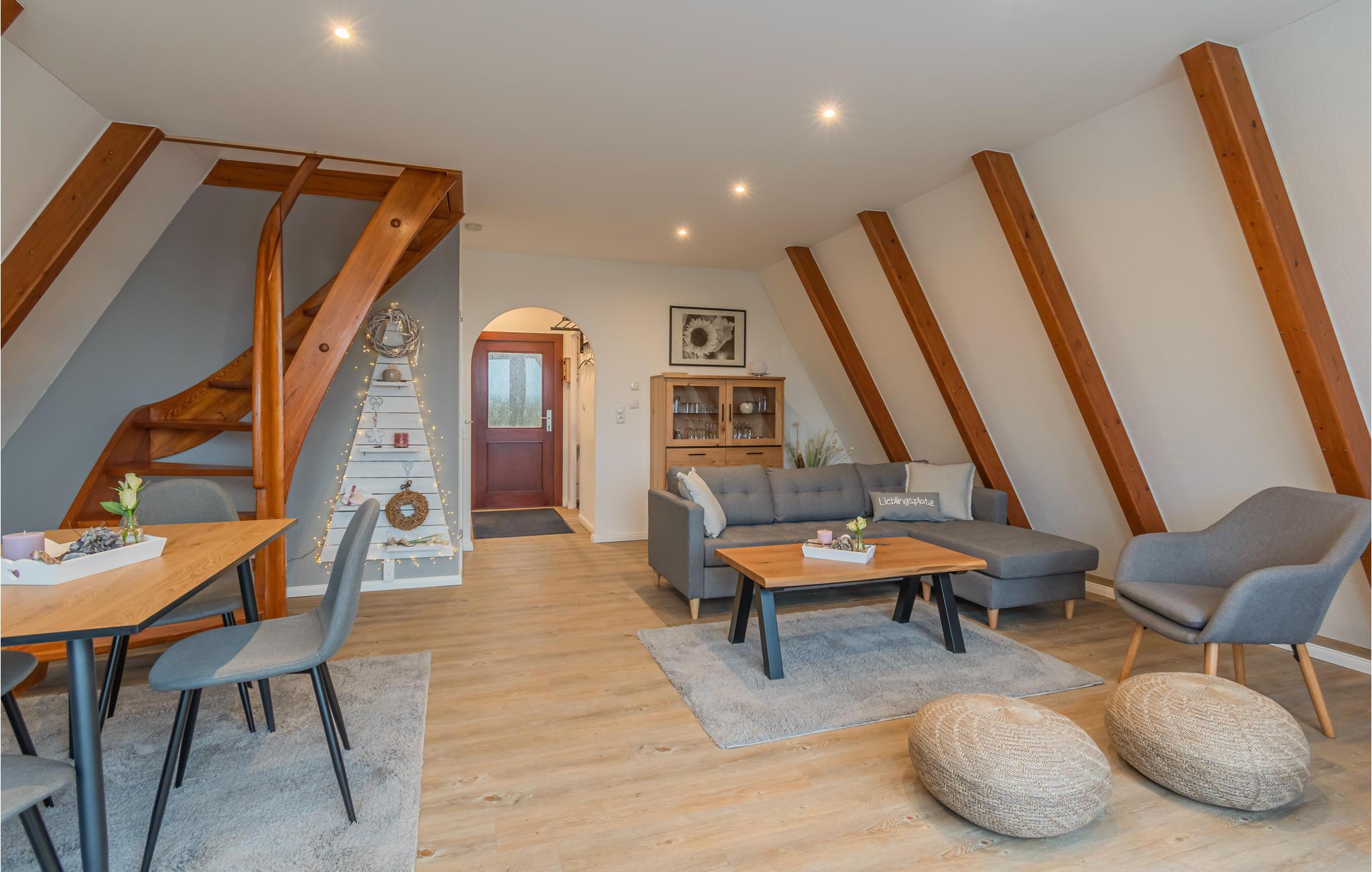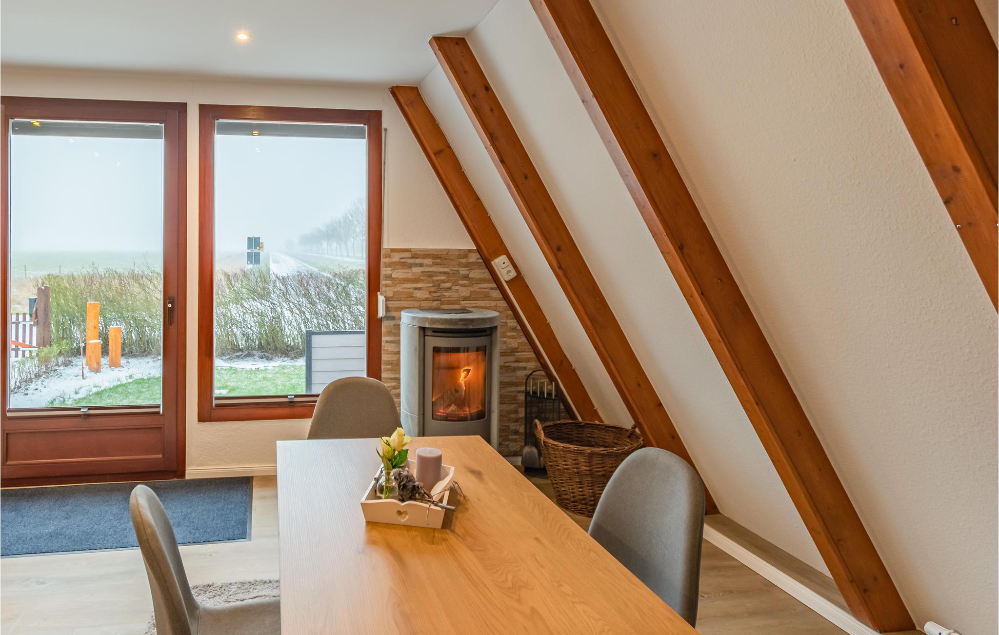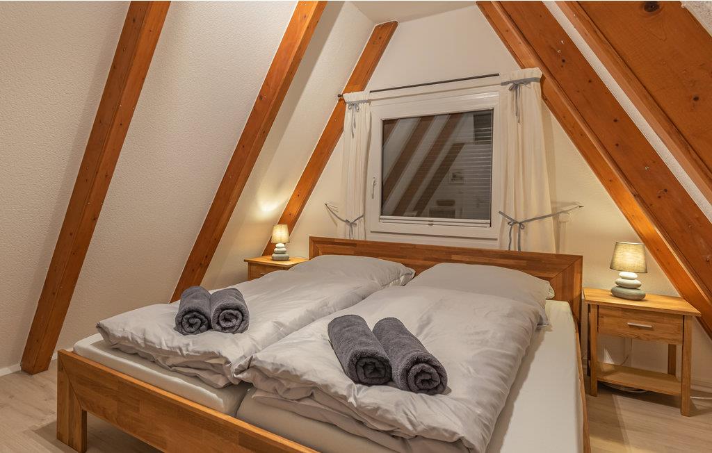 Willkommen in diesem einladenden Ferienhaus mit 2 Schlafzimmern, in dem auch 1 Haustier willkommen ist. Das eine Schlafzimmer bietet ein Doppelbett, im anderen befinden sich 2 Einzelbetten. Die Einrichtung ist hell und geschmackvoll, die Holzbalken an den schrägen Wänden verleihen den Räumen ein besonderes Flair, große Fenster ermöglichen einen schönen Blick ins Freie.