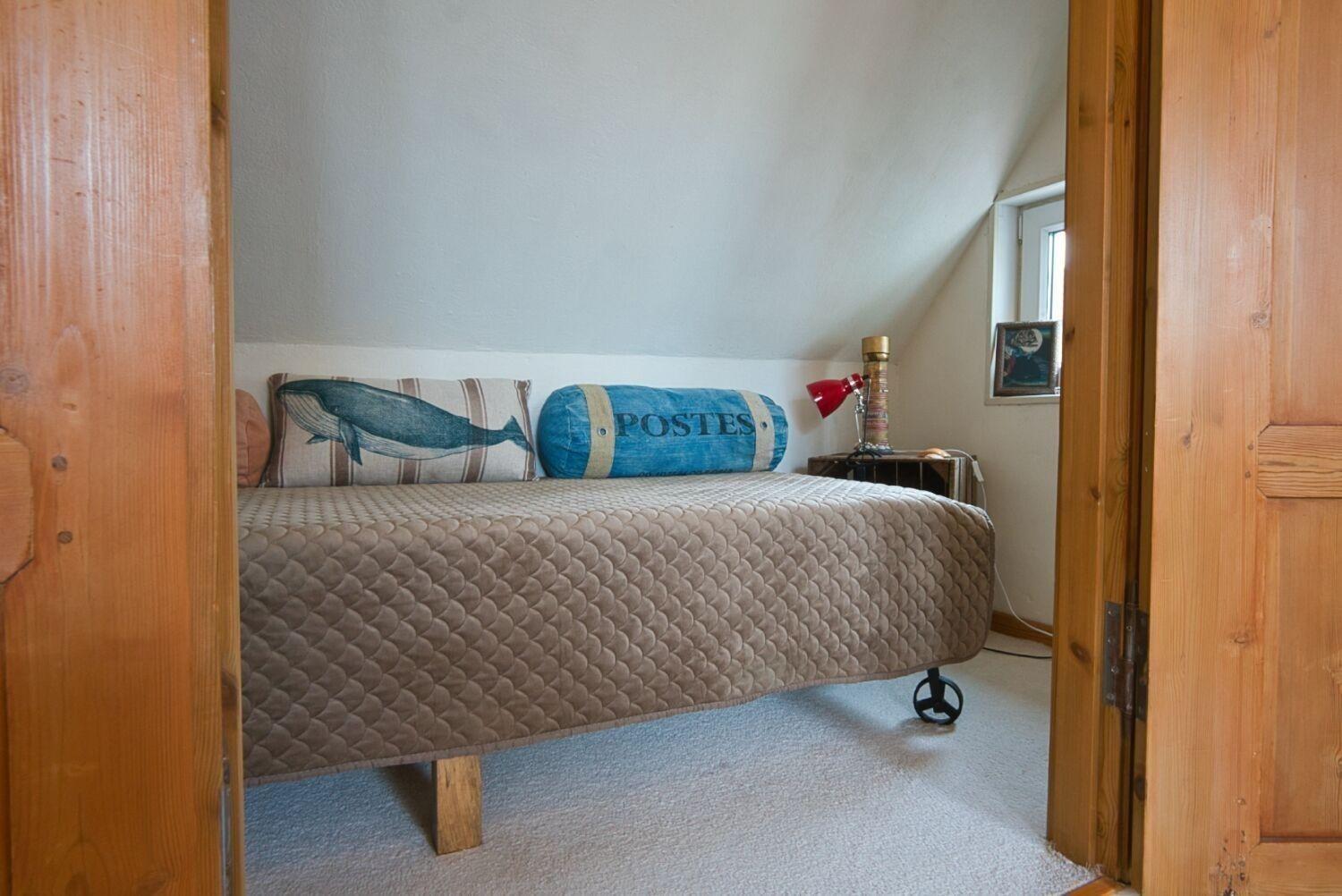Und zurück zur Diele des Hauses: Von hier aus geht es über die Treppe zu einem großen Schlafzimmer mit einem 1,60 m großen goldenen Doppelbett. Kleidung findet Platz in einer romantischen Hängegarderobe und einer Künstlerkommode. An das große Schlafzimmer schließt sich eine winzige, niedrige Kammer an, die durch eine leichte Tür verschlossen werden kann, und in der eine fünfte Person in einem 90 cm breiten Bett schlafen kann. Neben dem großen Schlafzimmer liegt ein kleines Schlafzimmer, das fast komplett von einem 1,40 m großen, edlen Bett ausgefüllt ist und in dem sich ein zweiter Fernseher befindet. Dieser hat allerdings "nur" Antennenempfang, das heißt, dass die privaten Sender nicht zu sehen sind. Außerdem steht hier eine weitere Hängegarderobe und eine Künstlerkommode. Zum Kuscheln, Träumen, Ausruhen, Lesen, Fernsehen ist der Raum ideal.