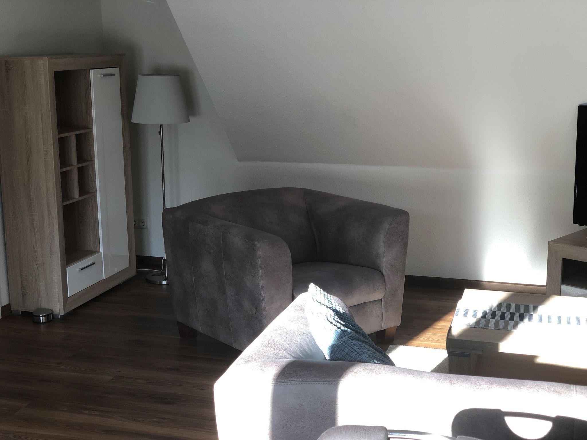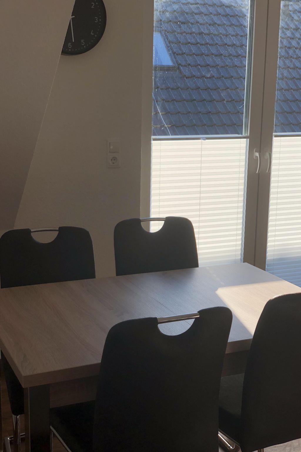 Schöne und helle Ferienwohnung mit 3 -Zimmern in Obergeschoss mit ca. 100 m² Nutzfläche-ausgestattet für bis zu 4 Personen. OG: sehr hochwertig gestalteter, lichtdurchfluteter Wohnbereich. Flat-TV. Integrierte Küche mit Geschirrspüler, Microwelle und Kaffeemaschine. Sonnige Südterrasse. Eine schöne gestaltete , kuschelige offene Räumlichkeit mit Doppelbett (ca.180 x 200 cm) und zwei Schlafzimmer mit je ein Einzelbett und Schrank. Bad mit Dusche, und WC und Handtuchheizkörper.