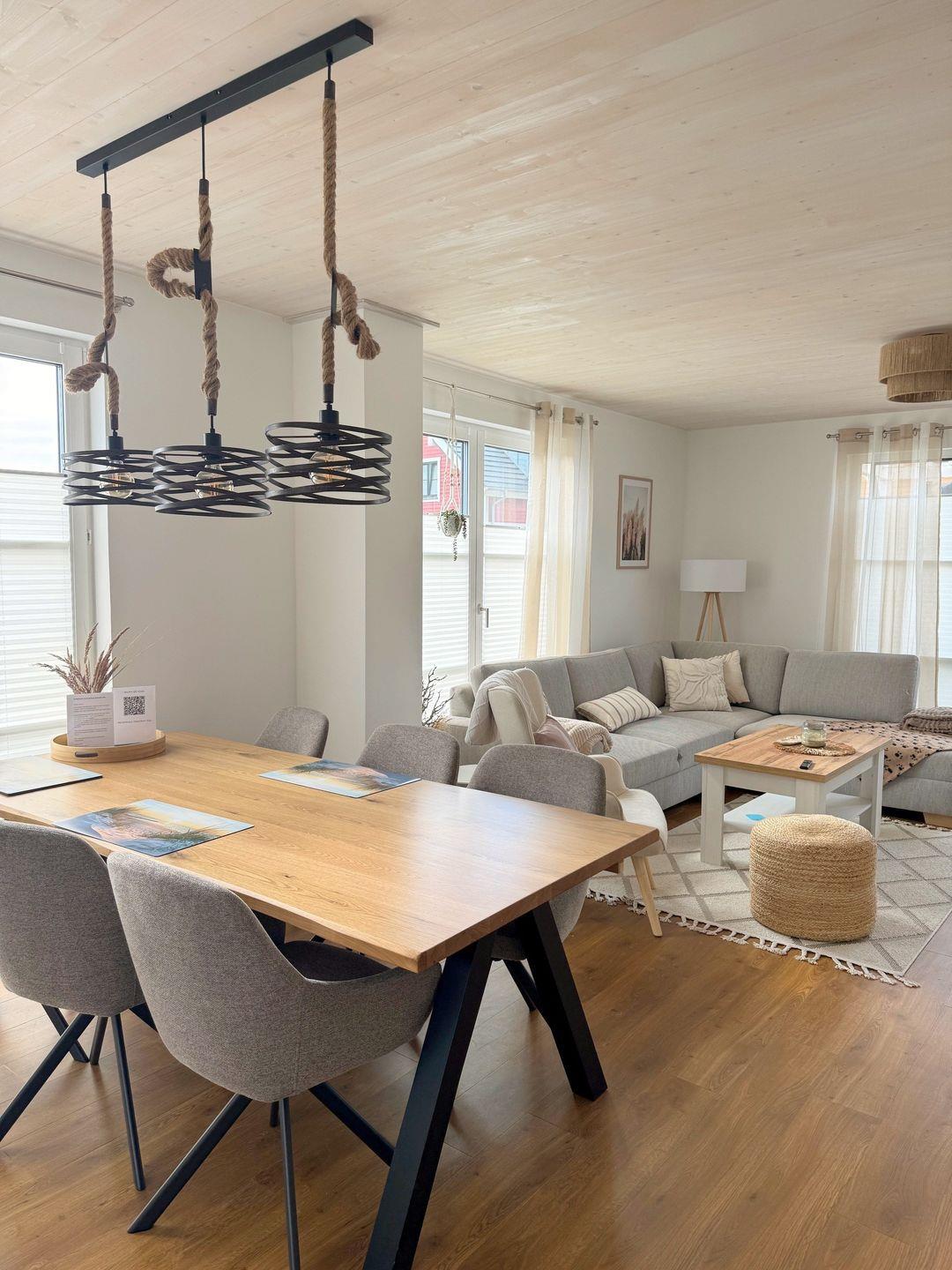 Die offene Küchenzeile mit anliegendem Essbereich ist mit einen Geschirrspüler, Kühlschrank mit Gefrierfach, Kaffeemaschine, Backofen, 4-Platten-Ceranfeld, E-Herd und Wasserkocher ausgestattet. Natürlich finden Sie hier auch Geschirr und Besteck sowie weitere Küchengeräte und Utensilien.