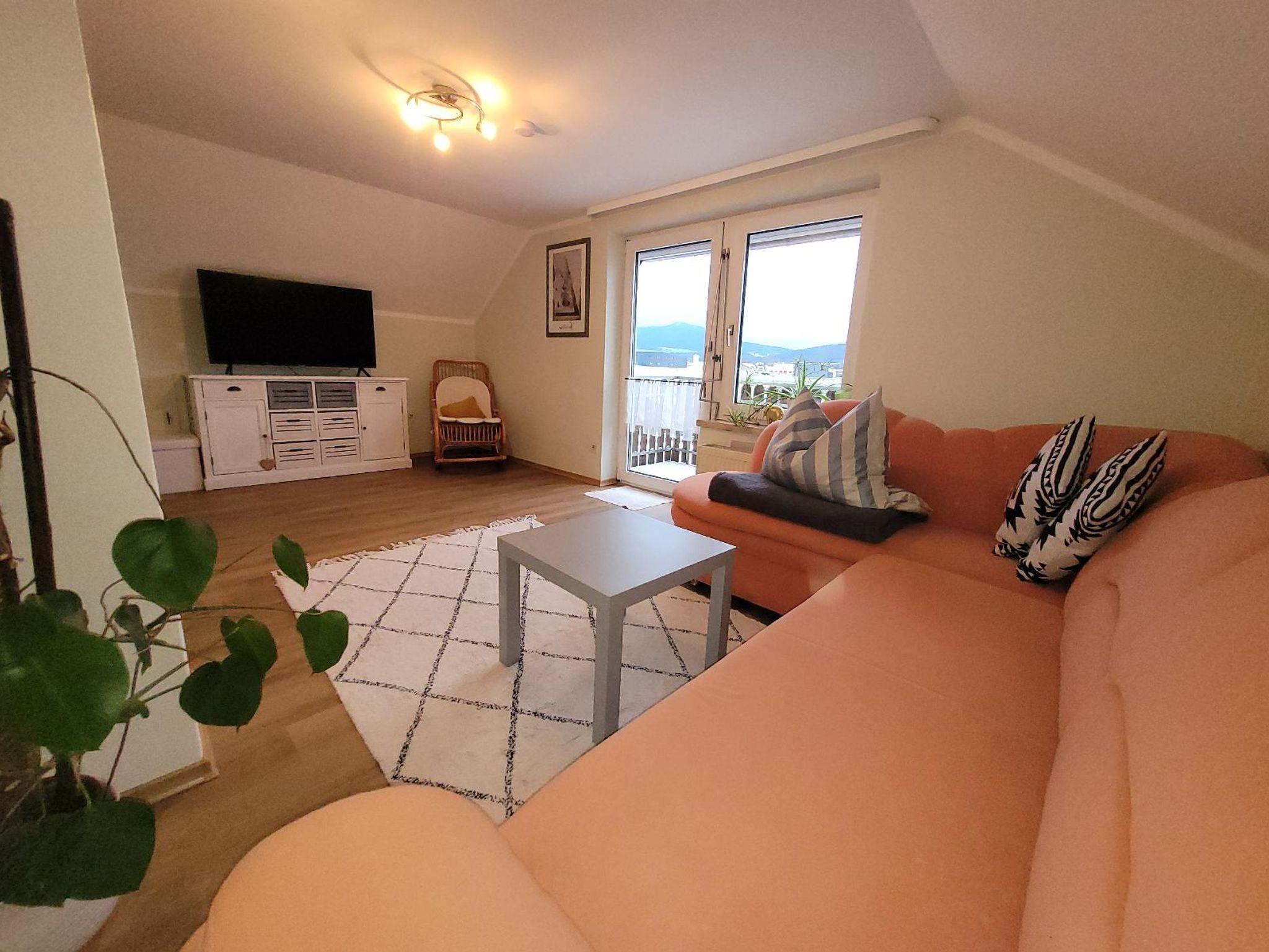 Die zentral gelegene schöne Ferienwohnung mit 60 m² Wohnfläche bietet Platz für bis zu 4 Personen. Im Schlafzimmer steht ein gemütliches Doppelbett, weitere Schlafplätze bestehen im Wohnzimmer auf der ausziehbaren Couch (für zwei Personen - auf Wunsch kann eine Zusatzmatratze auf dem Boden ausgelegt werden). Im Wohnzimmer befindet sich ein Flachbild-TV mit dem SAT-TV empfangen werden kann, zudem ist ein Amazon Fire TV-Stick angeschlossen. Von hier aus lässt sich der Balkon (mit Sitzmöglichkeit) betreten, um die frische Luft des Bayerischen Waldes einzuatmen (oder eine Zigarette zu rauchen) und einen herrlichen Blick auf die Berge der Umgebung zu werfen. Die neue Küche ist komplett ausgestattet mit Geschirrspüler, Kühlschrank, Herd, Backofen, Wasserkocher, Toaster und Kaffeemaschine und lässt Sie ein entspanntes Frühstück oder Mittag-/Abendessen in der Essecke genießen. Das Badezimmer mit ebenerdiger Dusche, WC und Handtuchtrockner rundet das ansprechende Gesamtbild ab. Vor allem im Sommer bietet der große Garten viel Platz für Kinder zum Toben und Spielen. Eine mobiles Klimagerät sorgt für eine angenehme Temperatur im Schlafzimmer an heißen Sommertagen. Das WLAN und den Parkplatz vor dem Haus können Sie kostenfrei nutzen. Auch Bettwäsche und Handtücher sind im Preis inkludiert. Bitte beachten Sie, dass Haustiere nur nach vorheriger Absprache (gegen Zusatzgebühr) erlaubt sind.