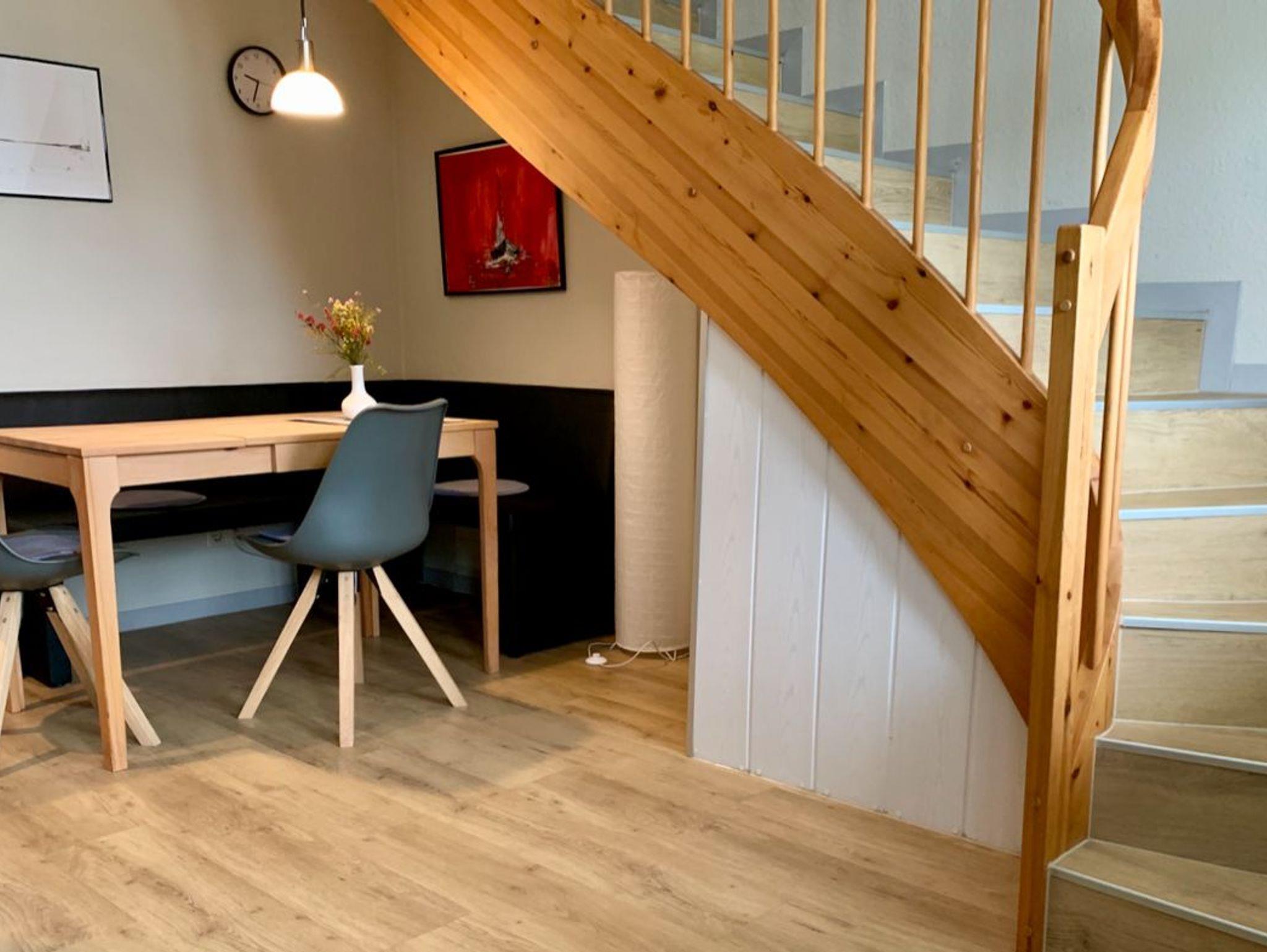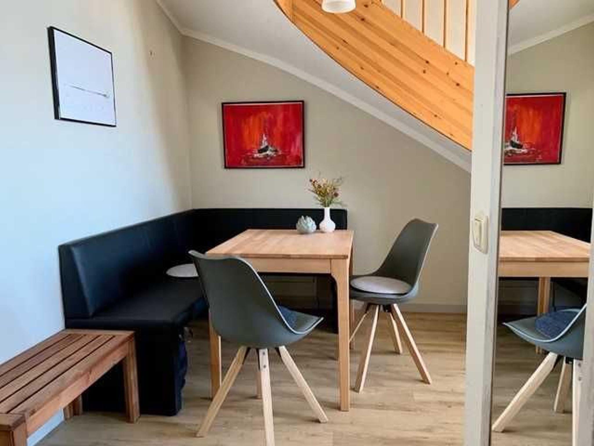 Die Maisonette-Ferienwohnung verfügt über 2 Zimmer zzgl. Wohnküche. Sie hat Meerblick von allen Zimmern. Im Untergeschoss: ein separates Wohnzimmer mit moderner Schlafcouch (1,60m breit), Flachbild-TV mit allen gängigen Programmen (inkl. Smart-Funktion) und Stereoanlage, separater wohnlicher Essbereich mit gemütlicher Eckbank und moderner Küchenzeile (komplette Ausstattung, Backofen, Spülmaschine, Radio)
