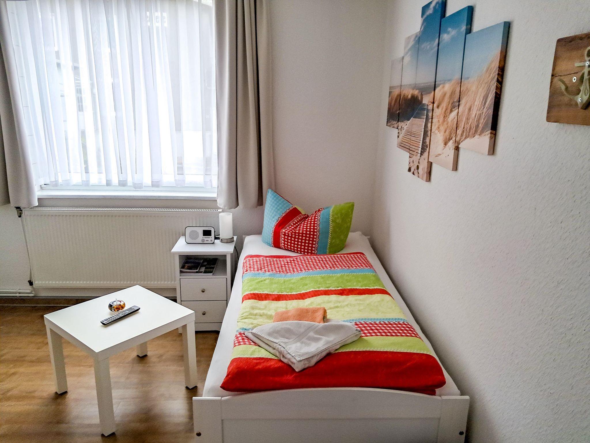 Das 12m² große Ferienzimmer befindet sich im Einfamilienhaus des Vermieters und wird über einen gemeinsamen Flur betreten. Es besteht aus einem Wohn- und Schlafraum mit einer Schlafcouch, Kleiderschrank, TV und einem kleinen Essbereich mit Wasserkocher, Kaffeemaschine und Toaster. Auf dem Flur befindet sich ein kleiner Kühlschrank, welcher von Gästen des Ferienzimmers mitgenutzt werden kann.