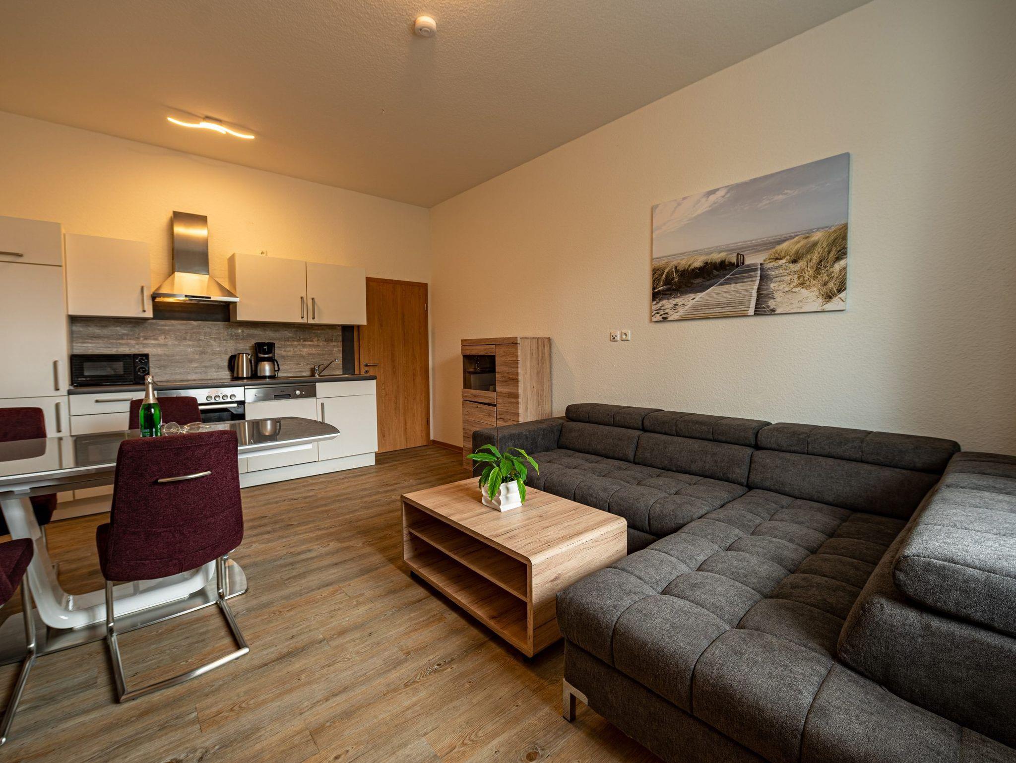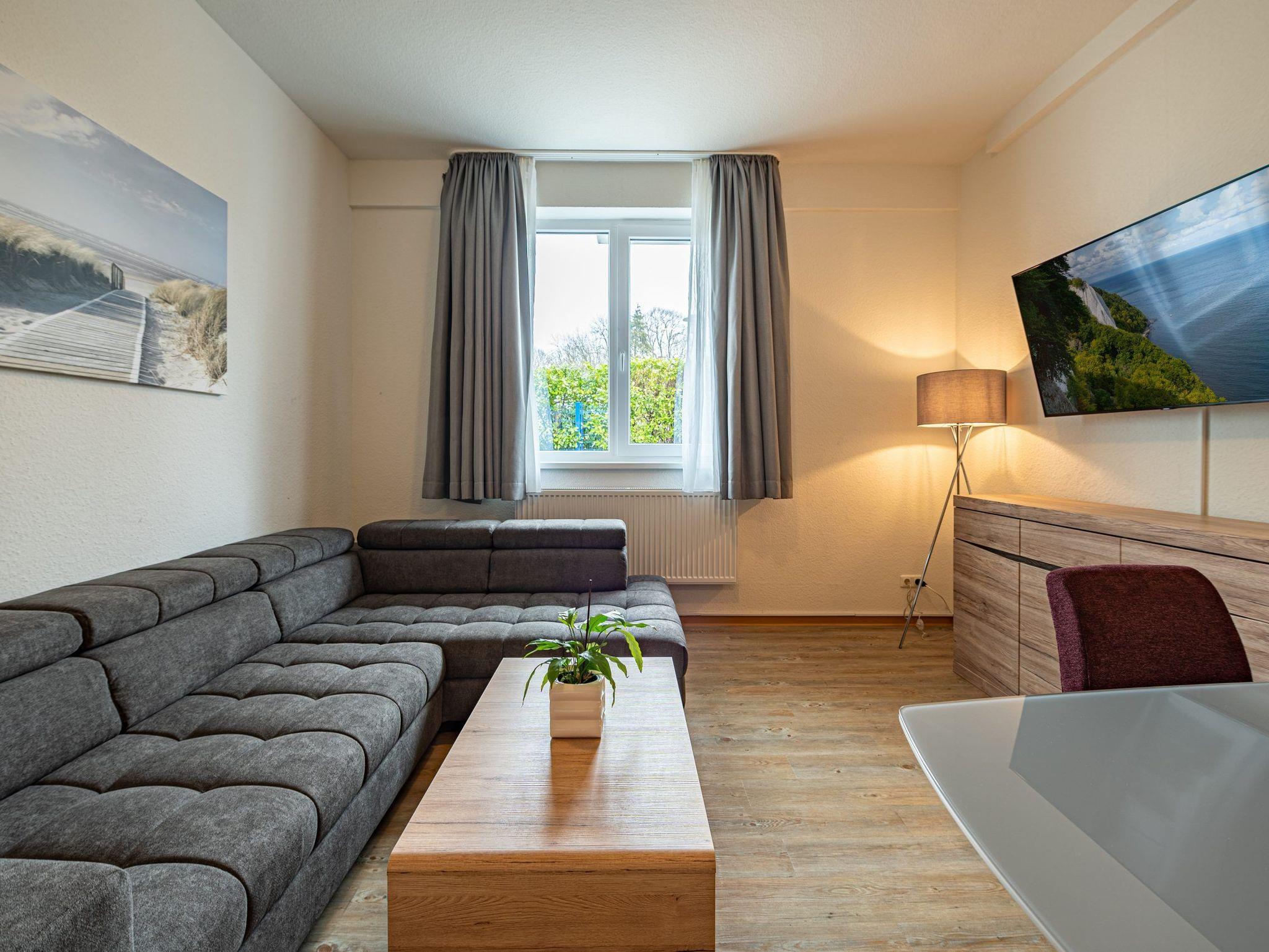 * Wohnbereich mit moderner Wohnlandschaft, Couchtisch, Anrichte mit Flat-TV (integr. Radiofunktion) und Esstisch mit 6 Stühlen