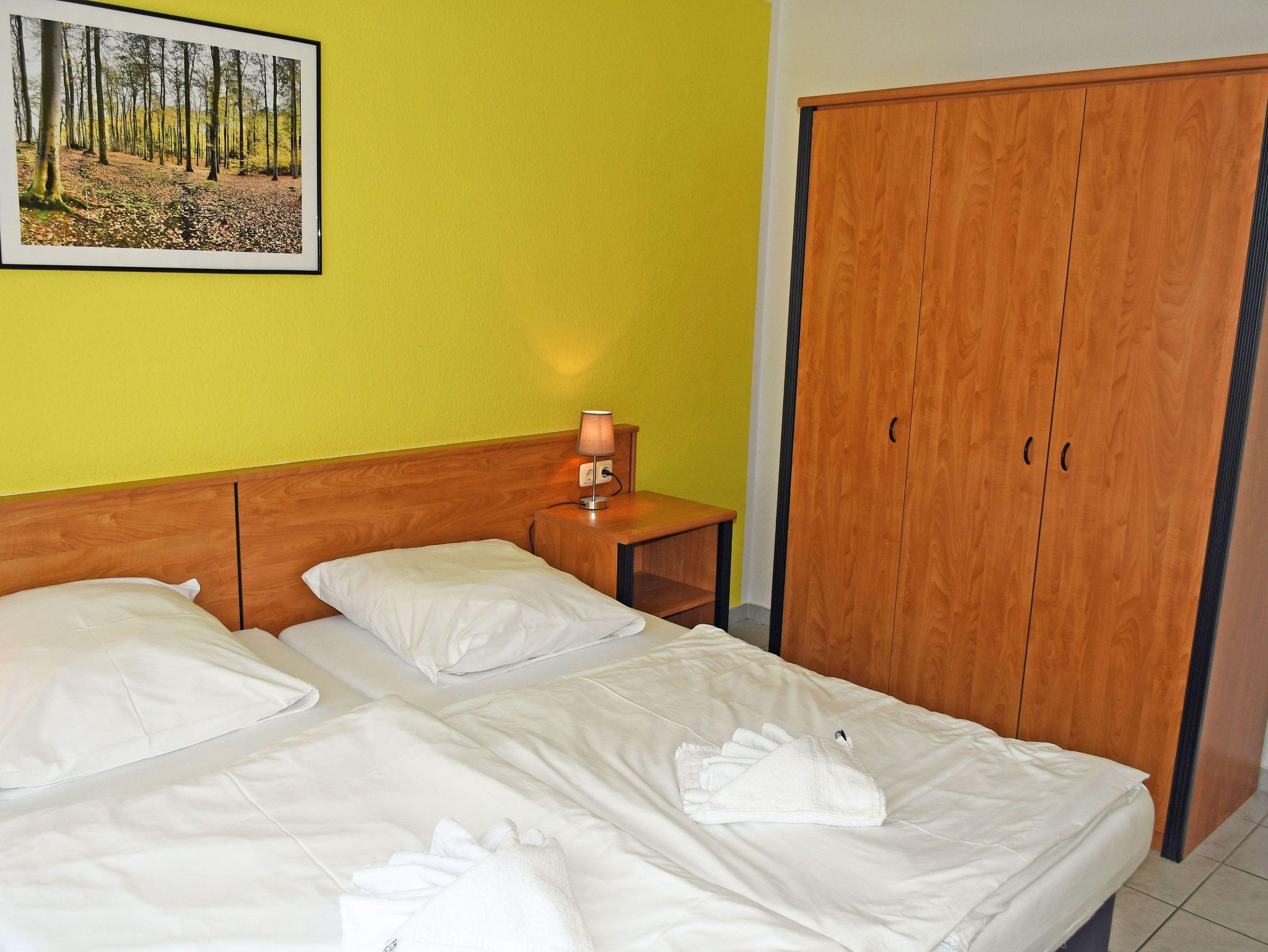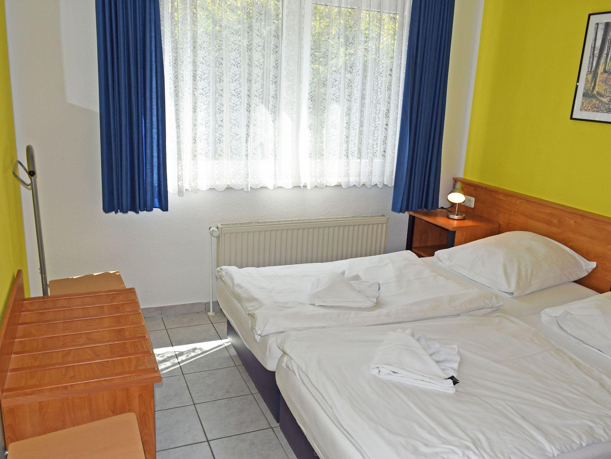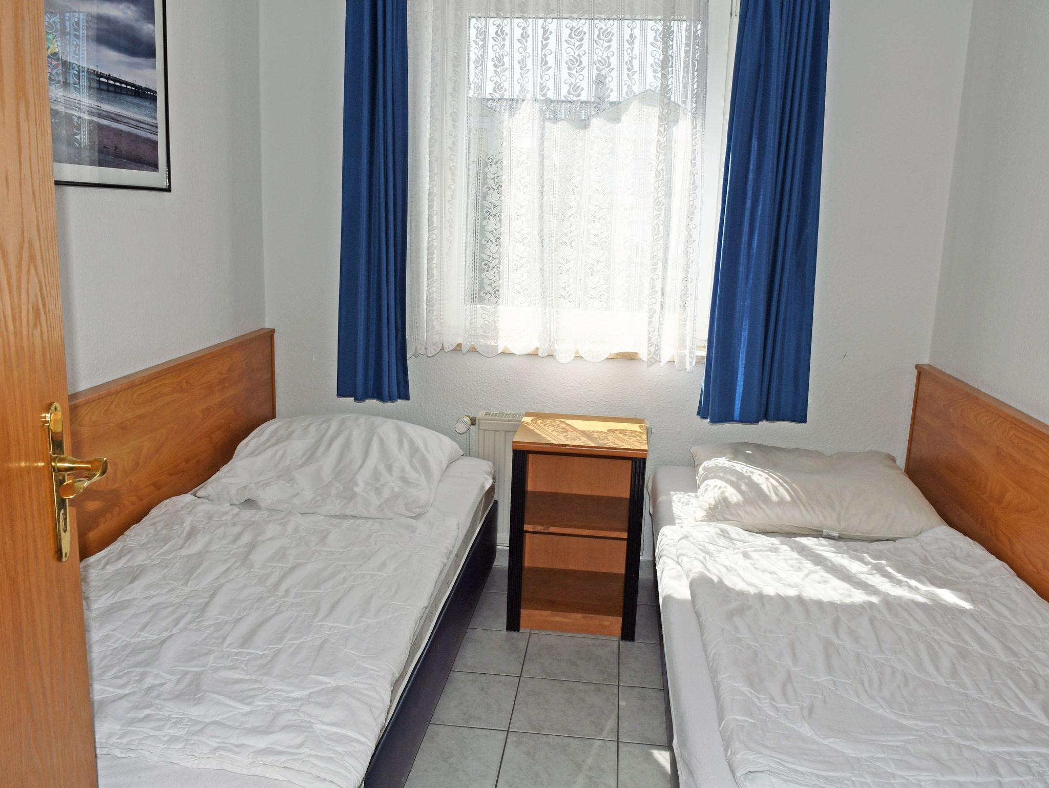 · Schlafzimmer mit 2 Einzelbetten (in der Fewo 18 Etagenbett) und kleinem Schreibtisch