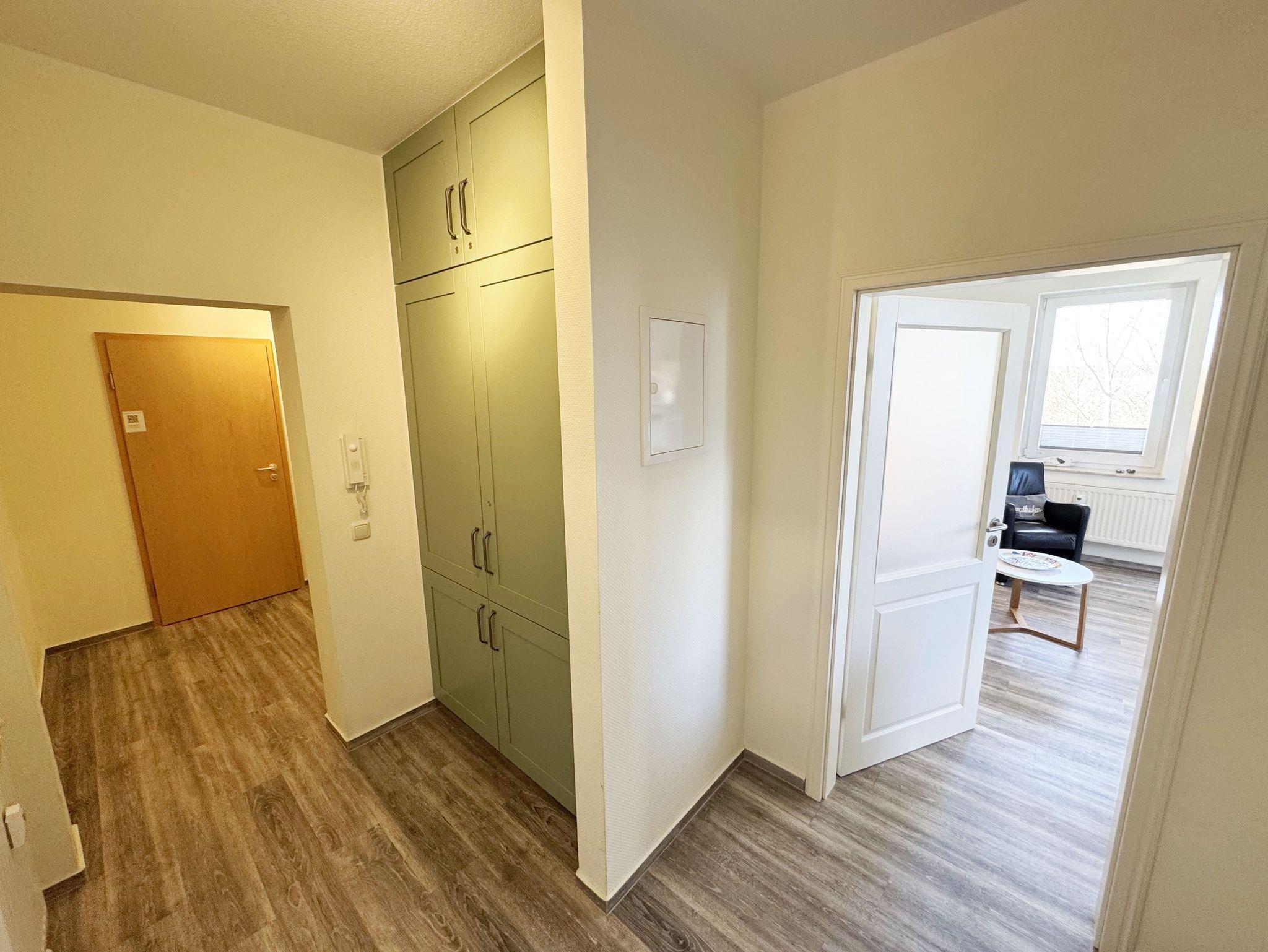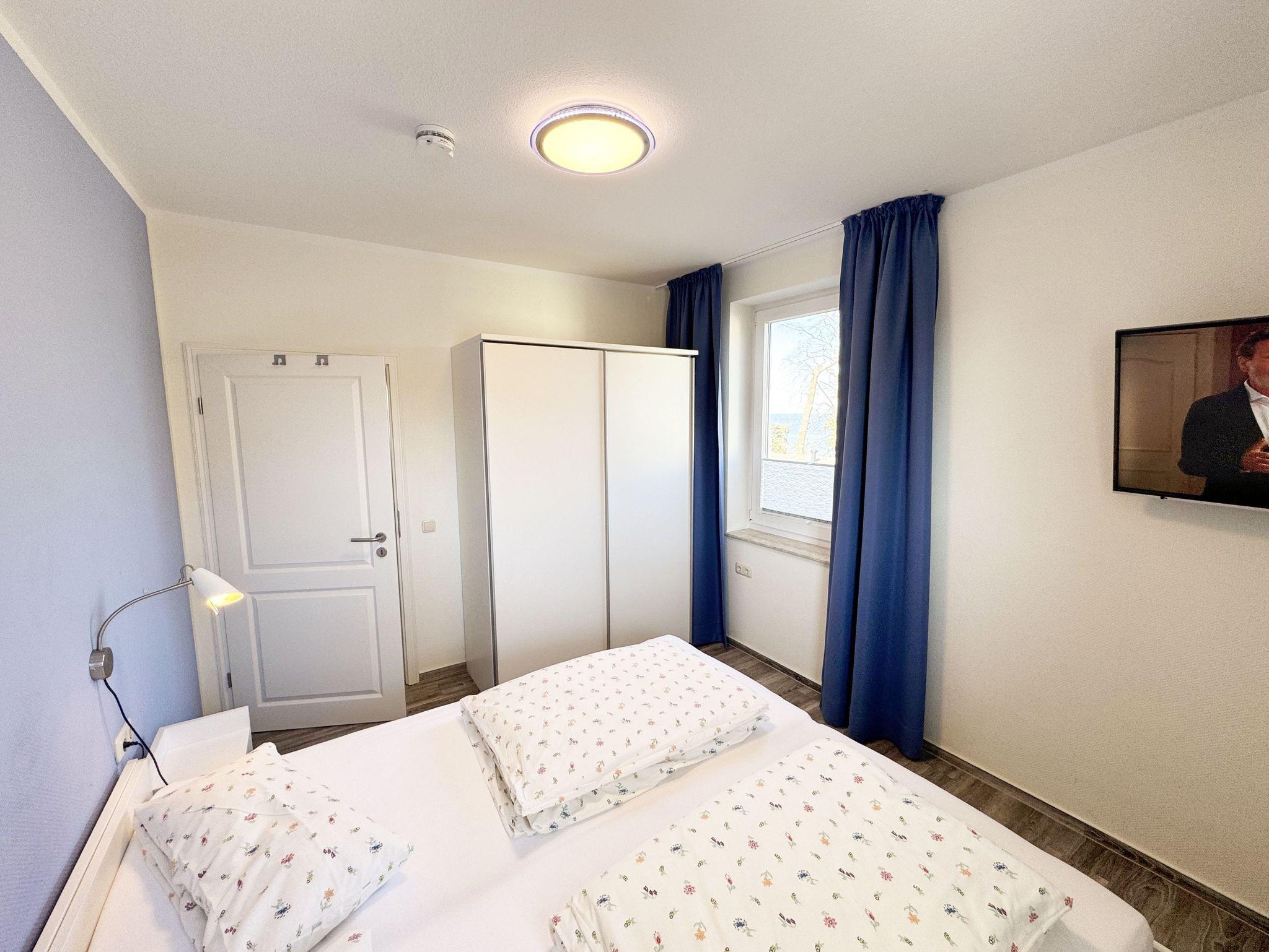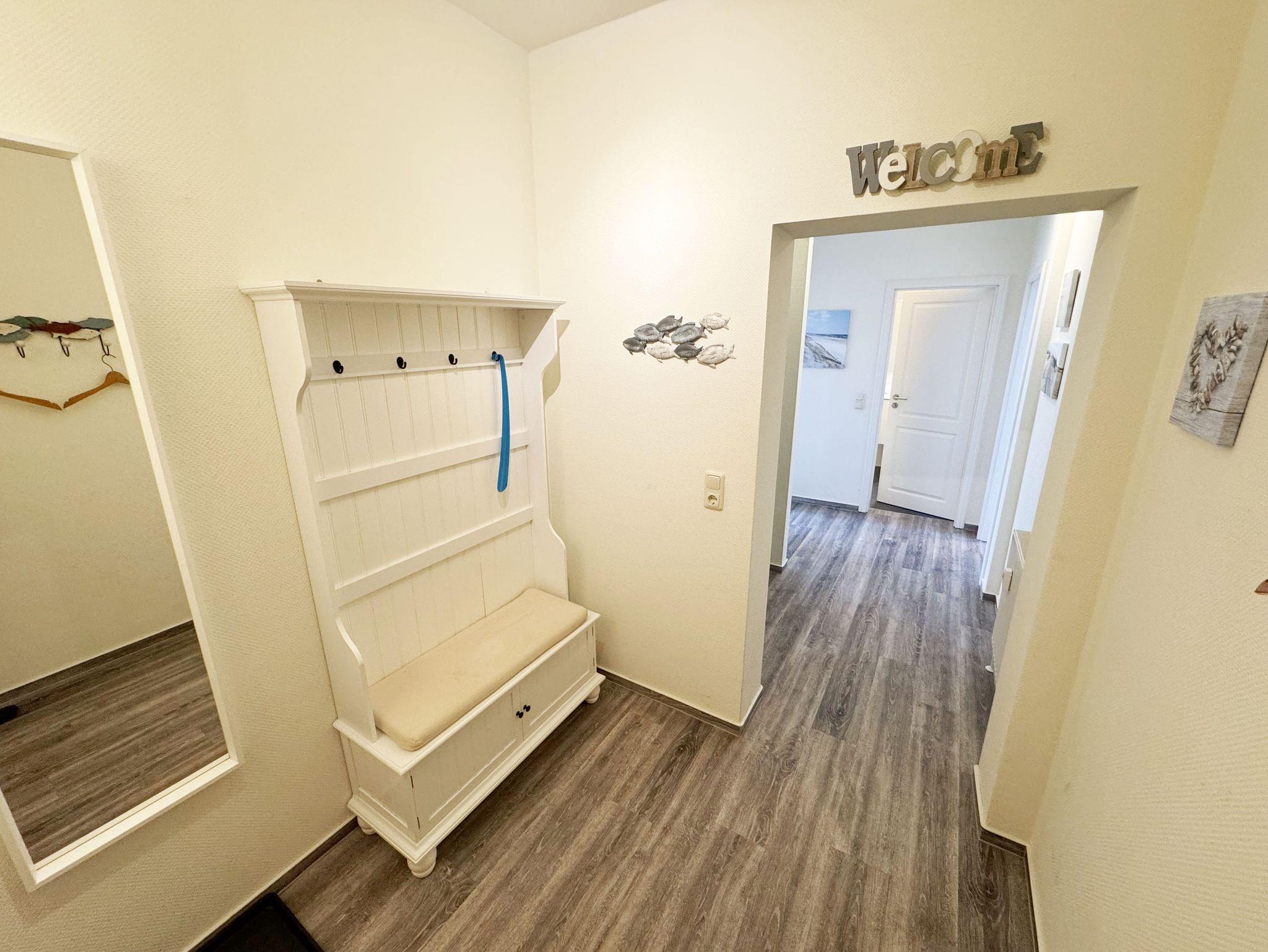 Die helle und freundliche 2-Raumferienwohnung im 2. Obergeschoss umfasst ca. 45 m² und ist eine Nichtraucherwohnung. Die Wohnung ist für max. 2 Erwachsene ausgestattet und ist bequem über das Treppenhaus oder den Aufzug zu erreichen. Sie verfügt über einen geräumigen Flurbereich sowie ein Wohn-/Esszimmer mit einer Couch, Sessel, Couchtisch, Esstisch und eine neue, sehr gut ausgestattete Einbauküche mit Backofen, Ceran-Kochfeld, Mikrowelle, Spülmaschine, Kühlschrank mit Gefrierfach, Kaffeemaschine, Senseo Pad-Maschine, Wasserkocher, Toaster, Eierkocher, Mixer sowie diverse Küchenutensilien. Der technische und der Unterhaltungsbereich wird durch einen Smart-TV, Blu-Ray-Player, Stereoanlage mit CD-Player und USB-Anschluss, eine Spielesammlung, eine kleine Auswahl an Büchern sowie einen kostenloser Internetanschluss (WLAN) abgerundet. Der großzügige und überdachte Balkon (Nord/West) mit Bestuhlung und Sonnenschirm lädt zum Entspannen ein und ist über das Wohn-/Esszimmer zu erreichen. Von hier haben Sie einen Blick ins Grüne, Richtung Ostsee, wo Sie das Wellenrauschen (natürlich bei ausreichend Wind) genießen können. Das Schlafzimmer ist mit einem Doppelbett (Härtegrad 2 und 3, Liegefläche 1,80 m x 2,00 m), verstellbare Lattenroste, Nachttischablagen, einem Herrendiener, einem Kleiderschrank, Smart-TV und Verdunklungsgardinen sowie Plissee ausgestattet. Das moderne und geflieste Bad mit WC, Waschtisch, Dusche, Badmöbeln, Kosmetikspiegel und Fön bietet ausreichend Komfort für Ihren Urlaubsaufenthalt. Im Wohn- & Schlafzimmer finden Sie zusätzlich ein Insektenschutzgitter. Der PKW-Stellplatz befindet sich direkt am Haus. Ein abschließbarer Gemeinschaftsabstellraum und Fahrradständer hinter dem hauseigenen Parkplatz sind ebenso nutzbar. Die Mitnahme eines Haustieres ist gegen eine Gebühr möglich. Die Erstausstattung eines Wäschepaketes (komplette Bettwäsche, 1 Duschhandtuch, 2 kleine Handtücher, 2 Geschirrhandtücher) können Sie bis 14 Tage vor Anreise gegen einen Aufpreis dazu buchen oder durch eigene ergänzen.