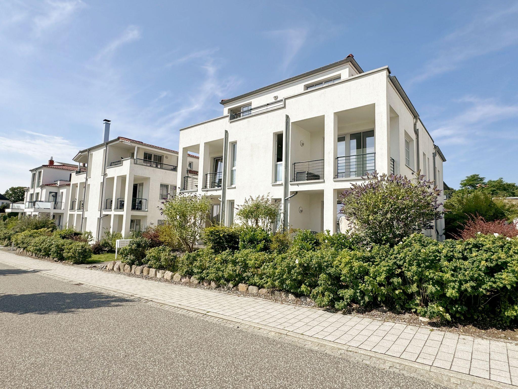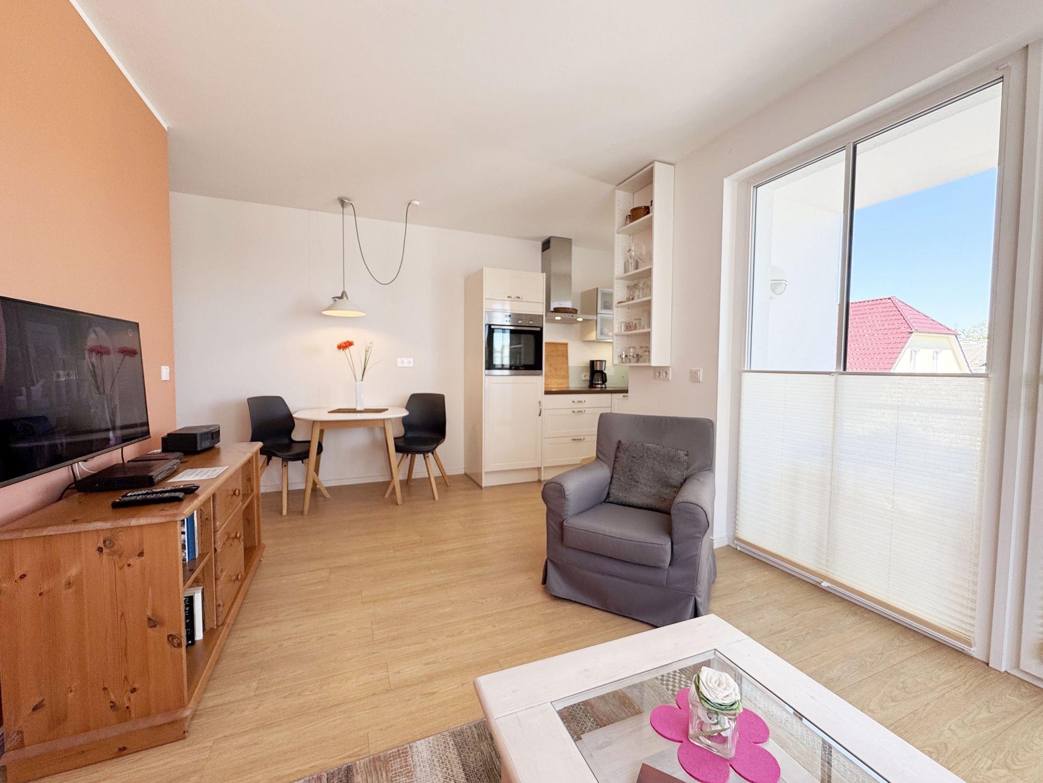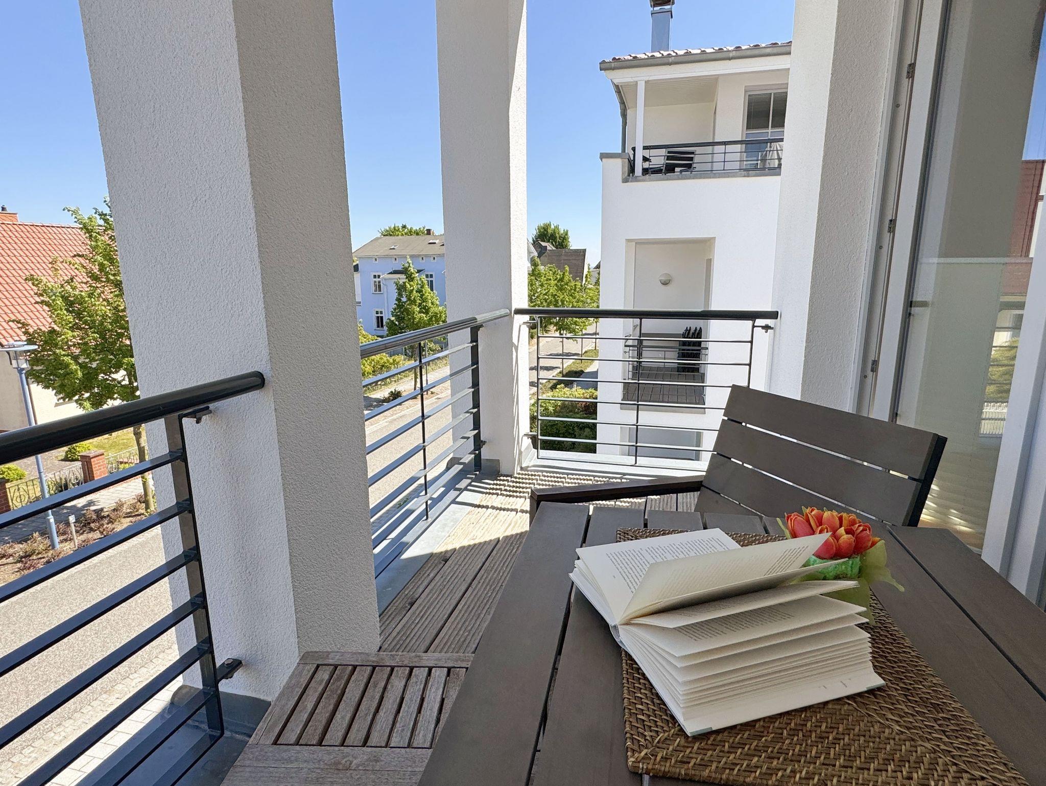 Moderne Ferienwohnung mit Balkon in der Villa Antje, zentral in Göhren, nahe Strand und Einkaufsmöglichkeiten.
