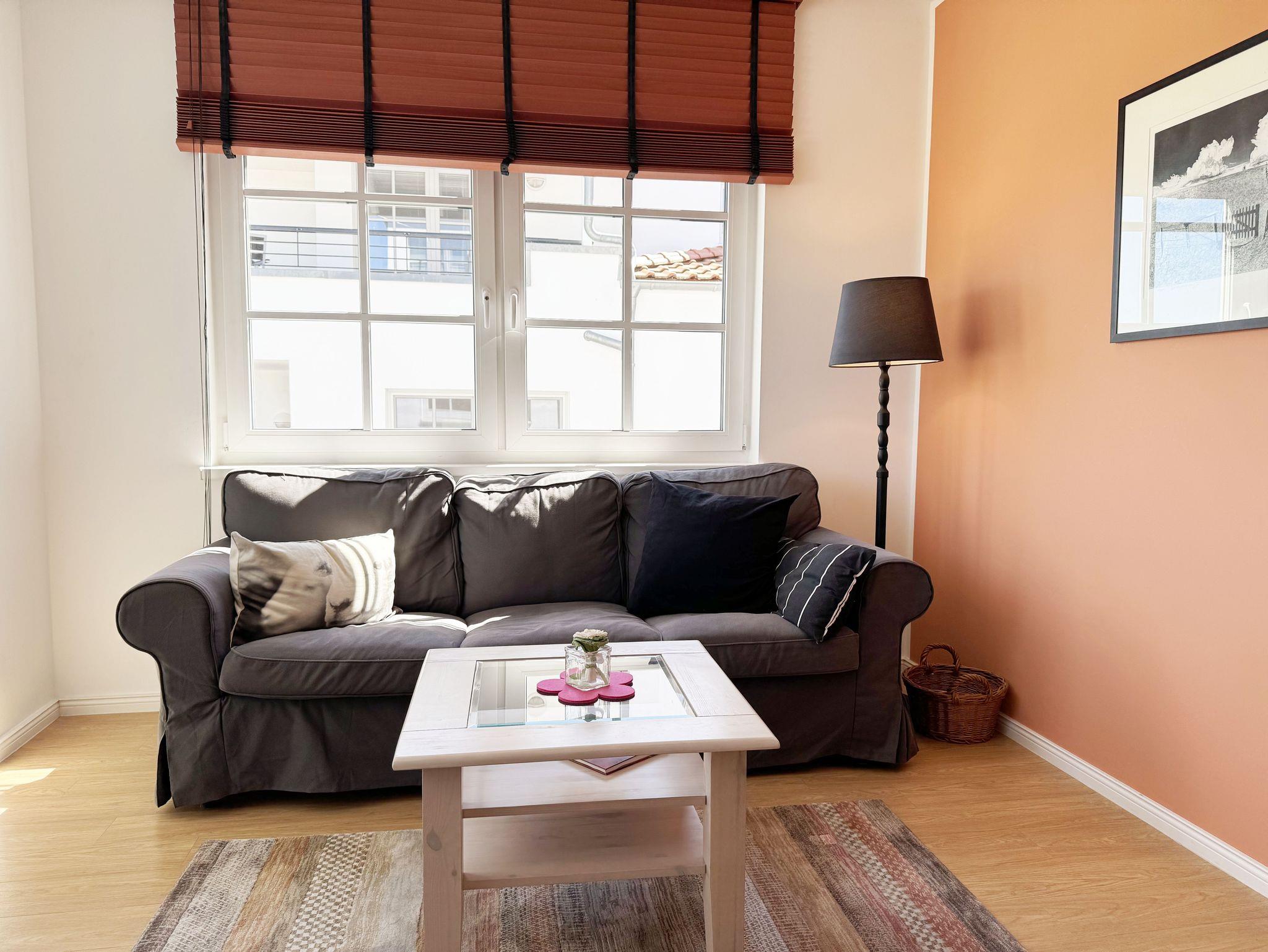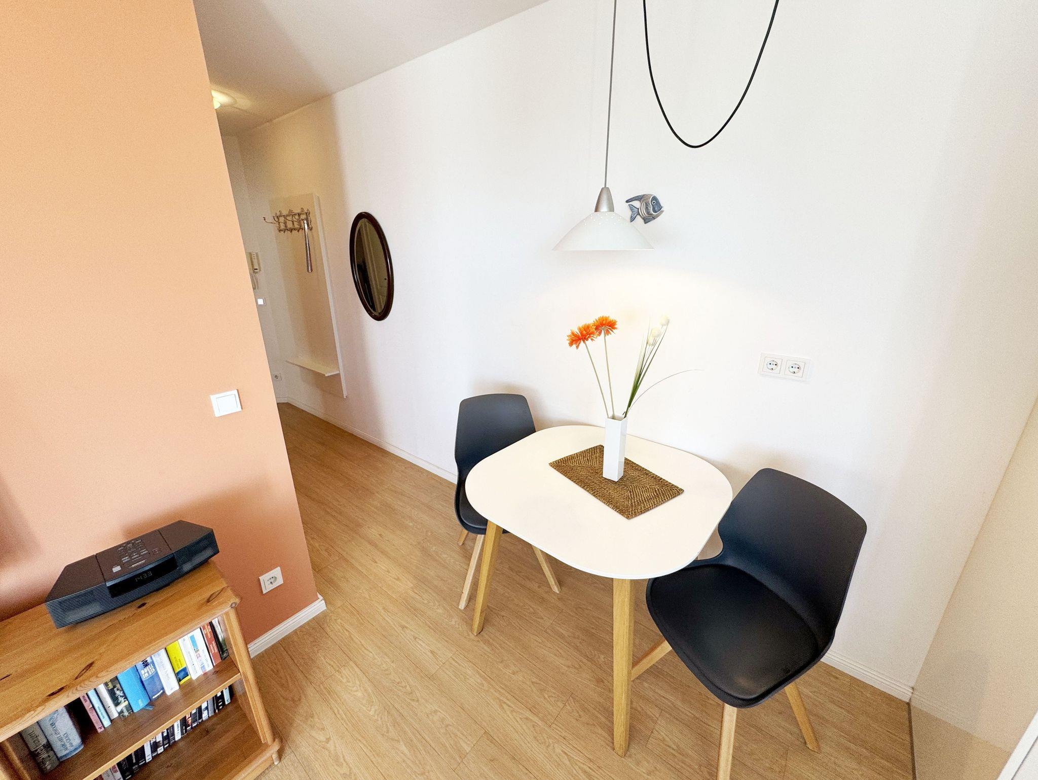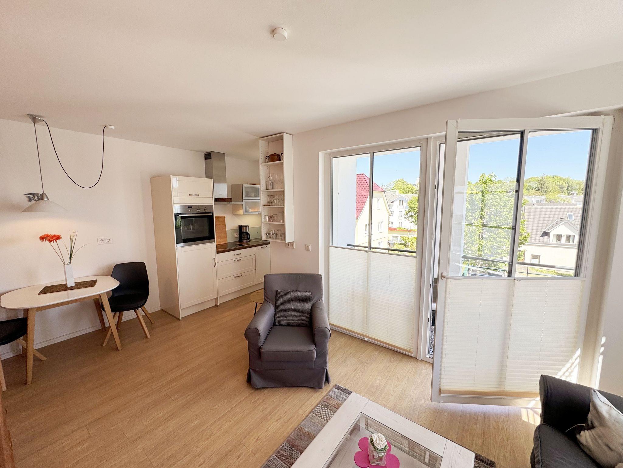 Moderne Ferienwohnung mit Balkon in der Villa Antje, zentral in Göhren, nahe Strand und Einkaufsmöglichkeiten.