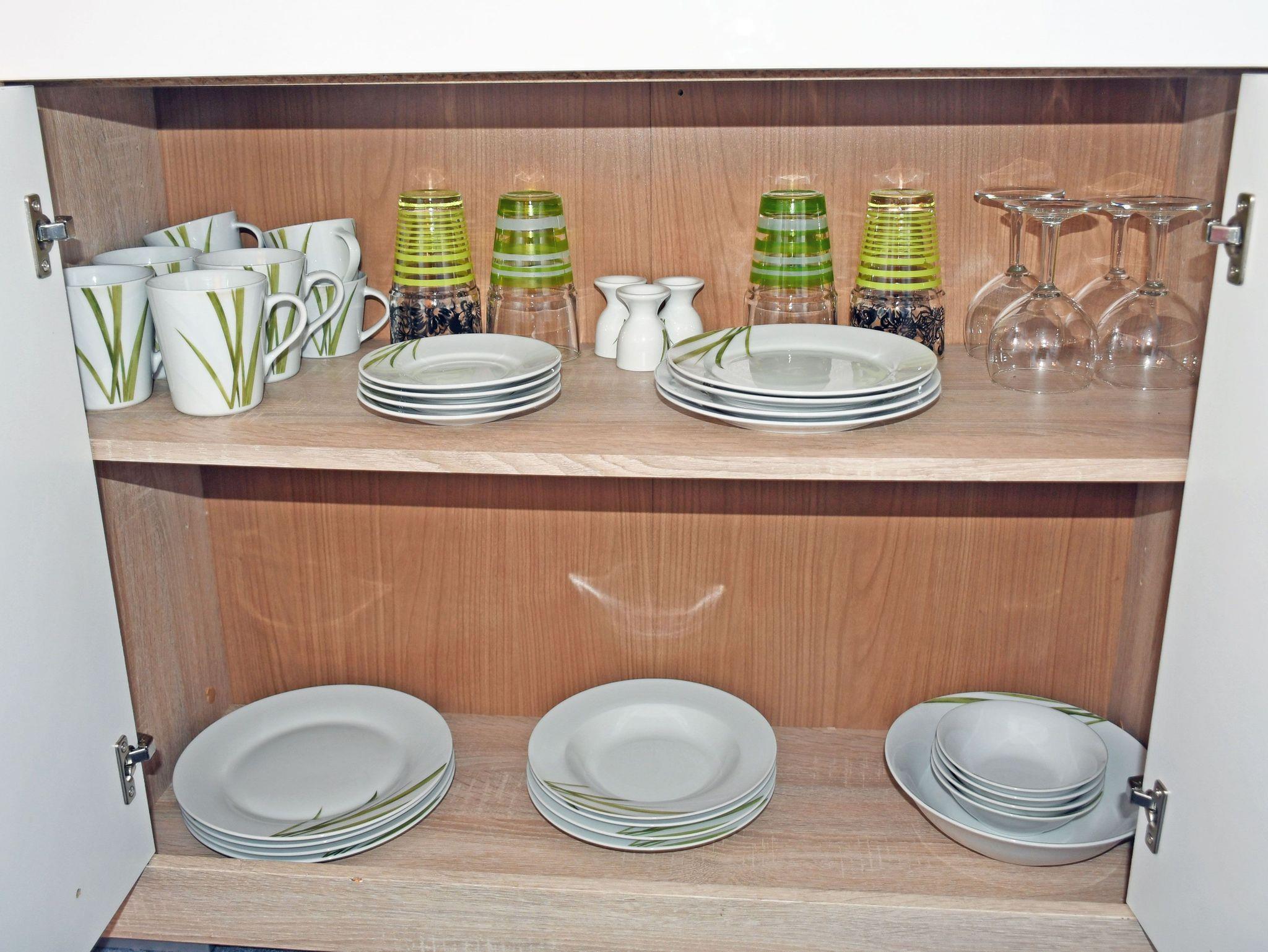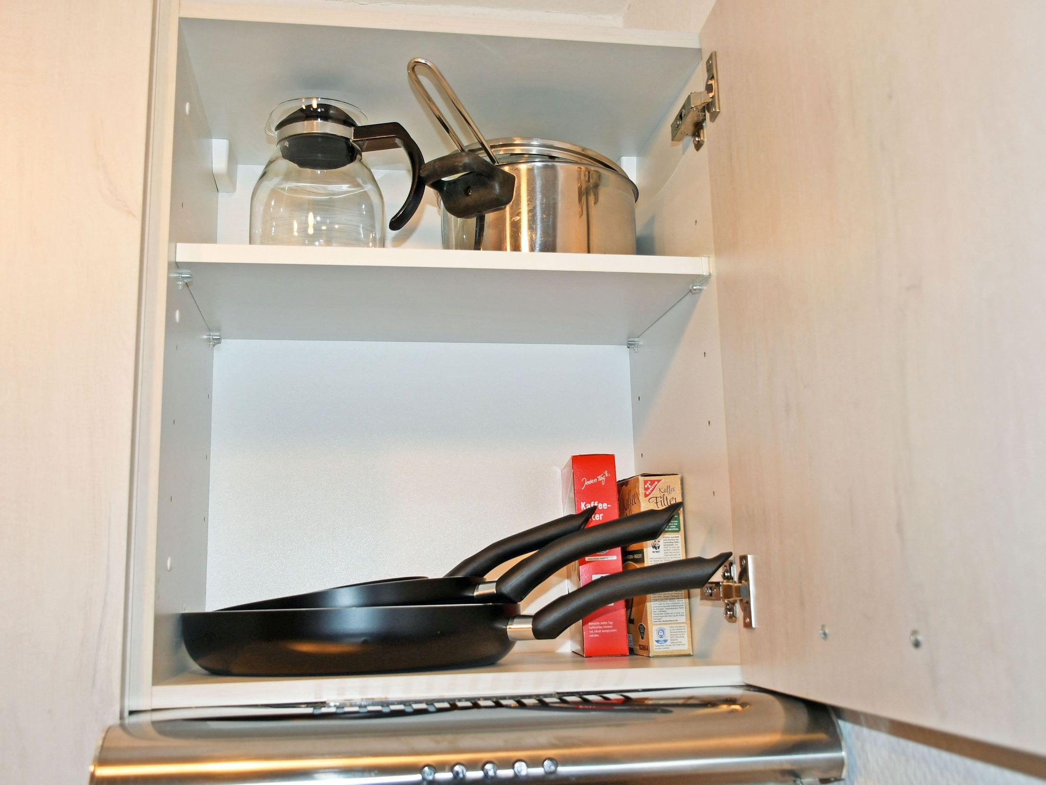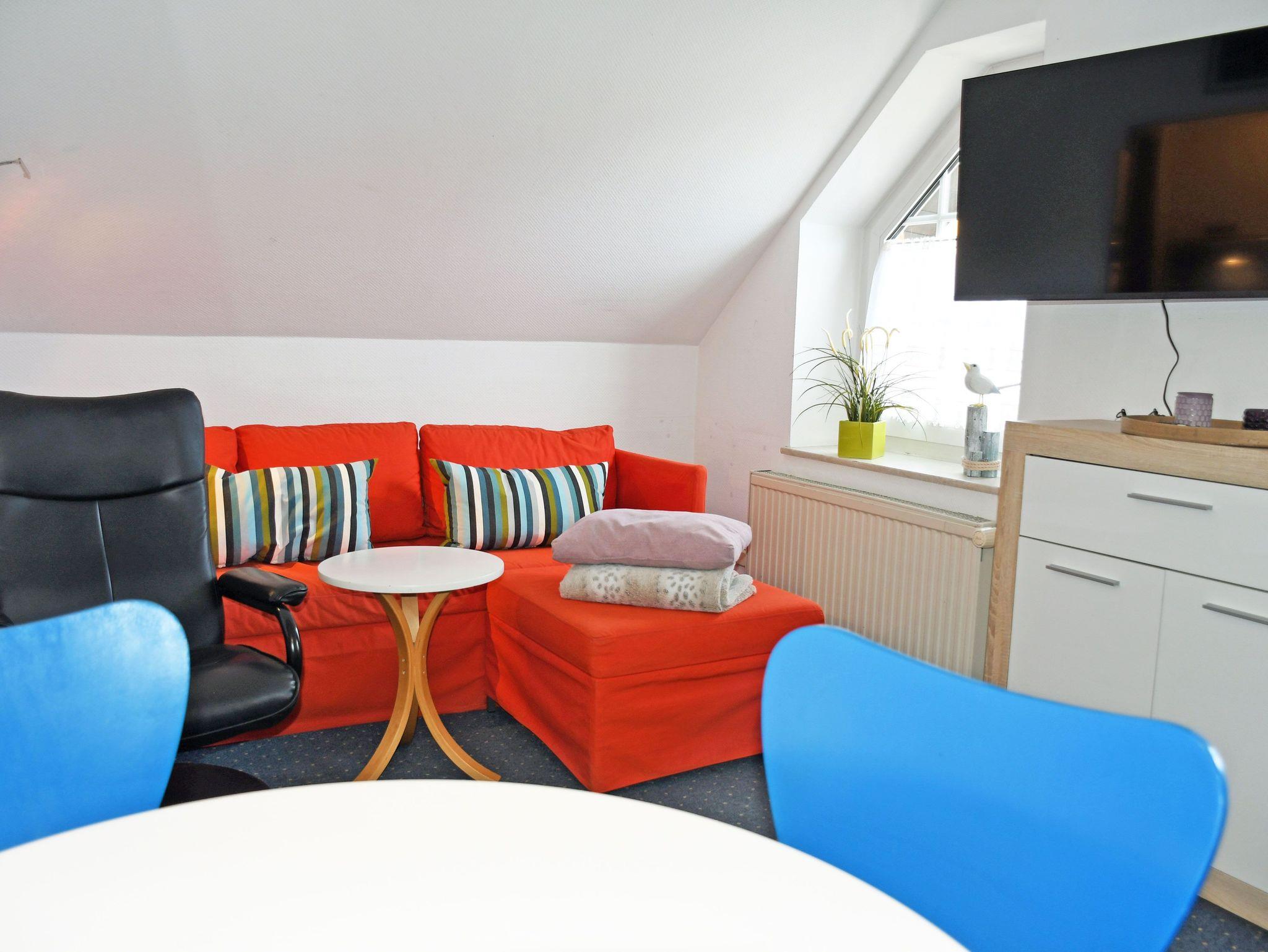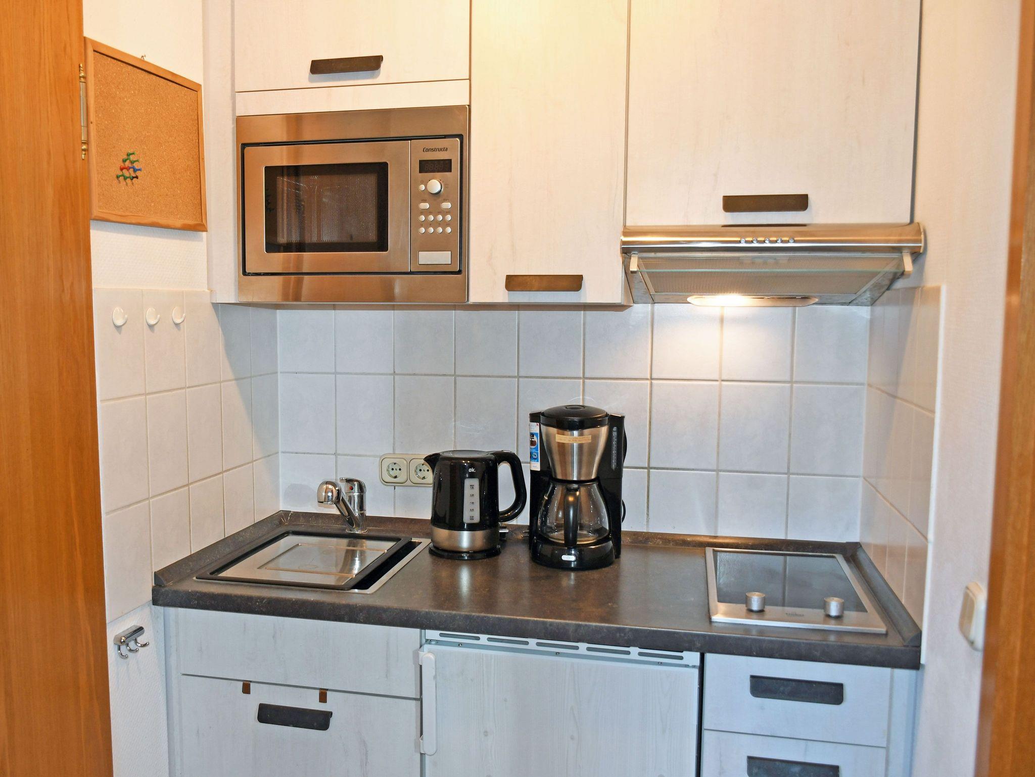 Der Wohnbereich ist offen gestaltet und mit einer zum Wohnzimmer offenen Küche verbunden. Ein Esstisch, eine Sofaecke, TV mit digitalem Anschluss sowie WLAN sorgen für Komfort im Alltag. Die Küche ist funktional ausgestattet und verfügt über einen 2-Platten-Herd, Kühlschrank mit Gefrierfach im Kühlschrank, Mikrowelle, Kaffeemaschine, Toaster, Wasserkocher, Küchenutensilien sowie Geschirr und Besteck. So können Sie sich unkompliziert selbst versorgen.