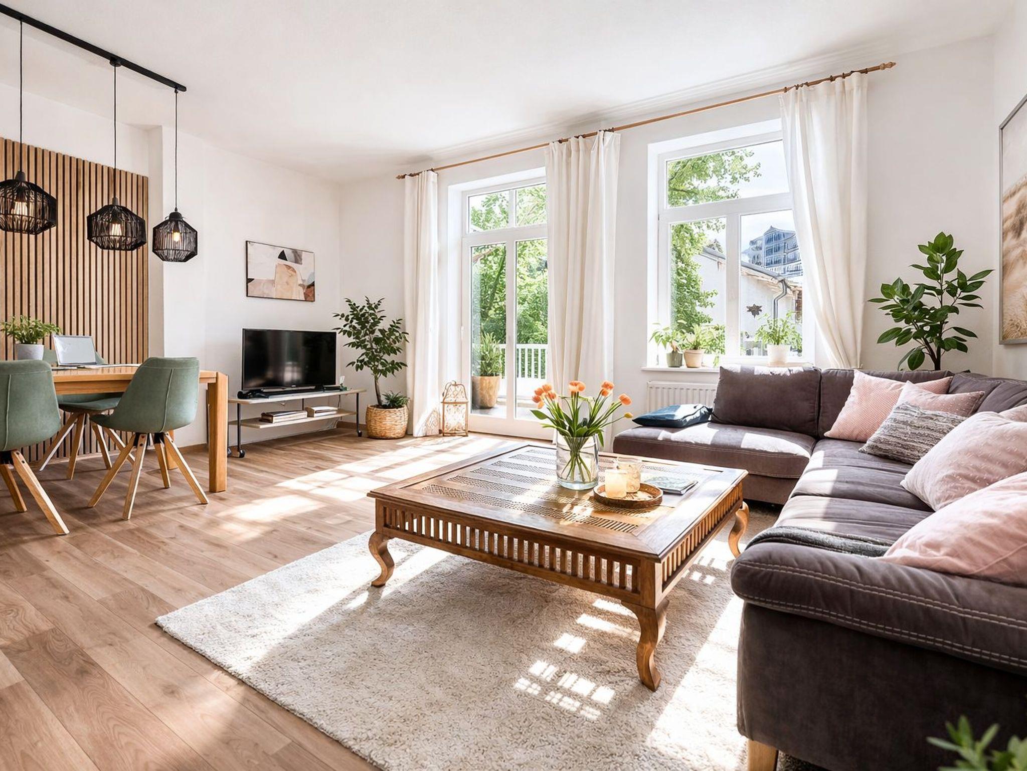 Die großzügige und sehr geräumige Wohnung bietet ein elegantes Schlafzimmer, ein lichtdurchflutetes Wohnzimmer sowie eine großzügigen Essbereich mit schwerem, einladendem Tisch ideal für gemeinsame Abende. Die Wohnbereiche verfügen über viele Fenster und schaffen so eine helle, offene Atmosphäre.