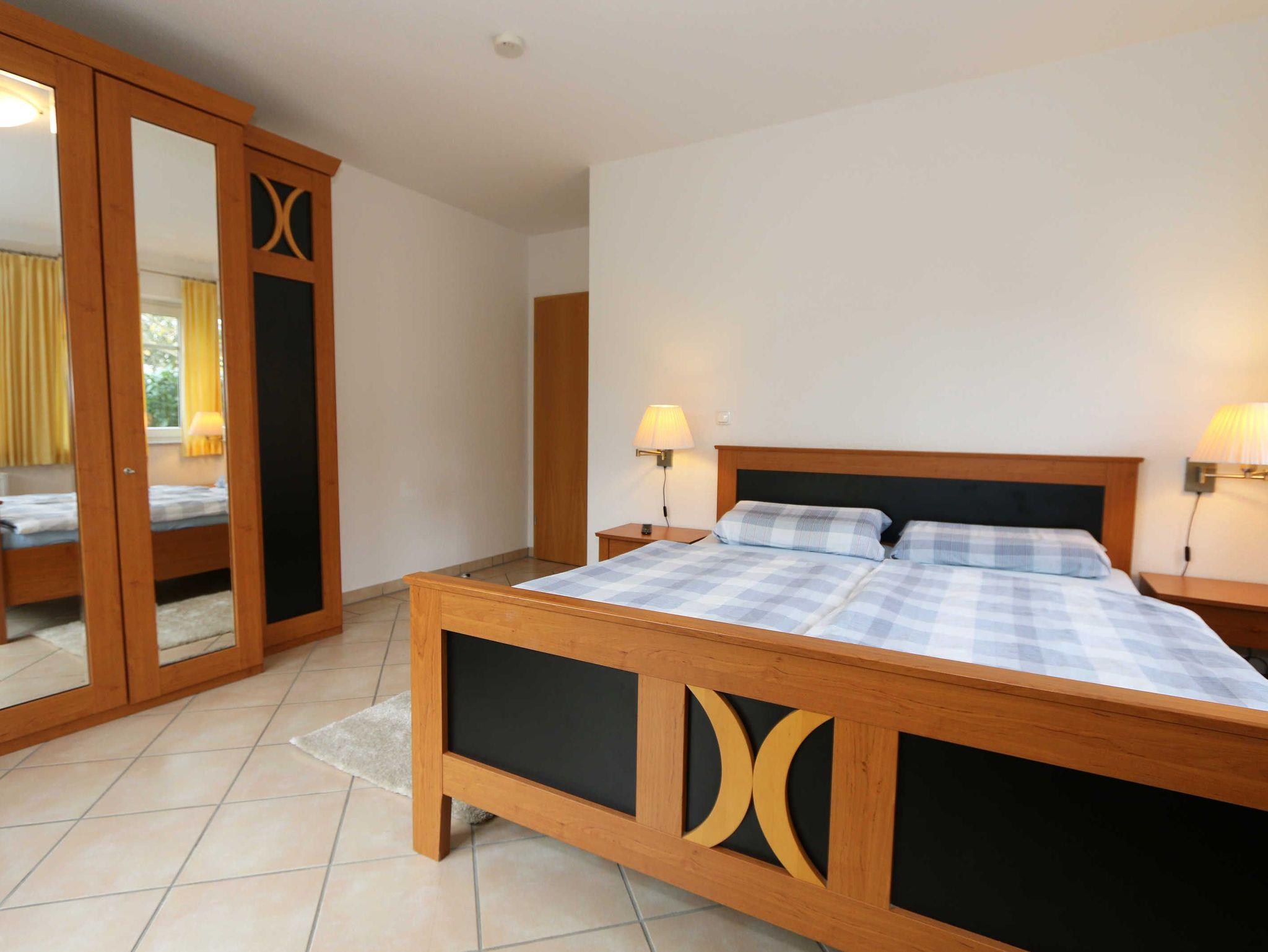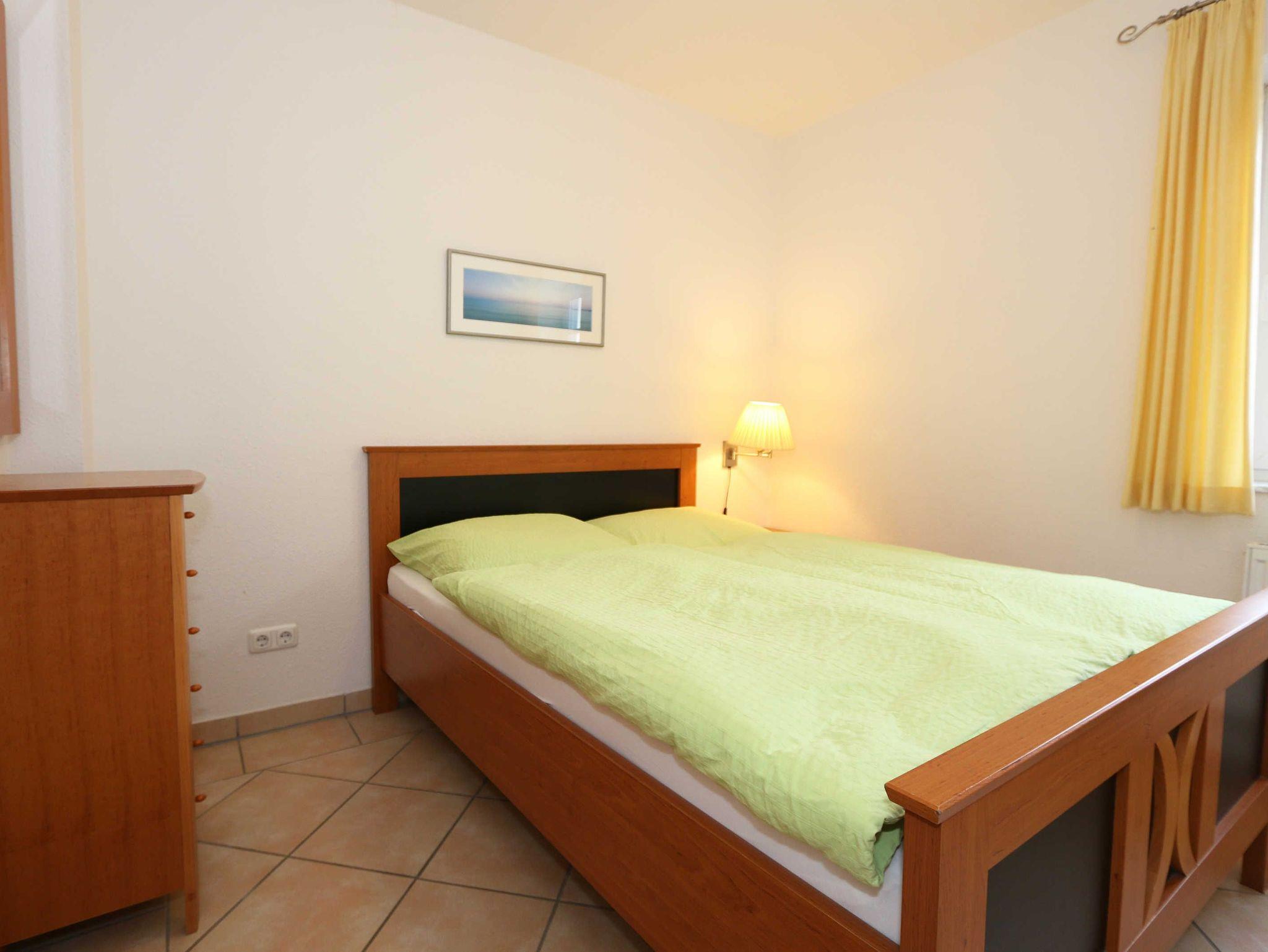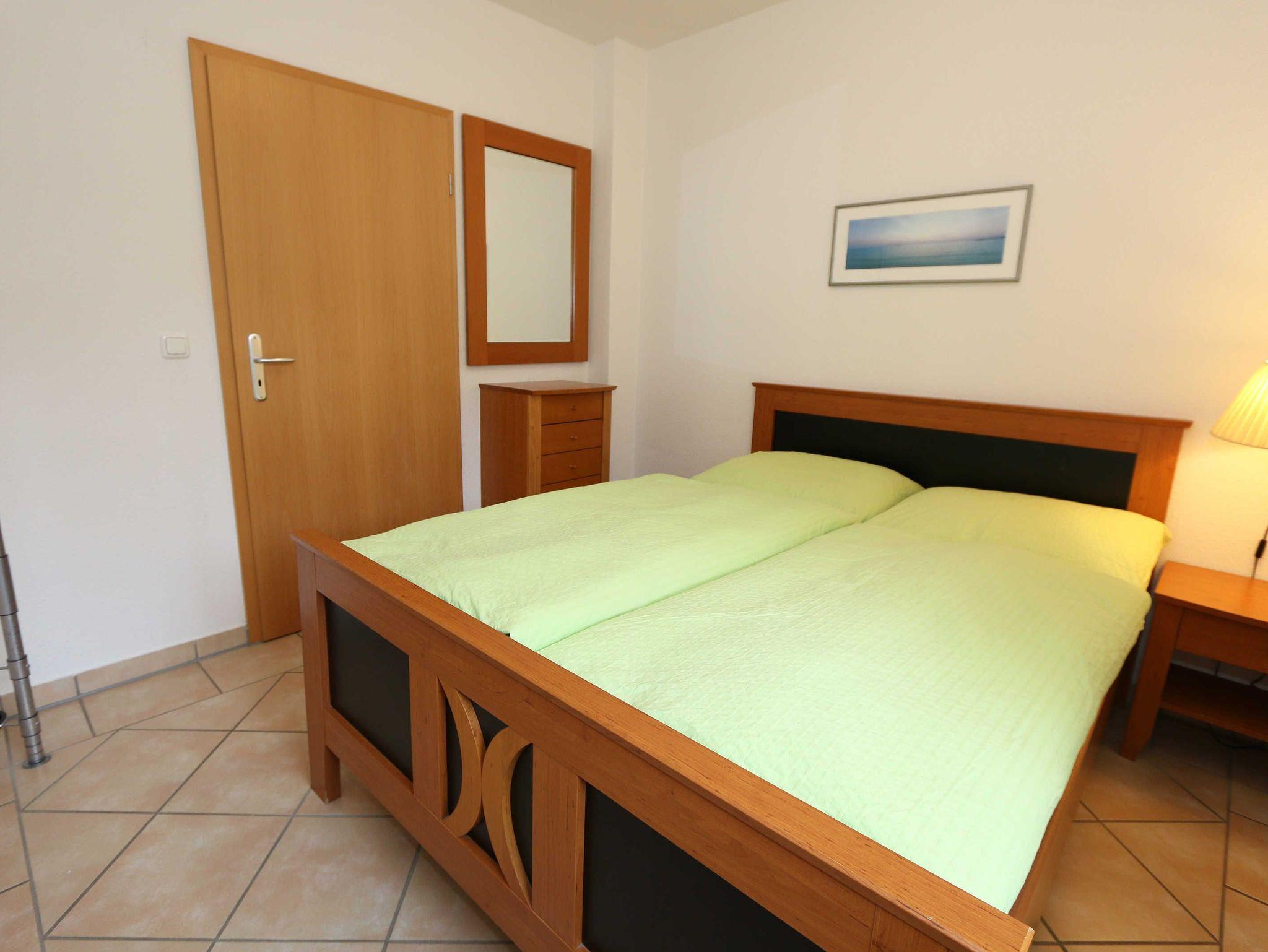 Die lichtdurchflutete, komfortable Nichtraucherwohnung verläuft auf über 61 m² und ist ideal für 2 bis 4 Personen geeignet. Ein Kleinkind (3 Jahre) im Kinderreisebett kann als Aufbettung (5. Person) untergebracht werden. Die beiden Terrassen (Richtung Osten und Süden) laden zum Verweilen ein und erlauben es Ihnen den ganzen Tag die mitwandernde Sonne zu genießen. Der kombinierte Wohn- und Essbereich ist mit einer hellen Küchenzeile ausgestattet. Die Küchenzeile beinhaltet ein Ceranfeld, Backofen, Geschirrspüler, Mikrowelle, Kühlschrank mit Gefrierfach, Kaffeemaschine, Senseo Kaffeeautomat, Toaster, Wasserkocher sowie diverse Küchenutensilien. Der dazugehörige Essbereich umfasst einen Esstisch mit 4 Stühlen. Ein Wohnbereich mit Sofa, Sessel, Couchtisch, Vitrine, Leselampe, Flatscreen-TV mit DVD-Player, Stereoanlage mit CD-Player sowie eine kleine Auswahl an Gesellschaftsspielen runden das Ganze ab. Das 1. Schlafzimmer ist mit einem Doppelbett (1,80 m x 2,00 m), verstellbaren Lattenrosten, 2 Nachtschränken, einen Flachbild-TV und Kleiderschrank ausgestattet. Von hier aus haben Sie Blick auf das Naturschutzgebiet. Das 2. Schlafzimmer verfügt ebenfalls über ein Doppelbett (1,60 m x 2,00 m) und 2 Nachtschränke sowie eine Kommode. Für einen ruhigen Schlaf sorgen in beiden Schlafzimmern Rollläden. Das Bad ist mit einer Dusche mit flachem Einstieg, Fön, WC und Waschtisch ausgestattet. Auch im Urlaub brauchen Sie auf einen Internetzugang (WLAN über Hotspot) in Ihrer Wohnung nicht zu verzichten. Dieser ist inklusive. 1x Kinderreisebett (ohne Matratze und Bett Inlett) ist für unsere kleinen Gäste inklusive. Ein Hochstuhl kann gegen eine Extragebühr dazu gebucht werden. 1 Haustier ist mit seinem eigenen Schlafplatz ein gern gesehener Gast. In einem Gemeinschaftsraum können Sie gegen einen Aufpreis eine Waschmaschine und einen Trockner nutzen. Der Parkplatz (Nr. 1) befindet sich direkt auf dem Grundstück. Ihre Fahrräder können Sie auf dem Areal in einen Fahrradschuppen unterstellen. Ein Gemeinschaftsgrillplatz mit massiven Holzbänken und Standgrill ist vorhanden. Die Erstausstattung eines Wäschepaketes (komplette Bettwäsche, 1 Duschhandtuch, 2 kleine Handtücher) können Sie bis 14 Tage vor Anreise gegen einen Aufpreis dazu buchen oder durch eigene ergänzen. Ab 2 gebuchten Paketen erhalten Sie einmalig 1 Geschirrhandtuch und 1 Duschvorleger hinzu.