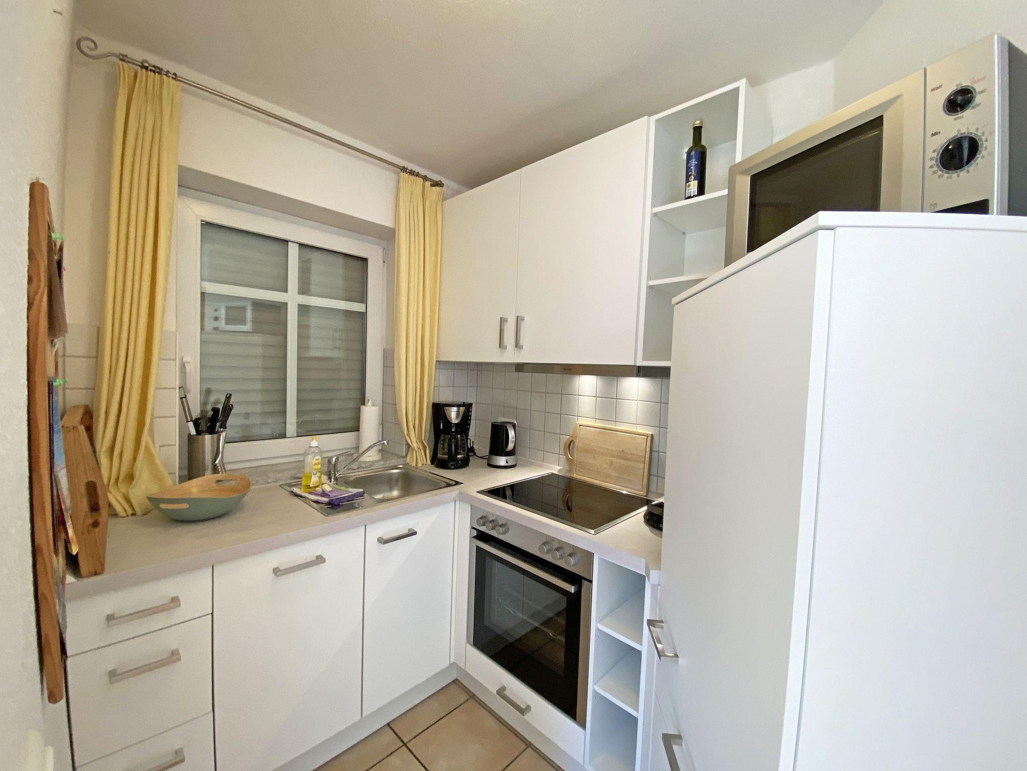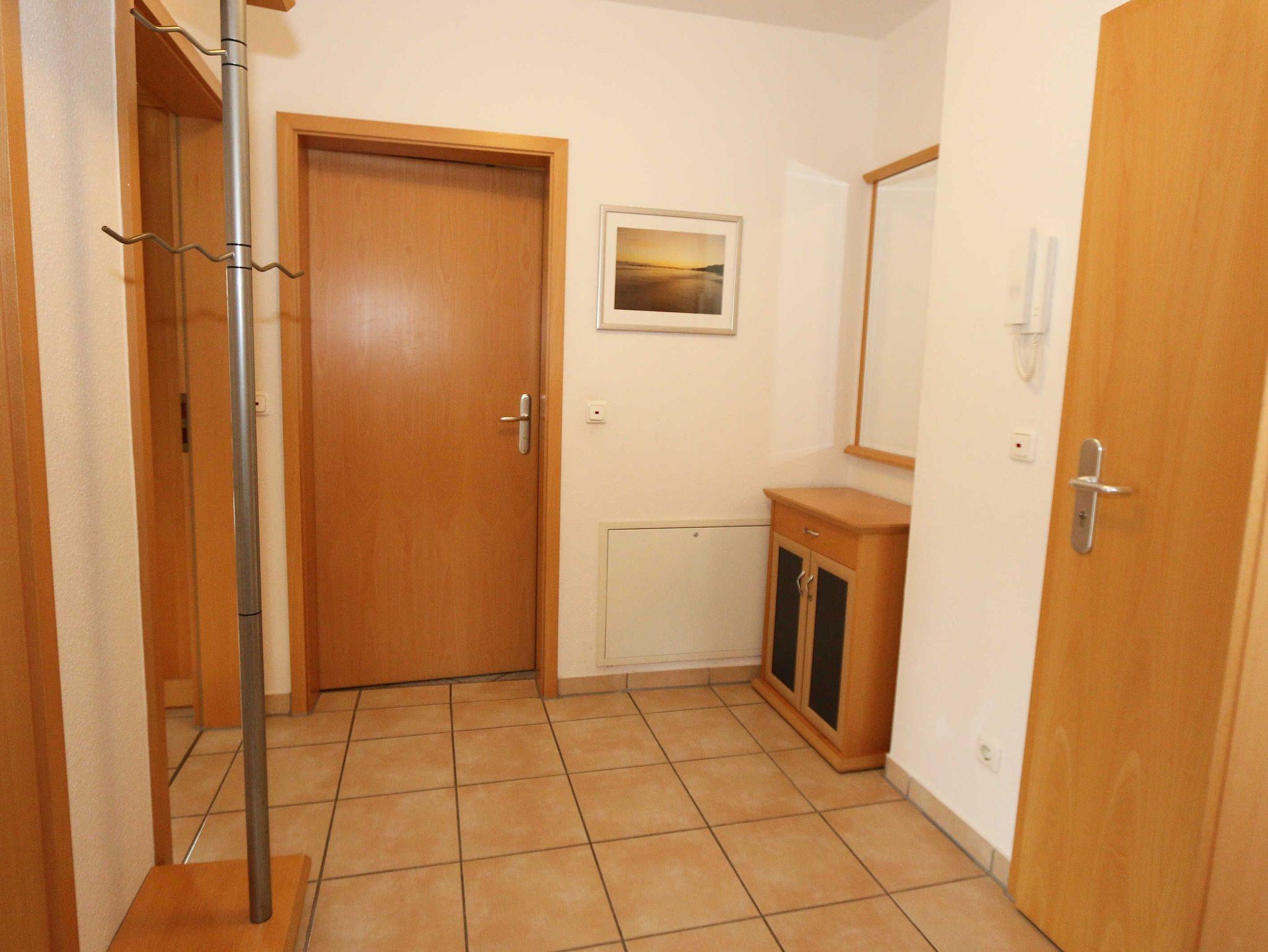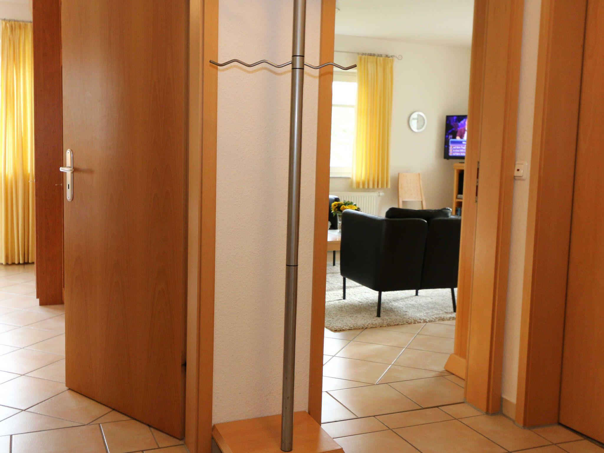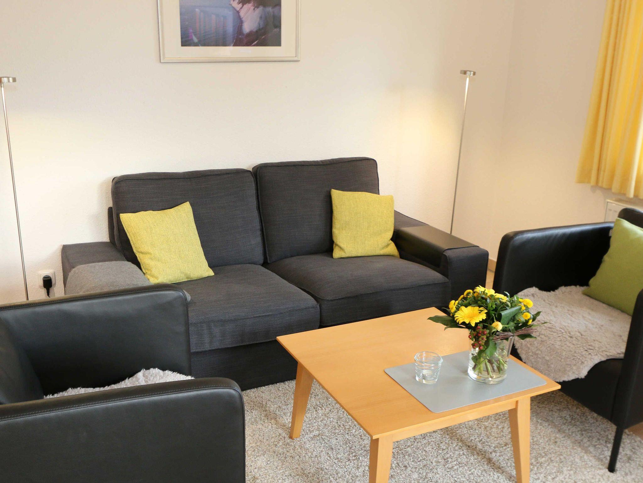 Die lichtdurchflutete, komfortable Nichtraucherwohnung verläuft auf über 61 m² und ist ideal für 2 bis 4 Personen geeignet. Ein Kleinkind (3 Jahre) im Kinderreisebett kann als Aufbettung (5. Person) untergebracht werden. Die beiden Terrassen (Richtung Osten und Süden) laden zum Verweilen ein und erlauben es Ihnen den ganzen Tag die mitwandernde Sonne zu genießen. Der kombinierte Wohn- und Essbereich ist mit einer hellen Küchenzeile ausgestattet. Die Küchenzeile beinhaltet ein Ceranfeld, Backofen, Geschirrspüler, Mikrowelle, Kühlschrank mit Gefrierfach, Kaffeemaschine, Senseo Kaffeeautomat, Toaster, Wasserkocher sowie diverse Küchenutensilien. Der dazugehörige Essbereich umfasst einen Esstisch mit 4 Stühlen. Ein Wohnbereich mit Sofa, Sessel, Couchtisch, Vitrine, Leselampe, Flatscreen-TV mit DVD-Player, Stereoanlage mit CD-Player sowie eine kleine Auswahl an Gesellschaftsspielen runden das Ganze ab. Das 1. Schlafzimmer ist mit einem Doppelbett (1,80 m x 2,00 m), verstellbaren Lattenrosten, 2 Nachtschränken, einen Flachbild-TV und Kleiderschrank ausgestattet. Von hier aus haben Sie Blick auf das Naturschutzgebiet. Das 2. Schlafzimmer verfügt ebenfalls über ein Doppelbett (1,60 m x 2,00 m) und 2 Nachtschränke sowie eine Kommode. Für einen ruhigen Schlaf sorgen in beiden Schlafzimmern Rollläden. Das Bad ist mit einer Dusche mit flachem Einstieg, Fön, WC und Waschtisch ausgestattet. Auch im Urlaub brauchen Sie auf einen Internetzugang (WLAN über Hotspot) in Ihrer Wohnung nicht zu verzichten. Dieser ist inklusive. 1x Kinderreisebett (ohne Matratze und Bett Inlett) ist für unsere kleinen Gäste inklusive. Ein Hochstuhl kann gegen eine Extragebühr dazu gebucht werden. 1 Haustier ist mit seinem eigenen Schlafplatz ein gern gesehener Gast. In einem Gemeinschaftsraum können Sie gegen einen Aufpreis eine Waschmaschine und einen Trockner nutzen. Der Parkplatz (Nr. 1) befindet sich direkt auf dem Grundstück. Ihre Fahrräder können Sie auf dem Areal in einen Fahrradschuppen unterstellen. Ein Gemeinschaftsgrillplatz mit massiven Holzbänken und Standgrill ist vorhanden. Die Erstausstattung eines Wäschepaketes (komplette Bettwäsche, 1 Duschhandtuch, 2 kleine Handtücher) können Sie bis 14 Tage vor Anreise gegen einen Aufpreis dazu buchen oder durch eigene ergänzen. Ab 2 gebuchten Paketen erhalten Sie einmalig 1 Geschirrhandtuch und 1 Duschvorleger hinzu.