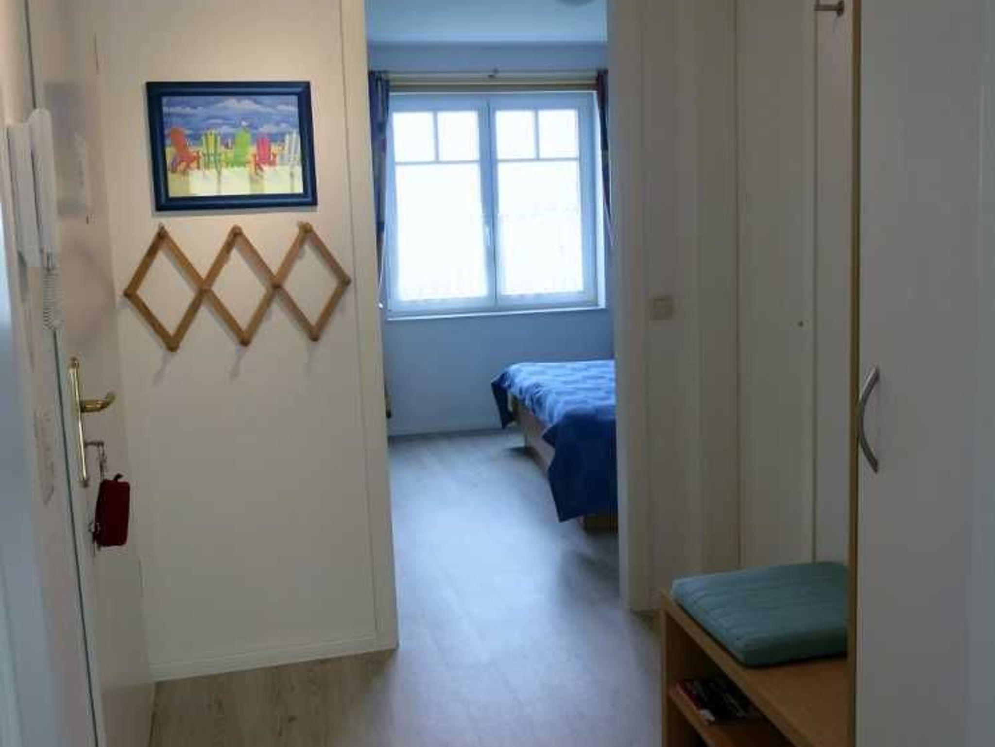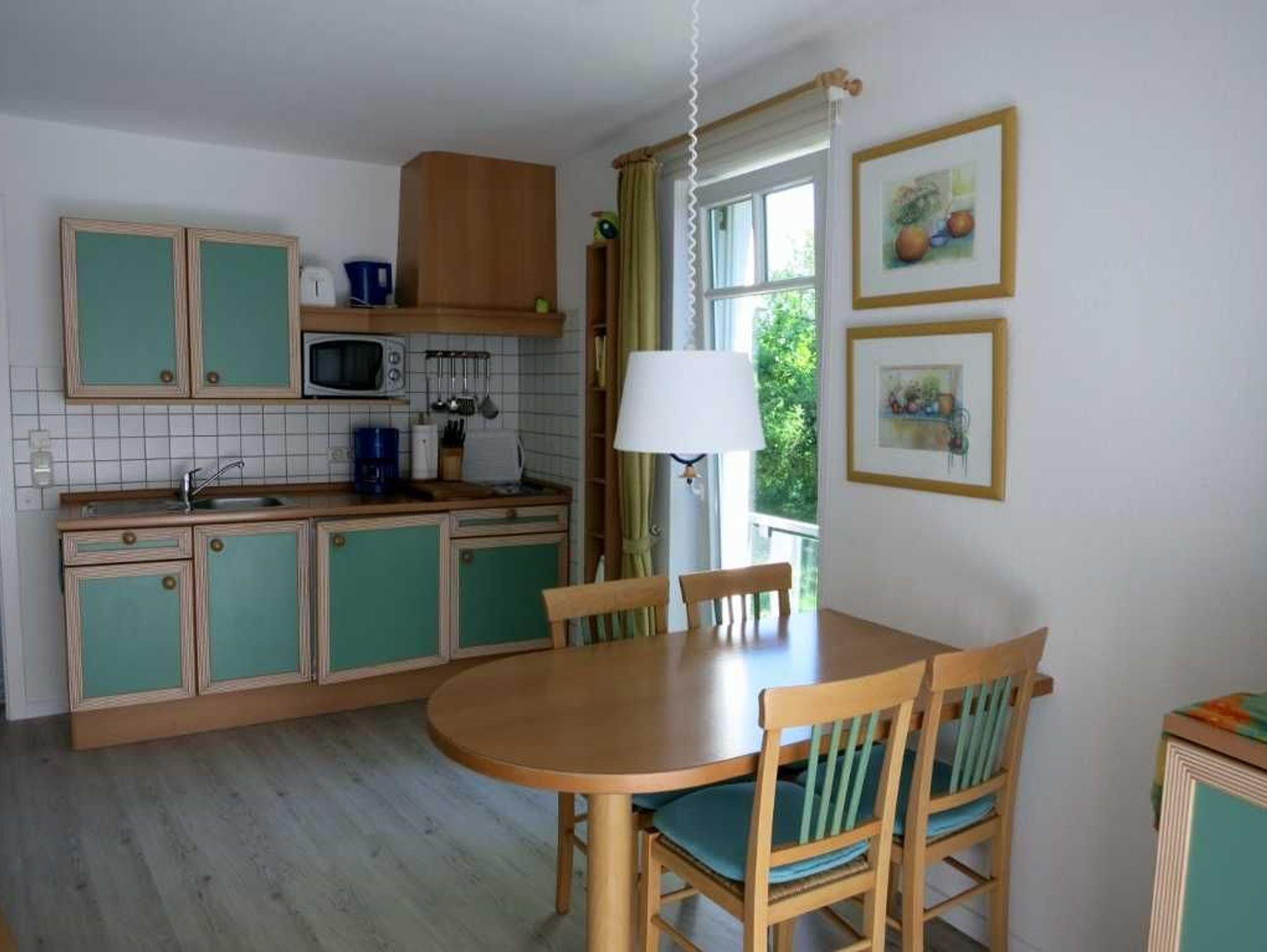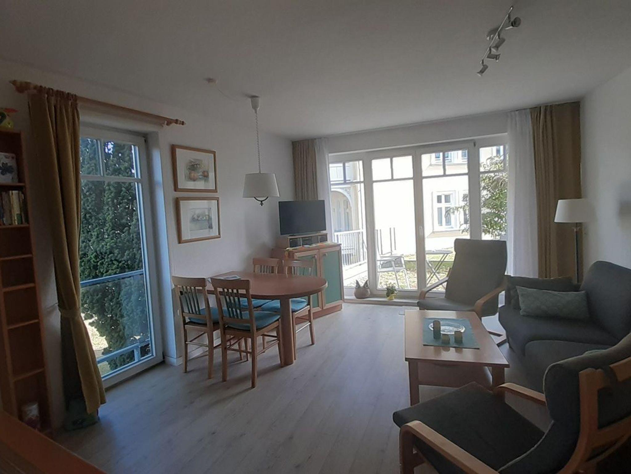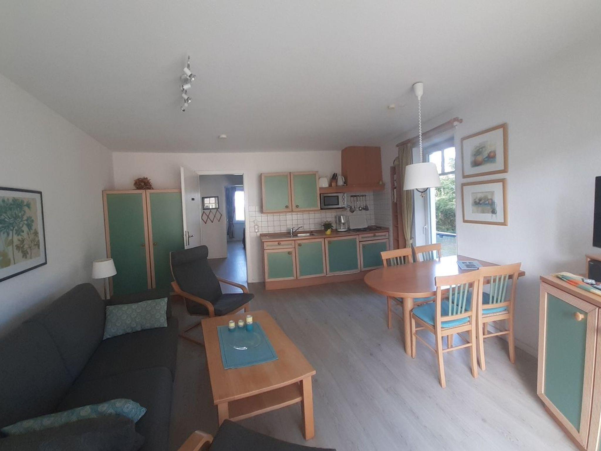 Die helle 2-Zimmer-Nichtraucherwohnung mit Fußbodenheizung ist modern und bequem eingerichtet. Als Hochparterre - Außenwohnung verfügt sie über eine nach Sueden ausgerichtete Terrasse mit Blick auf die Gartenanlage. Einen ganzjährigen Panoramablick auf die Ostsee haben Sie vom geräumigen Schlafzimmer mit Doppelbett. In den Wohnbereich harmonisch integriert ist eine komplett eingerichtete Küchenzeile mit Grillmikrowelle, Toaster, Kaffeemaschine, 4-Platten-Kochfeld etc. Auch von der kleinen Essecke aus schauen Sie durch ein raumhohes Fenster ins Grüne. Im Wohnbereich mit 2 Schwingsesseln und einer Couch (zum Doppelbett aufklappbar) finden 4 Personen bequeme Sitzmöglichkeiten. Ein Smart-TV und eine kleine hochwertige Stereoanlage vervollständigen die Ausstattung. Das ca. 4m² große, weiß geflieste Bad ist mit Dusche und WC ausgestattet. Viel Ablagefläche und ein Föhn sind vorhanden. Im Abstellraum neben der Diele finden Sie u.a. auch die Terrassenmöbel.