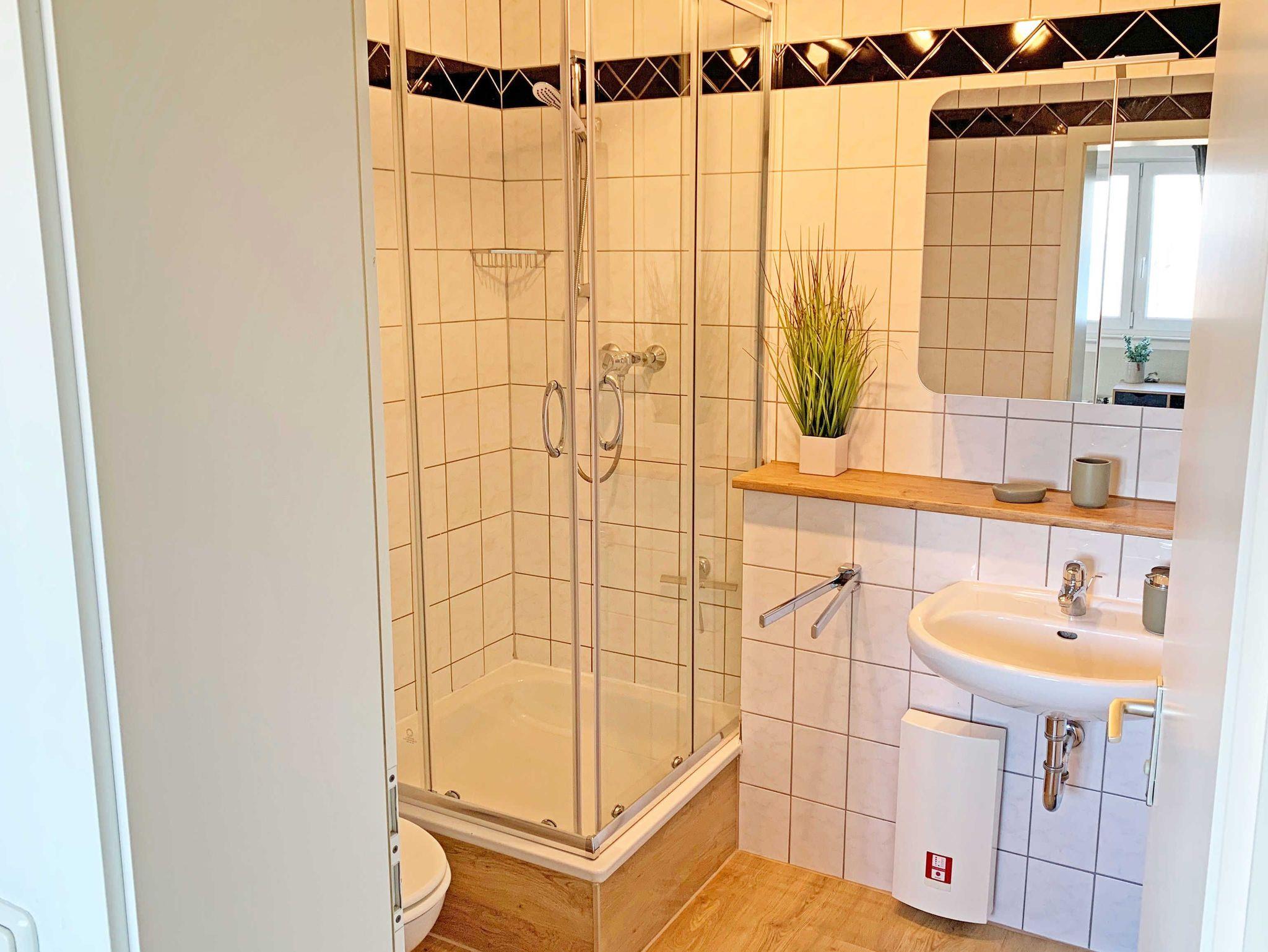 Das Bad ist mit Dusche, WC und Waschtisch ausgestattet.