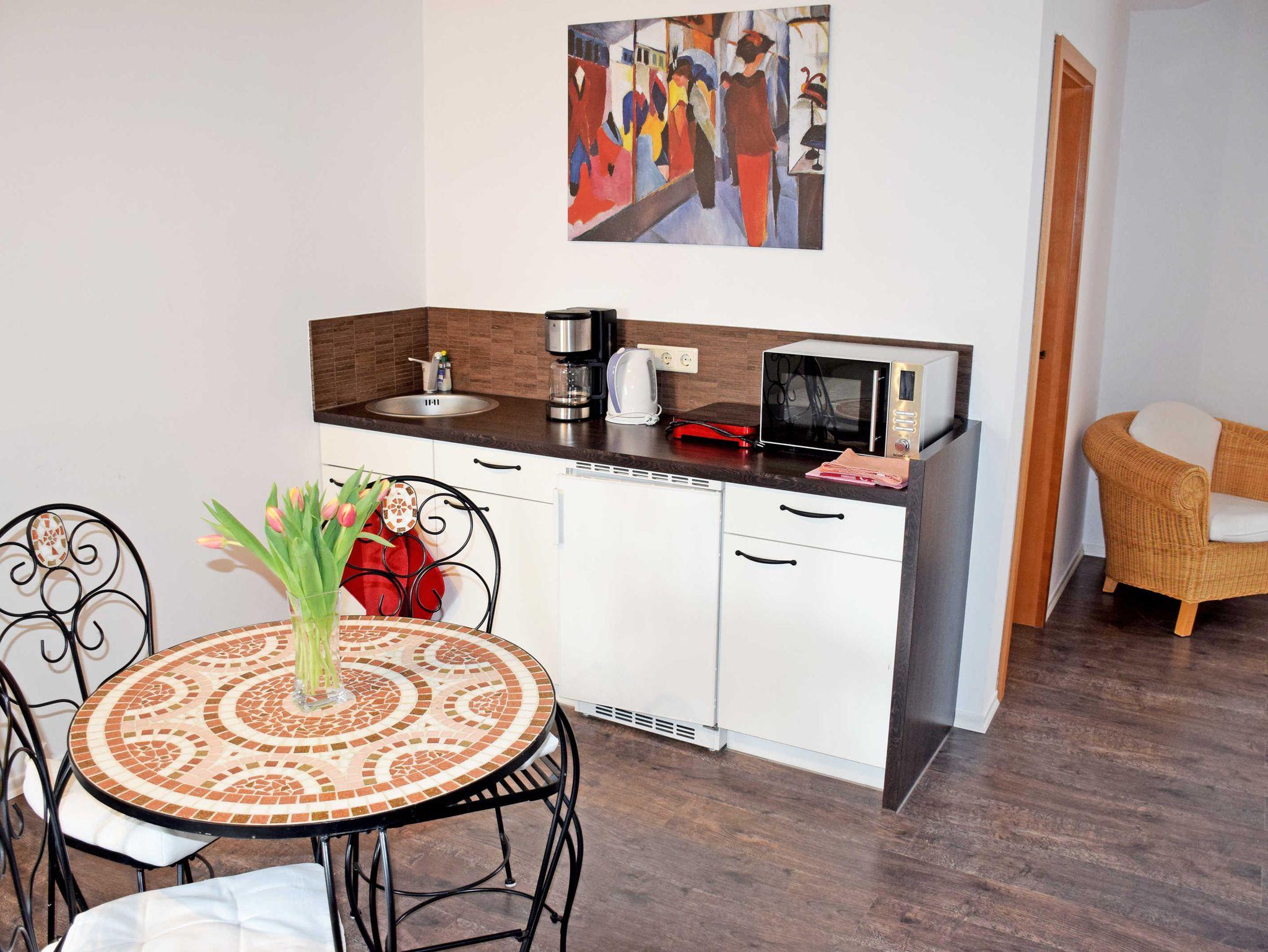 Unser 1- Raum Appartement ist für 3 Personen geeignet und ist ca. 42 m² groß. Es befindet sich im Obergeschoss. Es erwartet Sie in einem sehr gemütlichen Ambiente ein Wohnschlafraum mit einem Doppelbett, einem Einzelbett, einer Pantry mit Kühlschrank und Spüle, eine Induktionskochplatte (geeignet zum Kochen von Kleinigkeiten, nicht zum Braten) mit einem Topf, Kaffeemaschine, Wasserkocher, Mikrowelle mit Grill, Toaster, Sat-TV (Flachbild), Dusche und WC. Fliegengitter schützen Sie vor unliebsamen Eindringlingen.