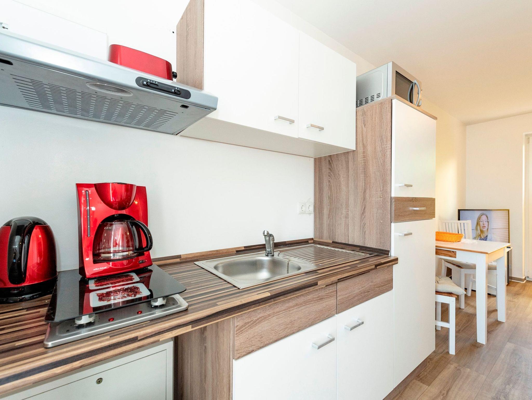 * kombinierter Wohn-/Schlafraum mit kleiner, integrierter Küchenzeile ausgestattet mit: 2-Platten-Ceran-Kochfeld, Dunstabzugshaube, kleiner Kühlschrank mit Gefrierfach, Spüle, Toaster, Kaffeemaschine, Wasserkocher, diverse Küchenutensilien