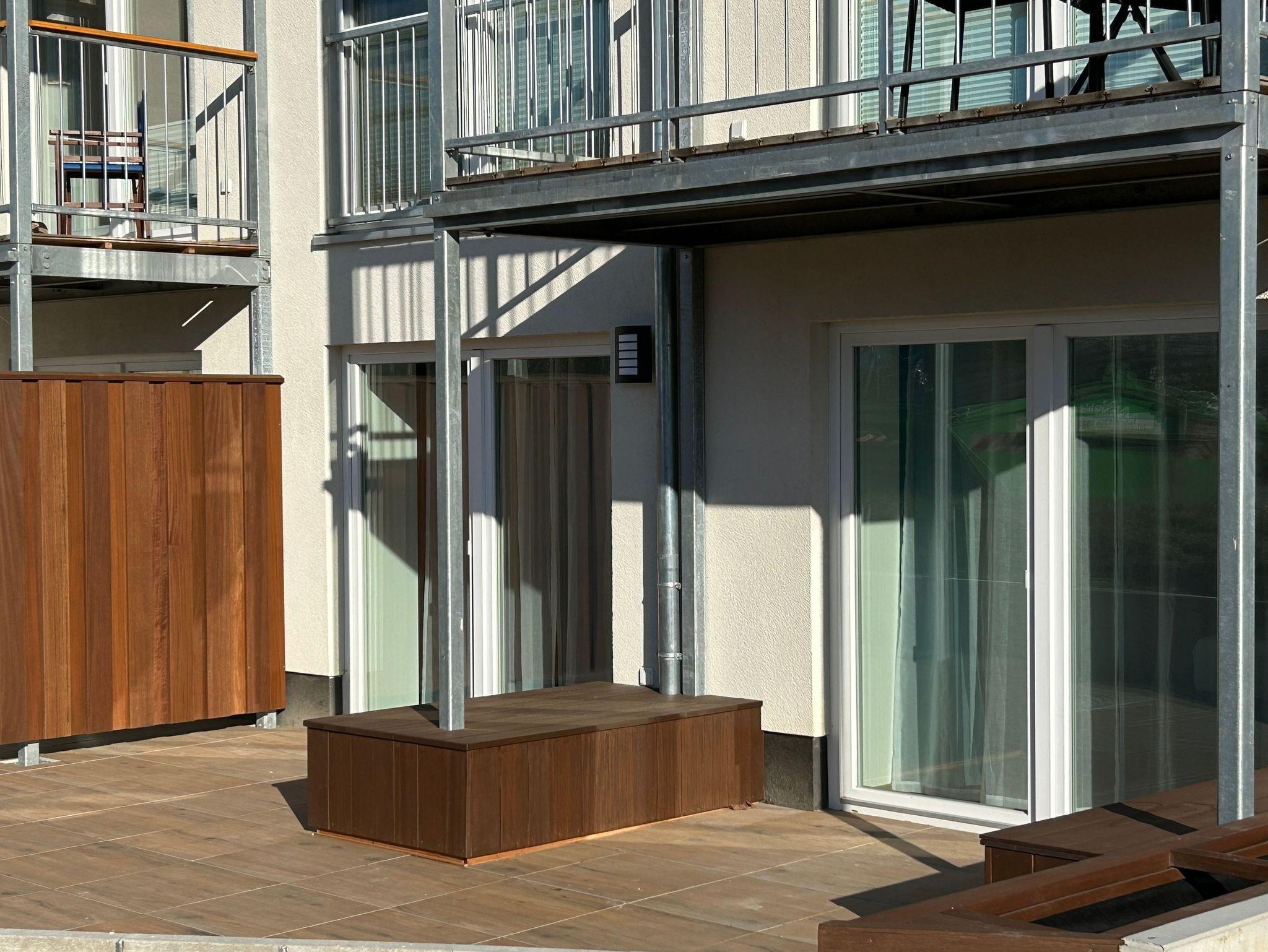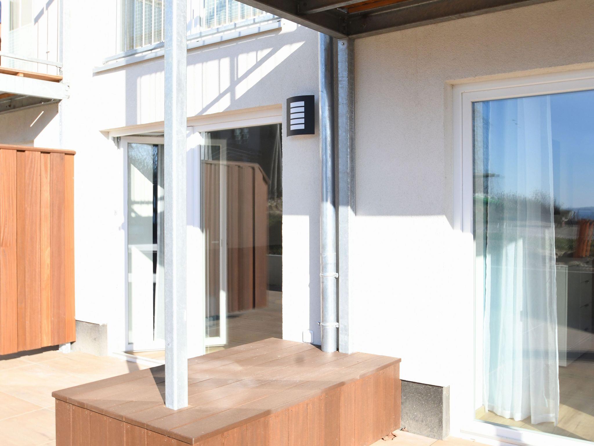 Sowie vom Wohnzimmer als auch vom Schlafzimmer aus gelangen Sie auf die grosse Terrasse.